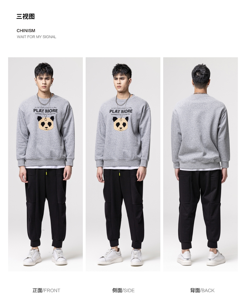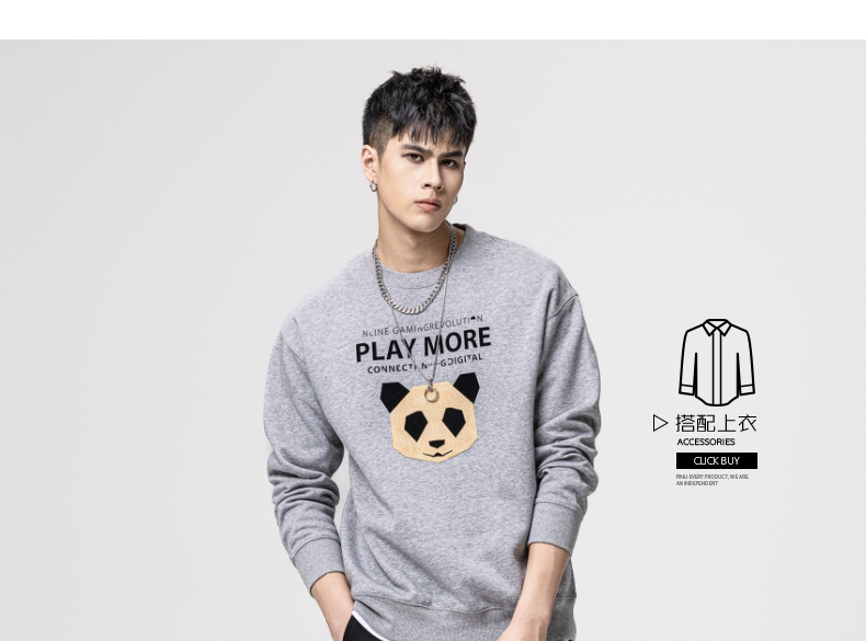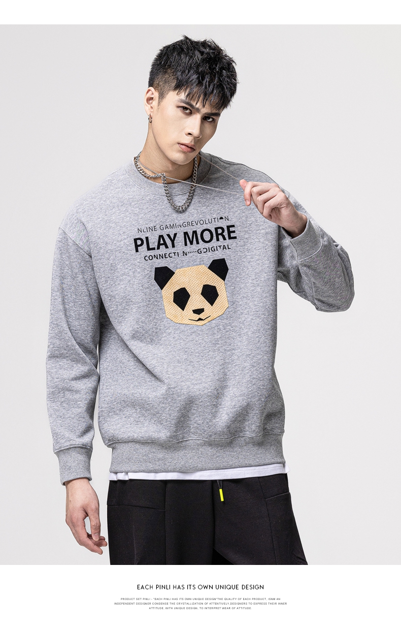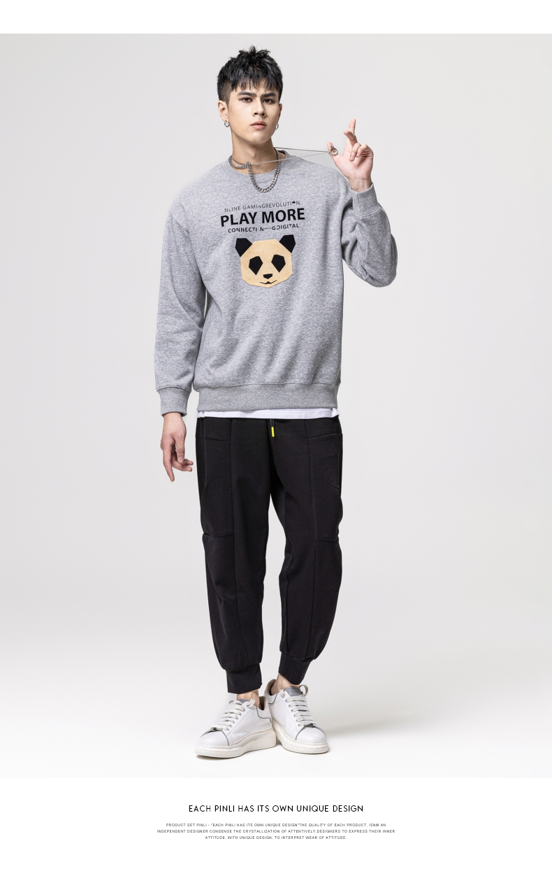 PINLI品立秋冬新款熊猫植绒套头卫衣男士印花圆领长袖上衣潮BG223209013