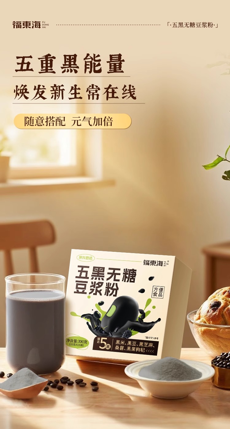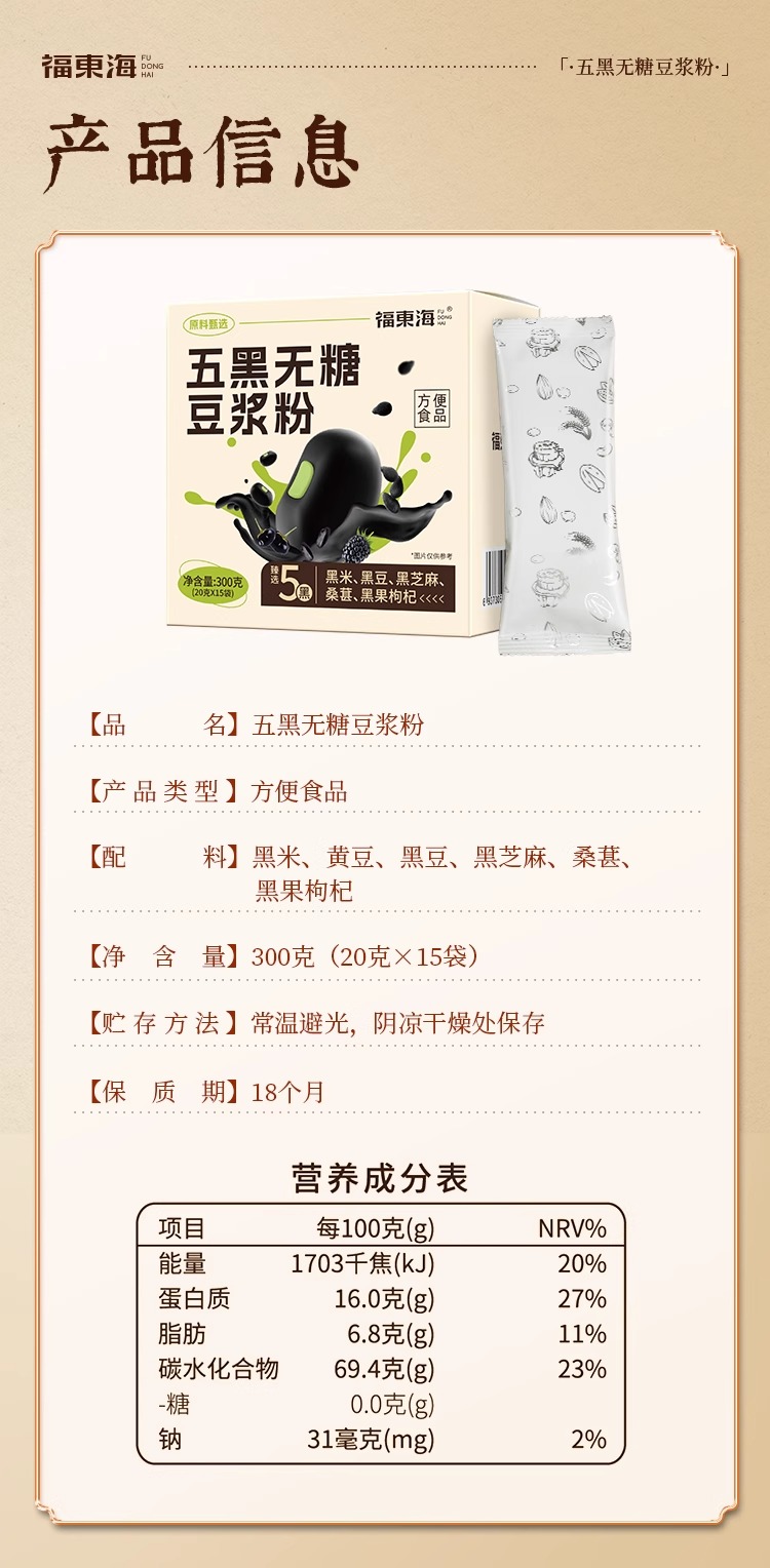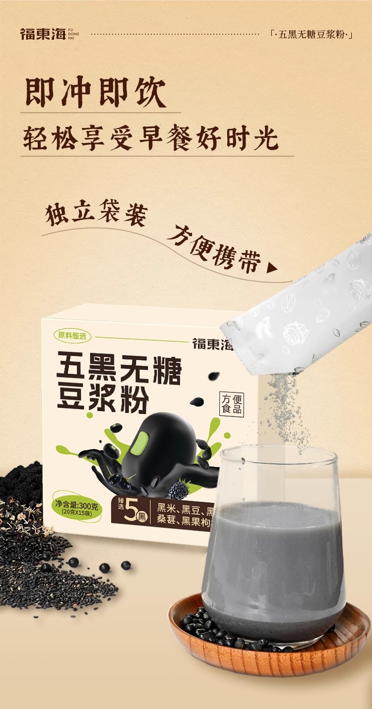 福东海 五黑无糖豆浆粉300g 控糖糖友推荐早餐冲泡独立袋装