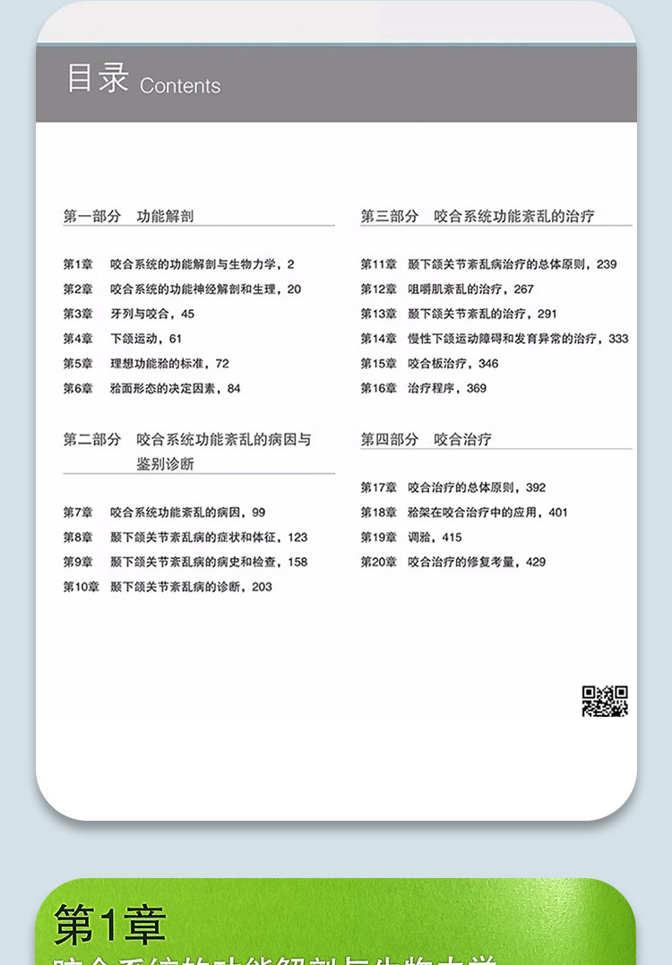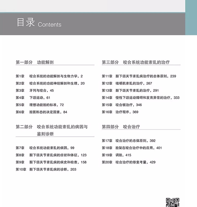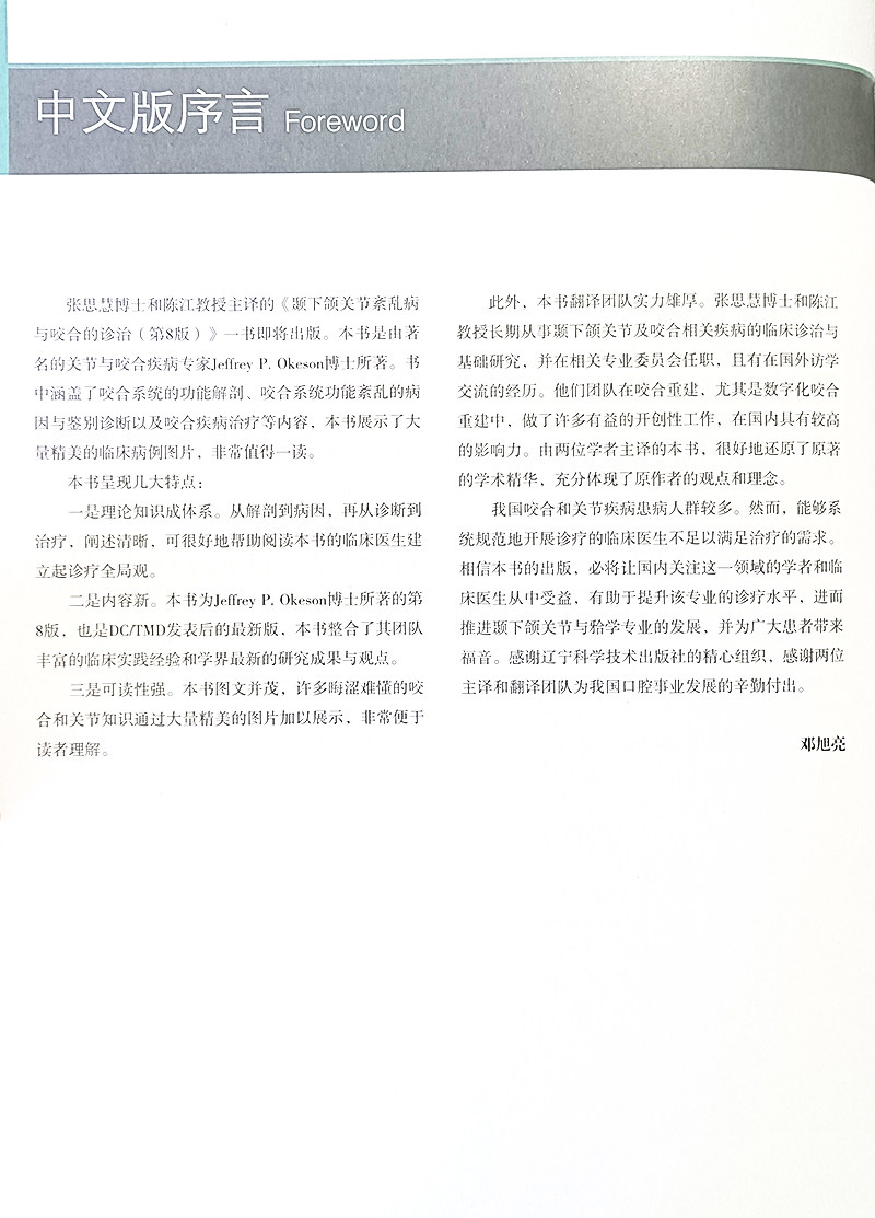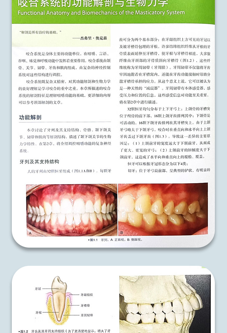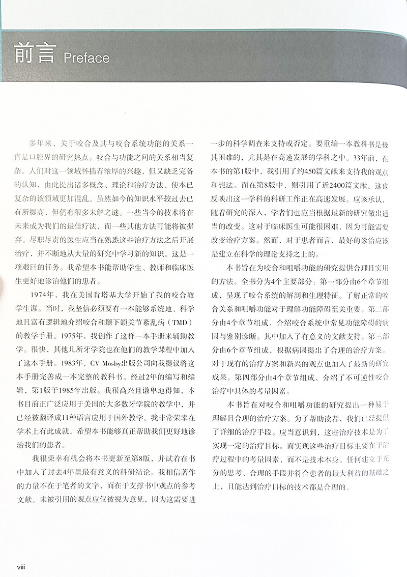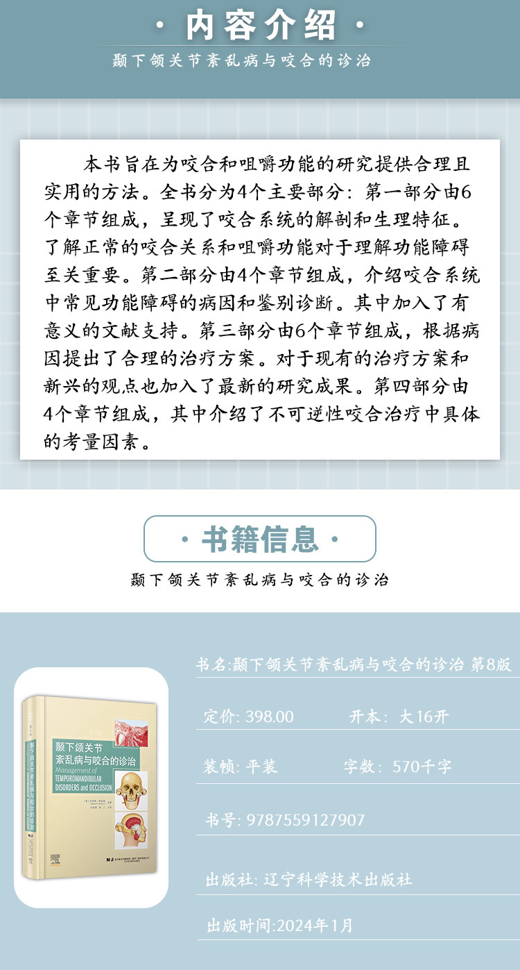本书旨在为咬合和咀嚼功能的研究提供合理且实用的方法。全书分为4个主要部分:第一部分由6个章节组成,呈现了咬合系统的解剖和生理特征。了解正常的咬合关系和咀嚼功能对于理解功能障碍至关重要。第二部分由4个章节组成,介绍咬合系统中常见功能障碍的病因和鉴别诊断。其中加入了有意义的文献支持。第三部分由6个章节组成,根据病因提出了合理的治疗方案。对于现有的治疗方案和新兴的观点也加入了近期新的研究成果。第四部分由4个章节组成,其中介绍了不可逆性咬合治疗中具体的考量因素。