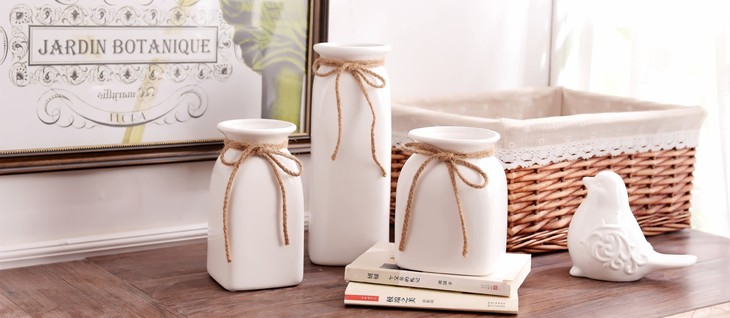 【装饰品】白色陶瓷花瓶三件套带麻绳蝴蝶结文艺小清新花器摆件中号