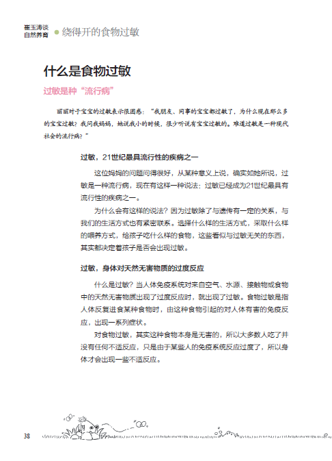 本套图书共12册,已出版的《崔玉涛谈自然养育 理解生长的奥秘》和《崔玉涛谈自然养育 看得见的发育》两册图书,全面介绍以及如何详尽评估婴幼儿的生长和发育,本书从介绍母乳喂养,婴儿出生后的第一口食物开始,详尽阐述母乳喂养过程对婴儿免疫功能发育的影响;对比了解配方粉的劣势;冷静认识辅食添加的时机和种类。本书竭力想使读者了解,整个喂养进展过程充实于婴幼儿对食物接受情况;食物本身超越营养的功能作用,接着落定于食物不耐受或食物过敏产生的基础,以及如何正确认识食物过敏;如何诊断及治疗;然后展示出预防食物过敏的可能性和实施方法;最终希望达到所有婴儿从出生开始尽可能得到优质营养,并在此前提下积极预防食物过敏。本书延续前两册的风格,尽可能通过实际案例、图示等易于理解的方式,帮助读者了解过敏、探寻过敏,最终有意识地预防过敏。