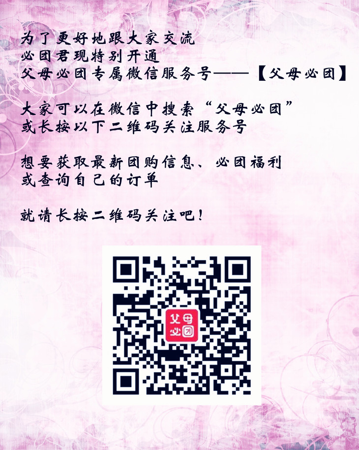 若有问题,请您关注“父母必团”微信公众号直接将问题发送给必团君,必团君在线时间为工作日9:00—17:00,其他时间请您留言。所有咨询均会回复,所有售后问题负责到底。请放心!