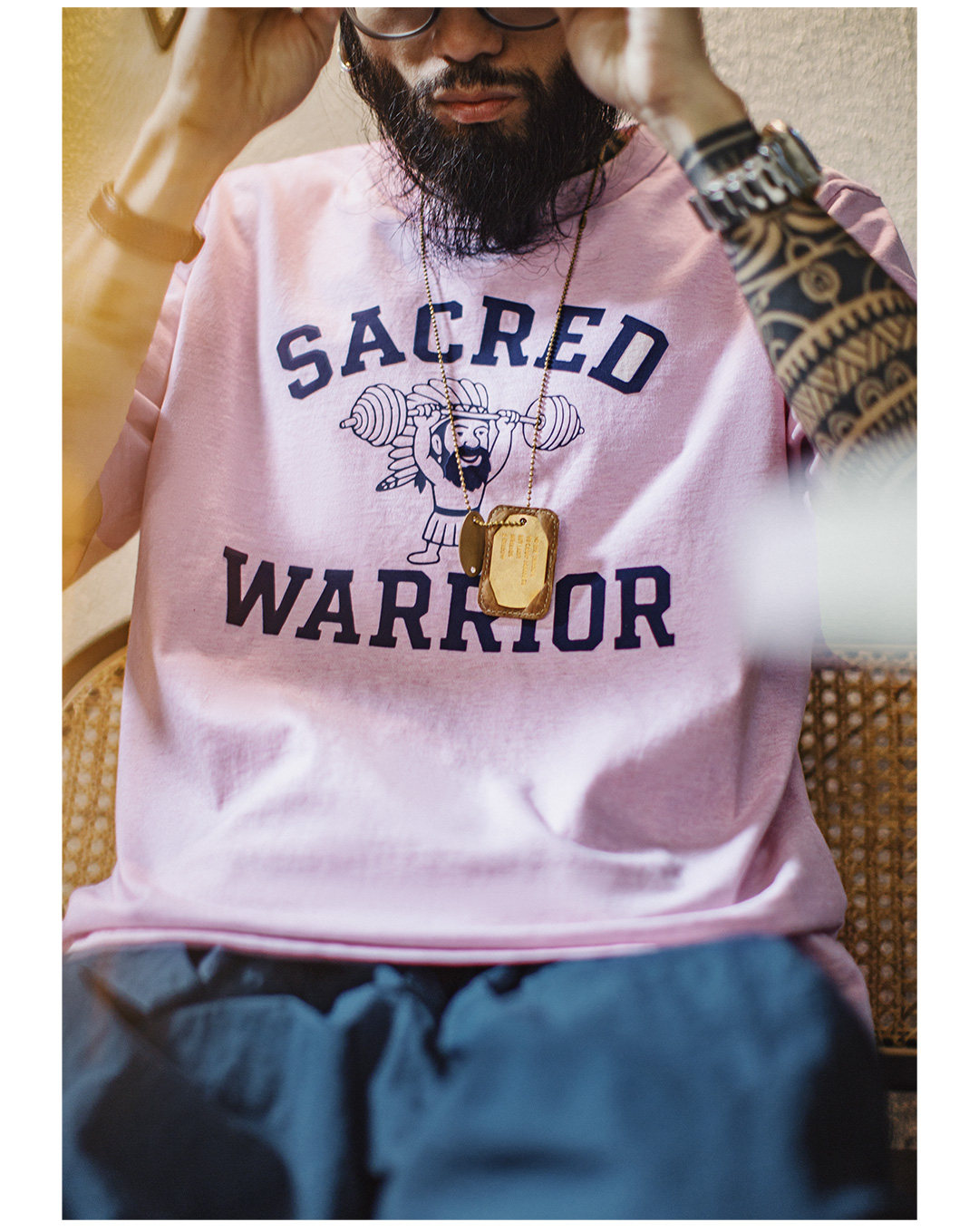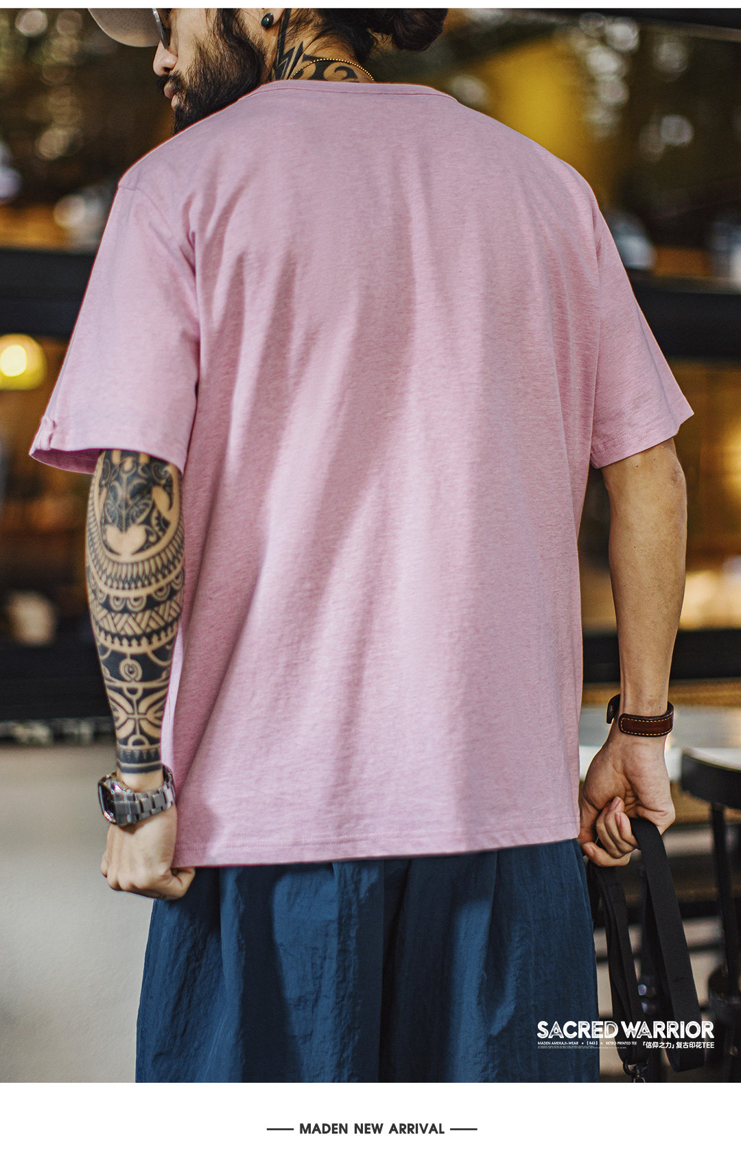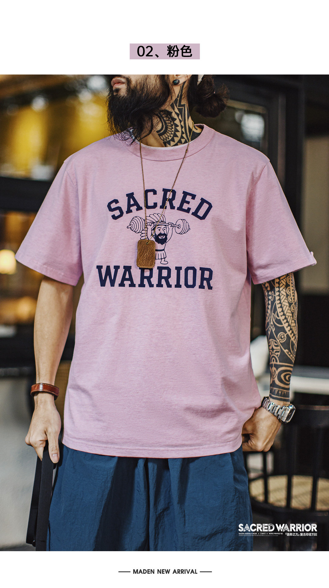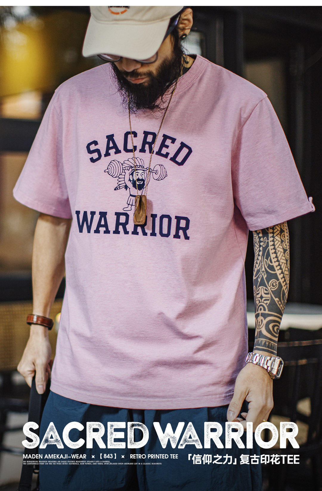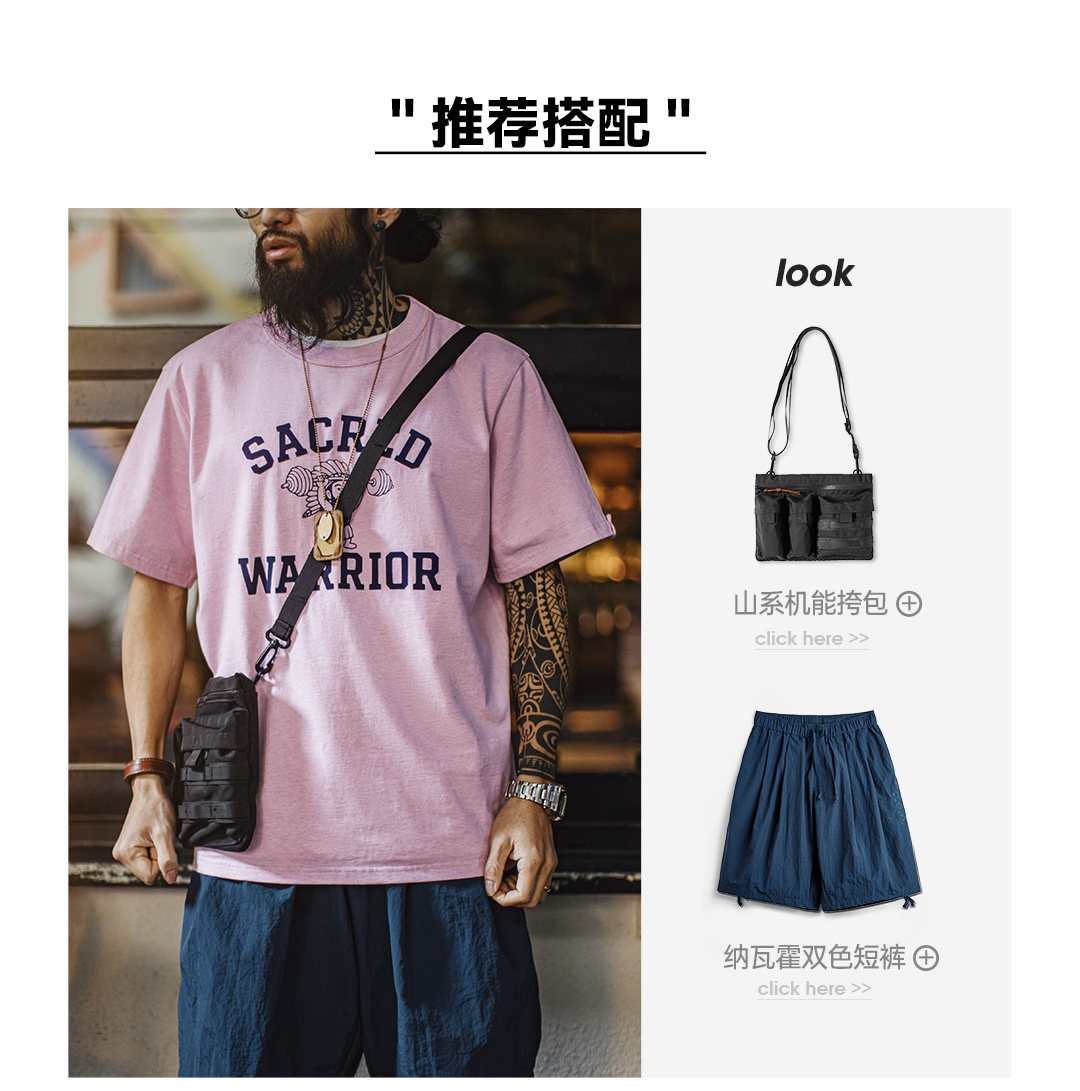 马登工装美式复古印花植绒T恤纯棉小众休闲粉色宽松短袖男款夏季