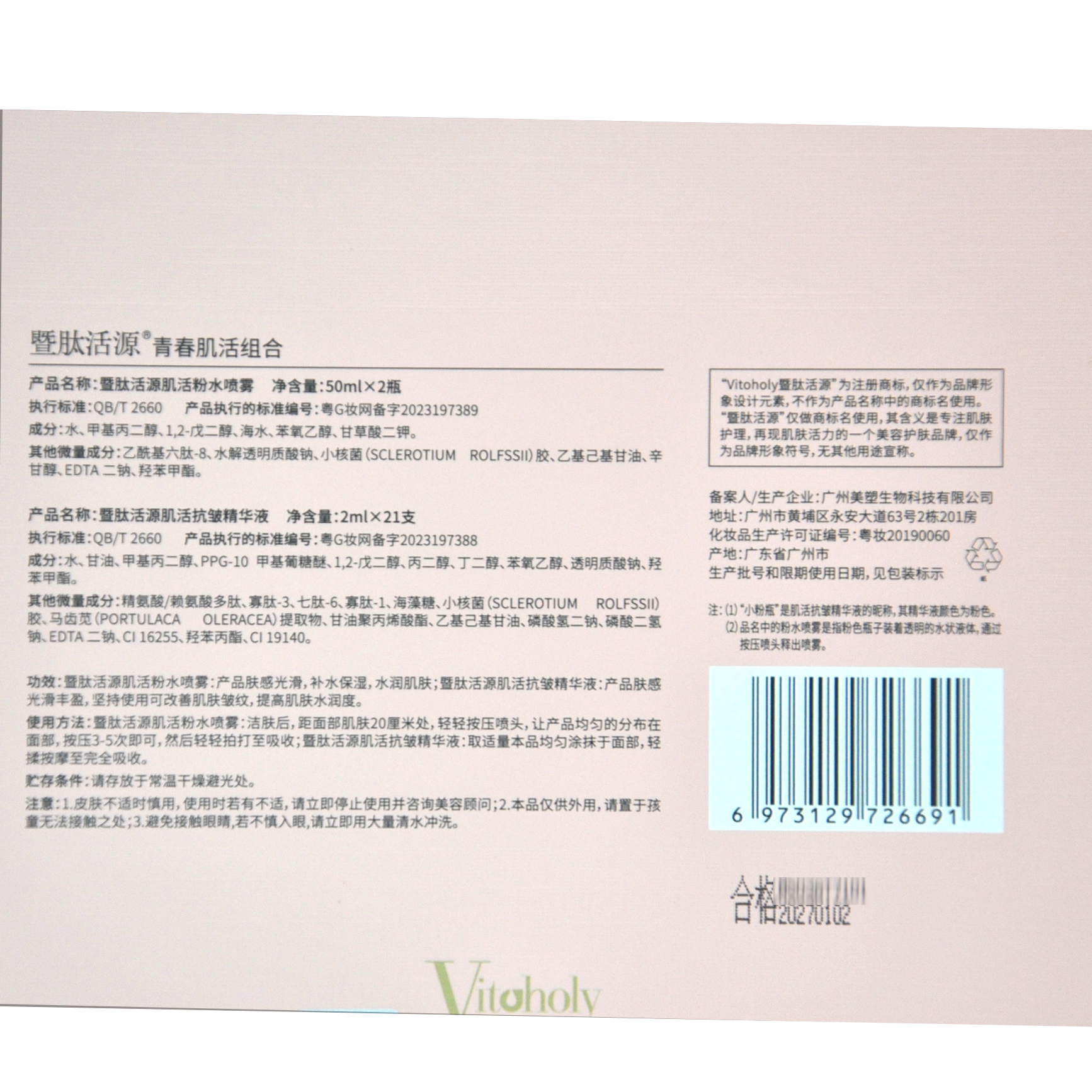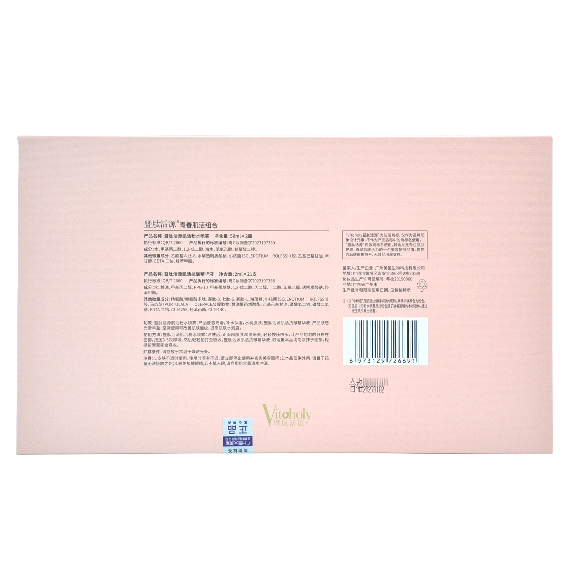 暨肽活源肌活粉水喷雾:洁肤后,距面部肌肤20厘米处,轻轻按压喷头,让产品均匀的分布在面部,按压3-5次即可,然后轻轻拍打至吸收。