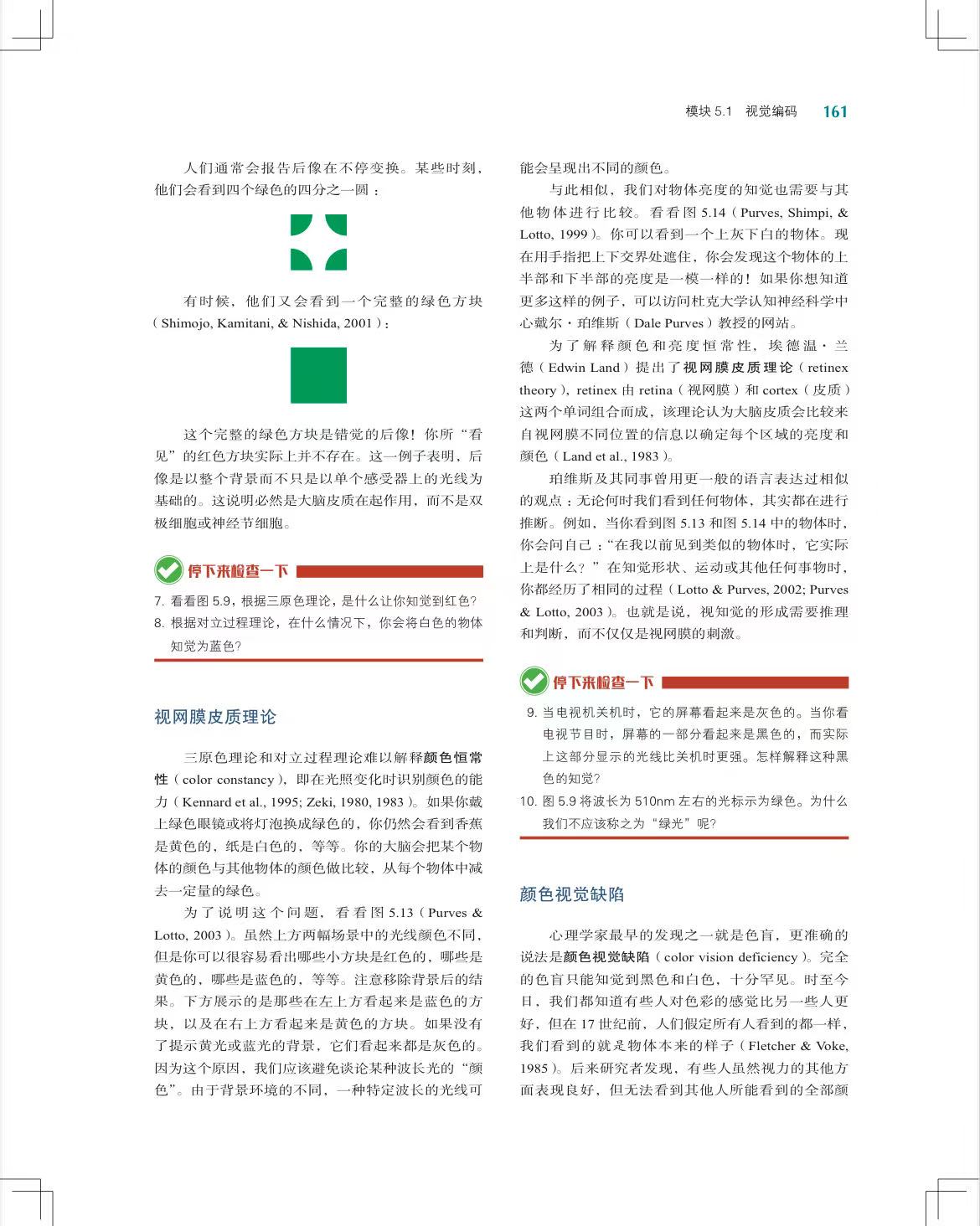 这本教材涉及的内容广泛,复杂程度适中,比较浅显易懂,这对大多数将来不一定从事生物心理学专业研究的学生来说是比较合适的,也与作者希望吸引读者兴趣的初衷吻合。同时内容选择上还体现了作者对学科前沿热点的关注和及时吸收。而教材各种细节上的人性化安排给选择本书的教师和学生提供了方便,如每章的内容按照几个小的模块来组织,对教师授课时的选择以及学生阅读参考时的取舍、选择和安排都提供了方便。参考文献后面括号中表明该文被引用章节的标示也省去读者不少查找之苦。当然我通常喜欢用外文原版教材的一个原因就是其中的彩图。本书中的图示色彩鲜艳,大小适中,标识清晰。据说出版社在中译本中会保留彩图,希望大家和我一样喜欢。