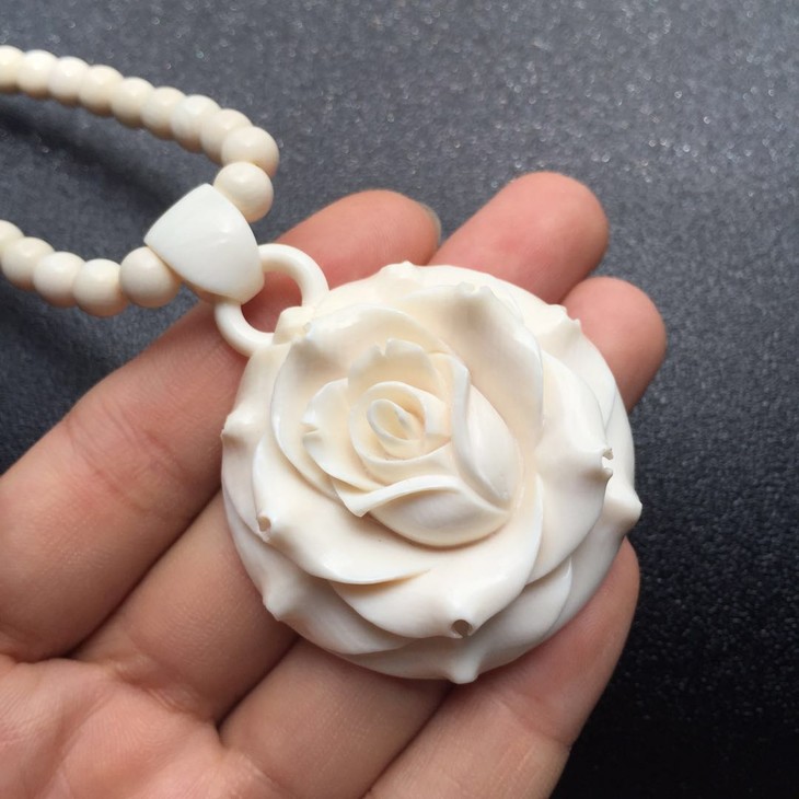 【48846】猛犸象牙玫瑰花套装,天然西伯利亚冰料,手工精雕,牙质细腻水润,纹路清晰,搭配6mn佛珠项链,一套上身简洁大方,美丽动人性价比高。尺寸40.5-12.5mm克重36.2g结缘价1680