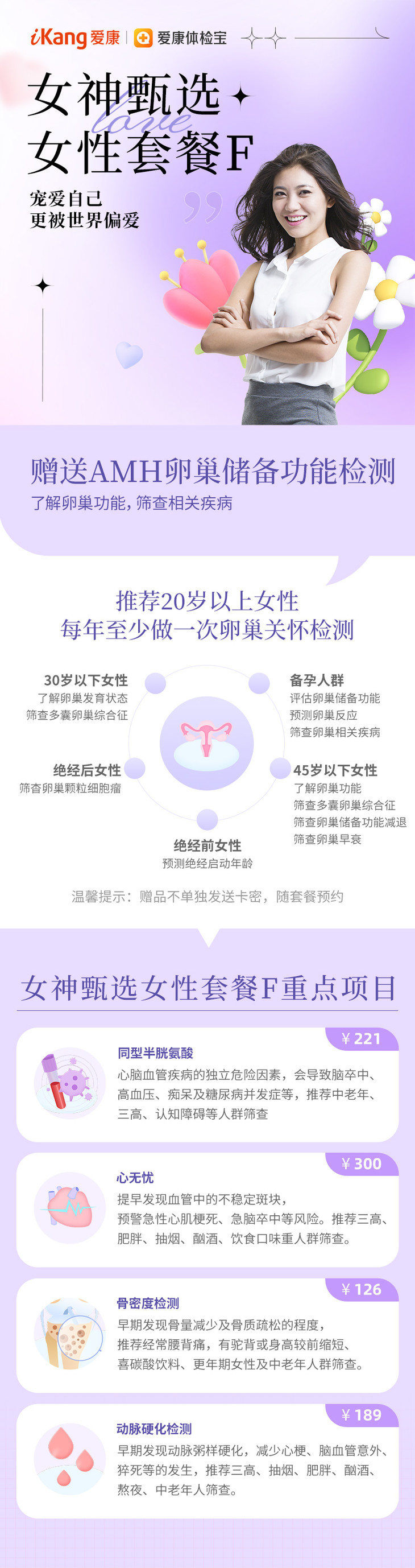 【升级动脉硬化检测+同型半胱氨酸+骨密度+心无忧】爱康 女神甄选体检套餐F(含AMH卵巢功能检测-适用于20岁以上女性)