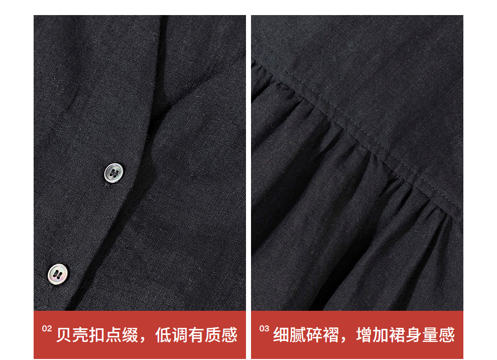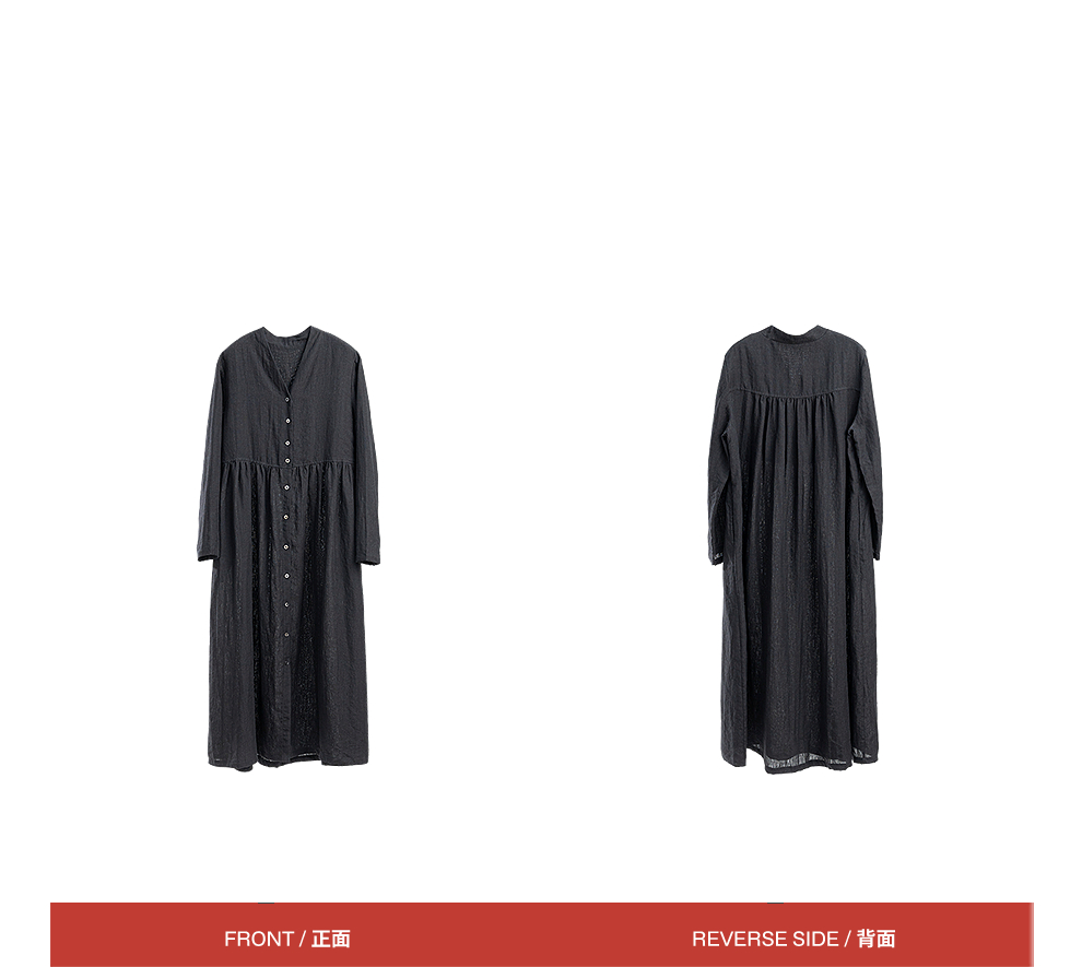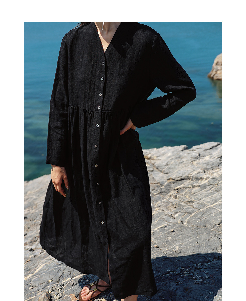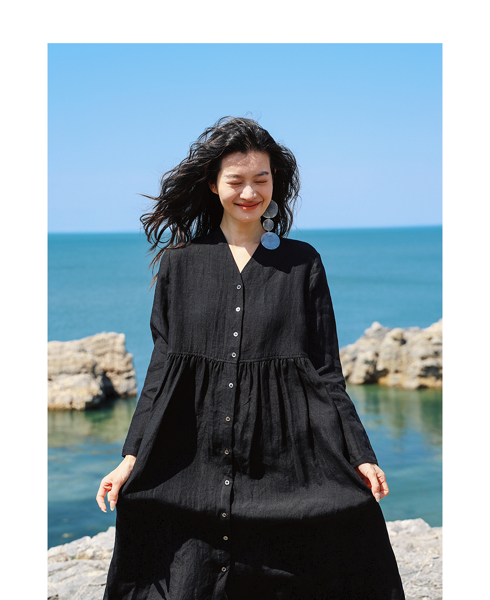 绽放旅行女装463朵/亚麻宽松V领气质文艺开襟长袖连衣裙女秋新款
