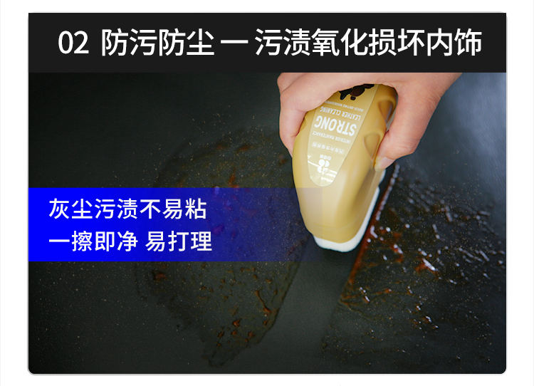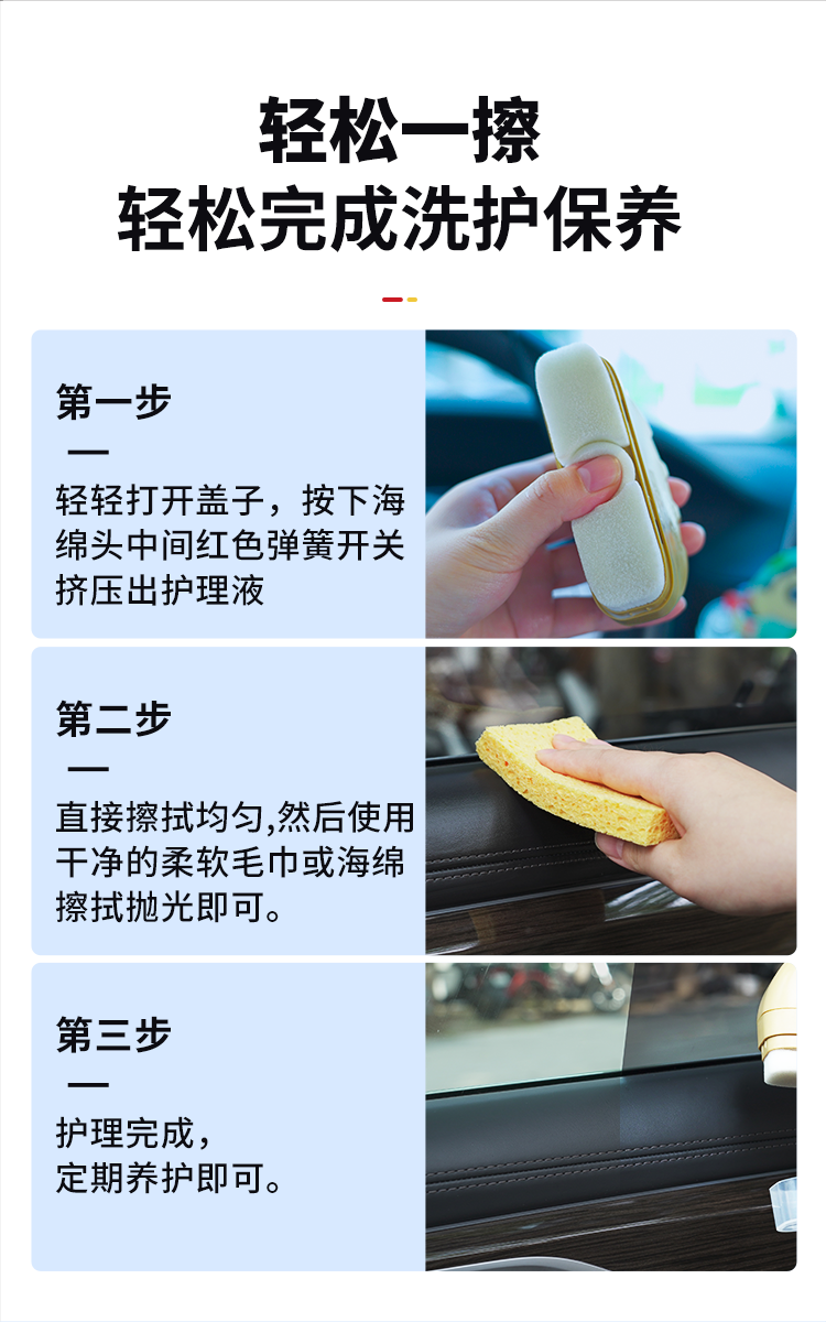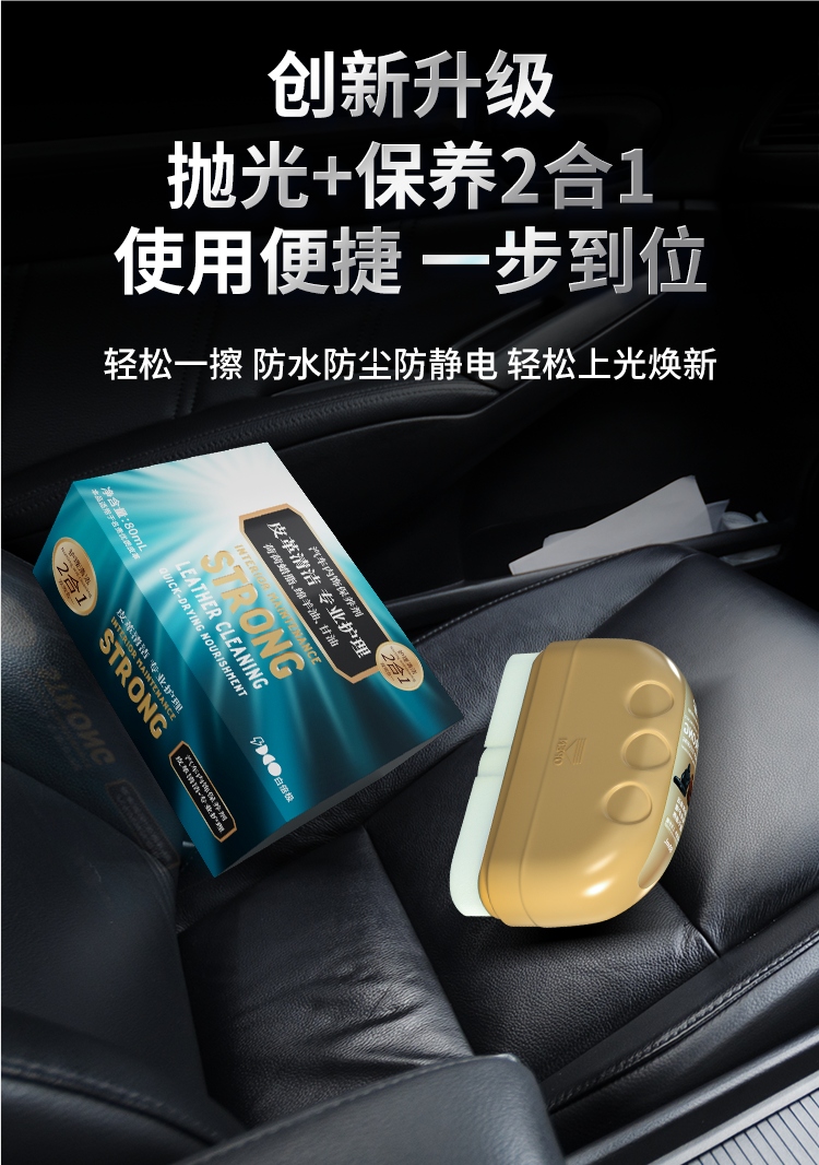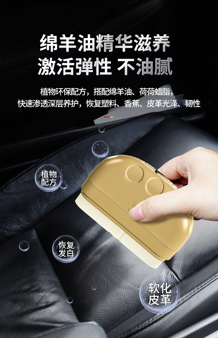 用起来也超级简单,全程无需水洗,只要轻轻擦拭就可以啦!顽固污渍,一擦之下就能干干净净,清洁效果令人惊叹,就算是皮皮上的久坐干纹,也能柔软起来!而且适用性非常广,汽车内饰的皮革、真皮座垫、脚垫、塑料、橡胶、门板、仪表台这些保养都不在话下,家居办公的各类皮革制品,像是沙发、皮包、皮衣、皮鞋也表现出色哦!