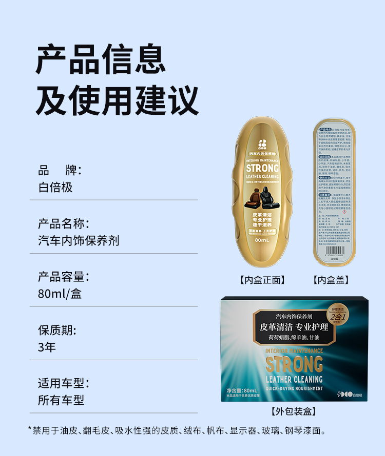 inweijia奢皮保养剂成分包含荷荷蜡脂、绵羊油以及甘油,都是环保材料,安全无毒无害,气味清新宜人,完全不会刺鼻,即便是在汽车这种相对密封的空间里大面积用,也不用担心任何伤害哦!而且功效十分强大,能够有效延缓皮质因长期使用而导致的老化、褪色和磨损问题,延长使用寿命!独特的抗污性能,轻松去除异味,在皮革表面形成一层天然保护膜,深入皮革内部,由内而外恢复光泽,柔软有弹性,且完全不会产生油腻感,还能阻挡霉菌和污渍渗透,让后续的清洁工作变得更轻松。
