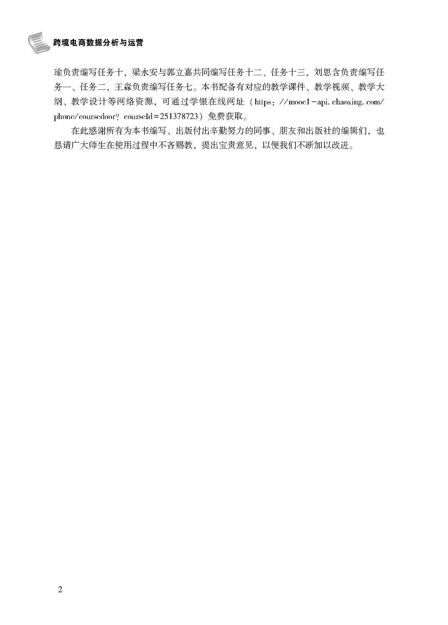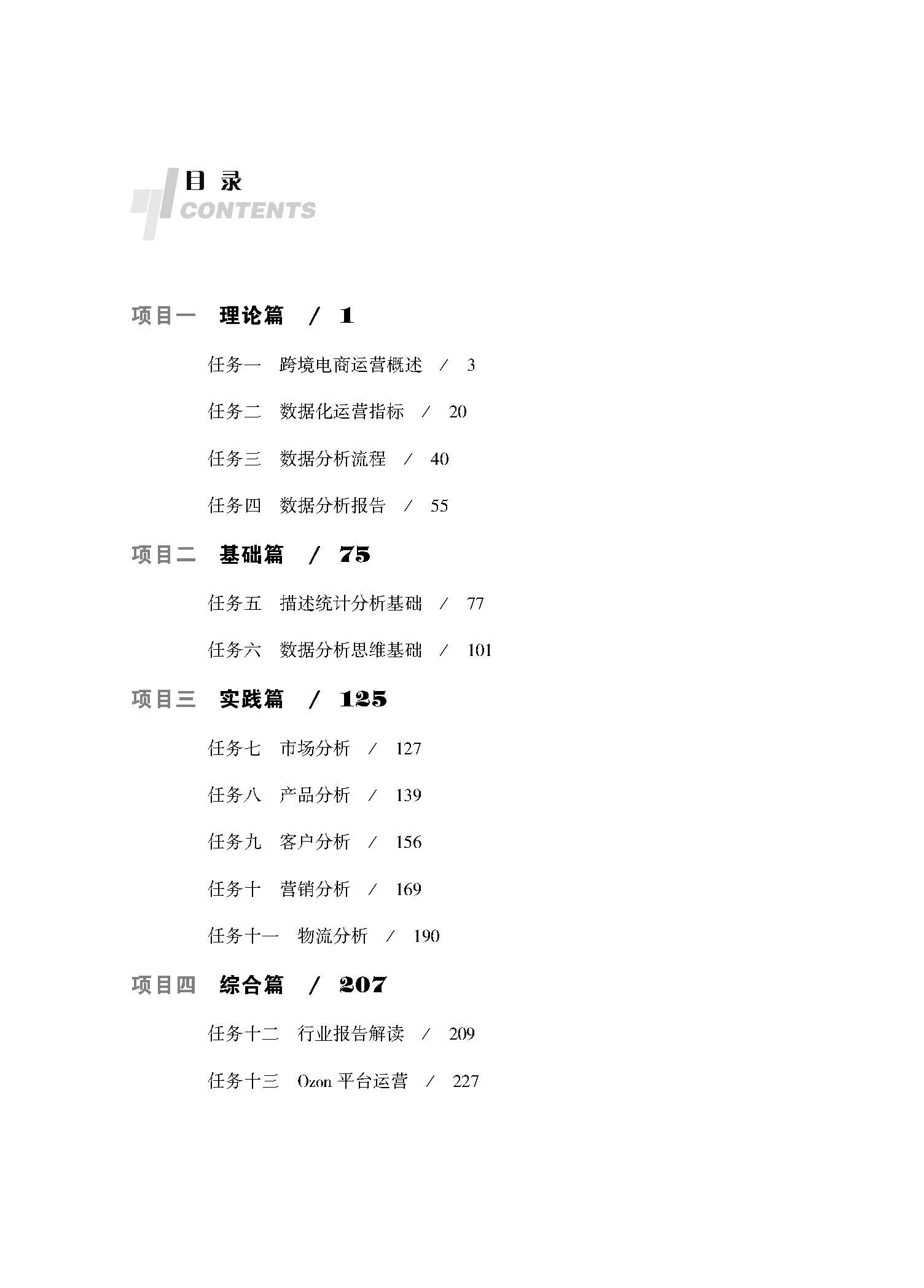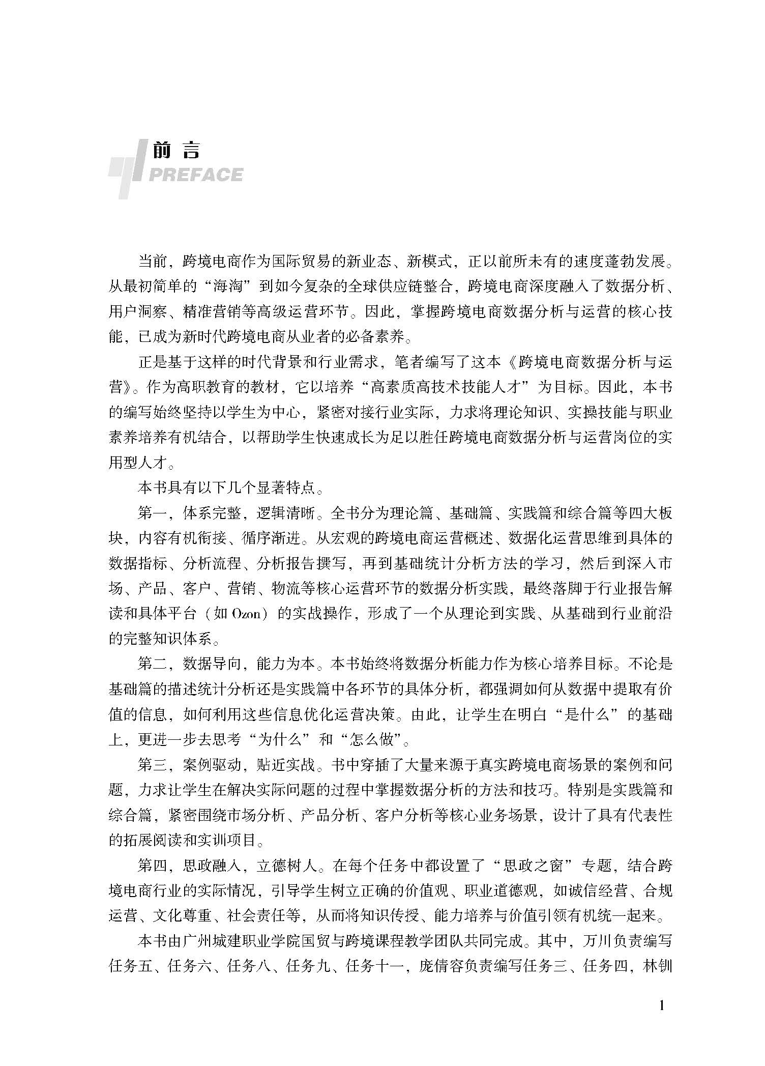 当前, 跨境电商作为国际贸易的新业态、 新模式, 已深度融入了数据分析、用户洞察、 精准营销等高级运营环节。 因此, 掌握跨境电商数据分析与运营的核心技能, 已成为新时代跨境电商从业者的必备素养。作者正是基于这样的时代背景和行业需求,编写了这部高职教育教材, 其目标在于培养;高素质高技术技能人才。 因此, 本书的编写始终坚持以学生为中心, 紧密对接行业实际, 力求将理论知识、实操技能与职业素养培养有机结合, 以帮助学生快速成长为能够胜任跨境电商数据分析与运营岗位的实用型人才。其主要特点:一是体系完整,逻辑清晰;二是数据导向,能力为本;三是案例驱动, 贴近实战;四是融入思政, 立德树人。