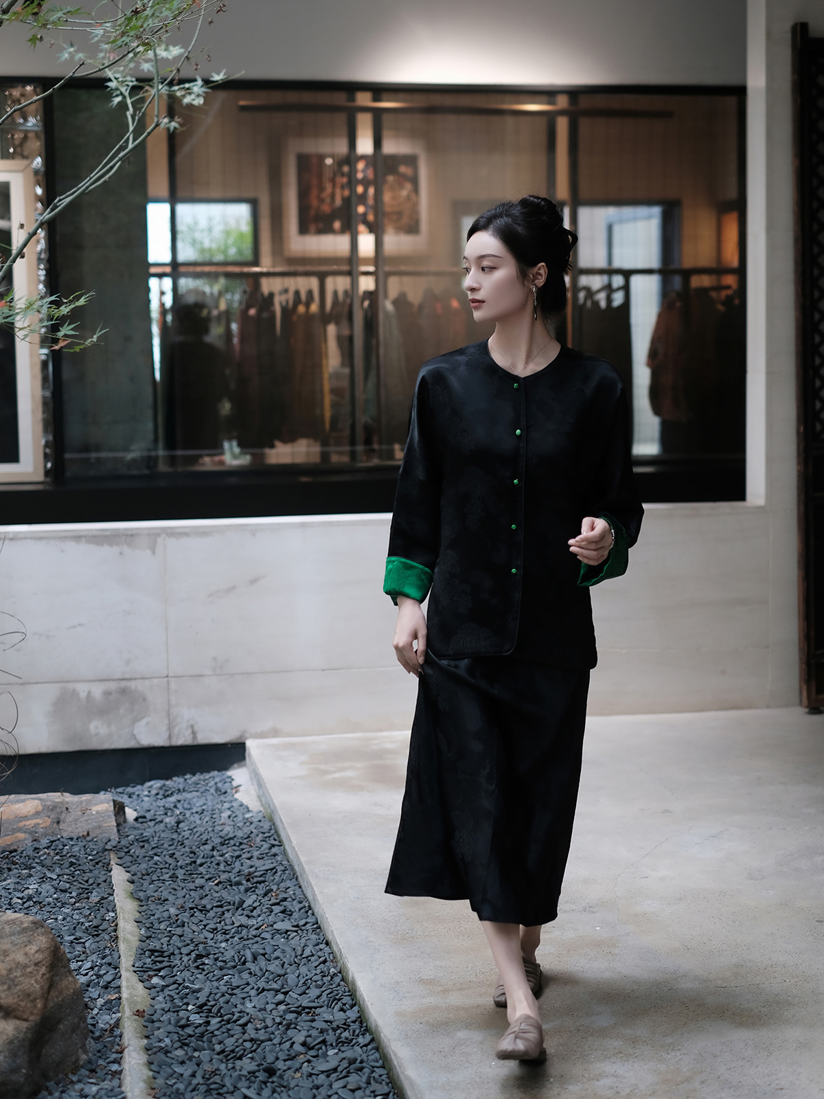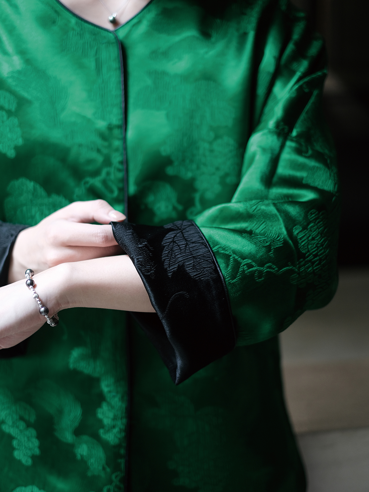 盛唐牡丹 |孔雀蓝双面穿菊花纹提花真丝外套
