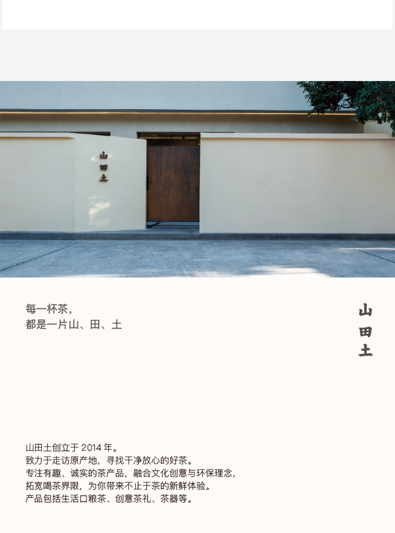 山田土是一个茶品牌。致力于走访茶区,寻找地方茶。亲眼看,亲口尝,将心比心挑选优质原料、把关工艺、审评质量,以有趣的方式呈现一杯干净好茶,让你饮用安心,感官愉悦。 产品包括:日常口粮茶,节庆茶礼,茶器