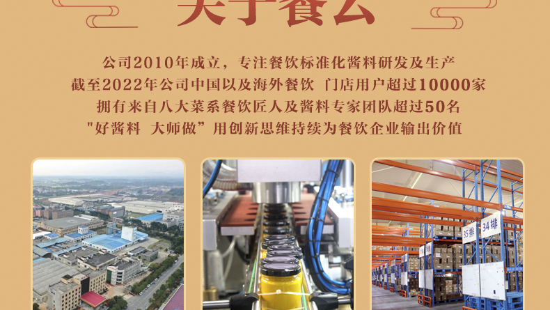 - 十年专注餐饮标准化酱料研发,中国及海外餐饮门店用户超过8000家,一种撬动厨房变革的全新价值主张,为餐饮节约30%人工成本。