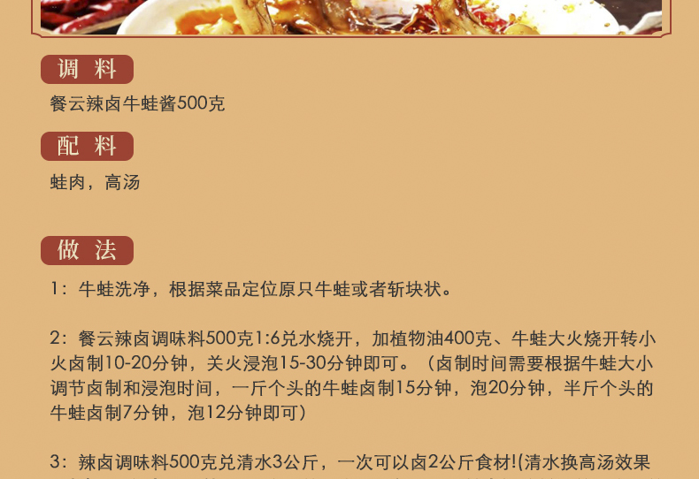 餐云辣卤牛蛙料 网红辣卤牛蛙、辣的跳菜品专用配方 一包料一瓶水即可开卤 认准餐云品牌 (2斤装卤32斤牛蛙)