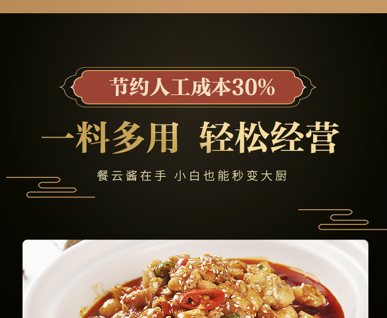餐云标准化酱料为餐饮节约厨房人工成本30%,无厨师经验从业者通过标准化流程亦可操作,30名国内中餐大厨专家365天持续研发创新!