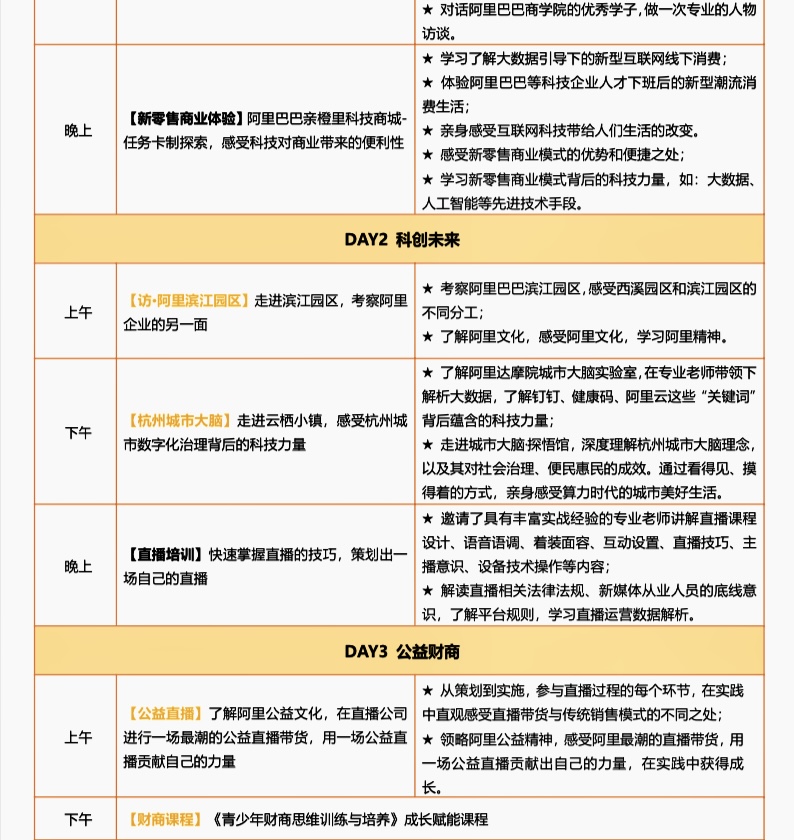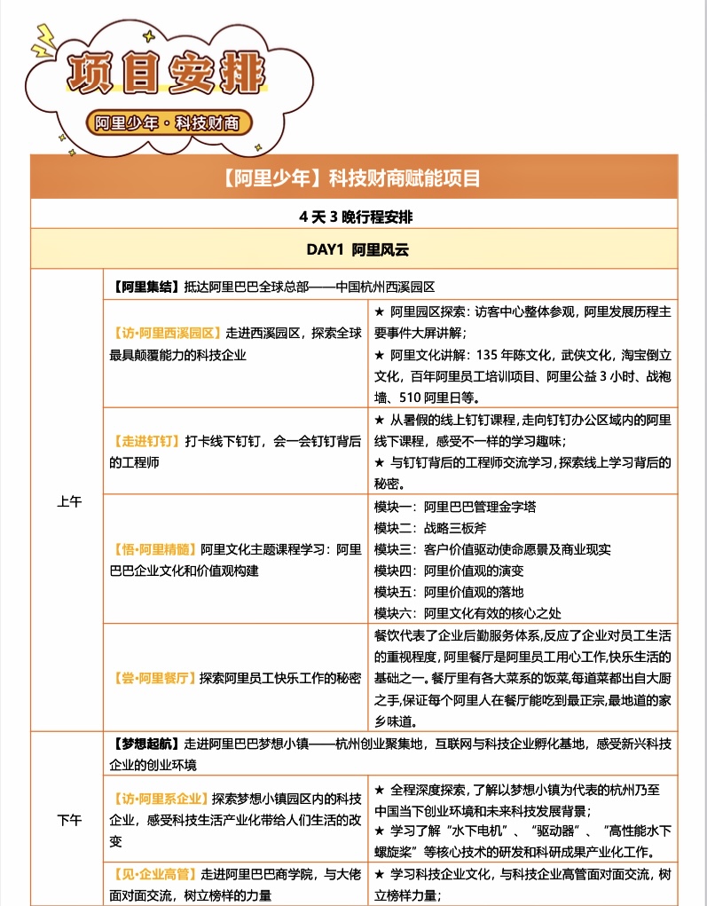 深度进入阿里巴巴企业集团公司,了解内部运营和构造,让孩子提前了解,世界百强企业。因为线路比较特殊,名额有限,尽早报名!