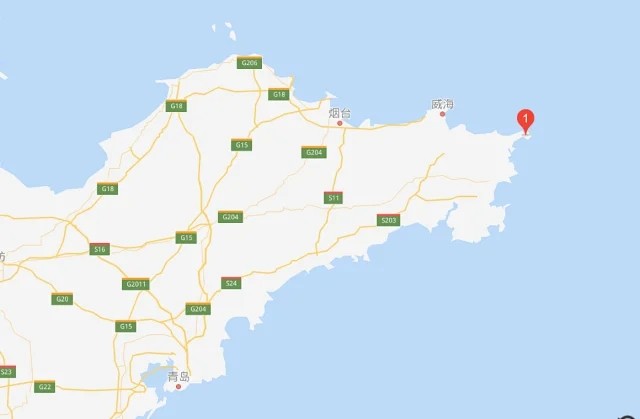 胶东半岛全域地图,最东端的那个红色标记,就是龙须岛,成山头。