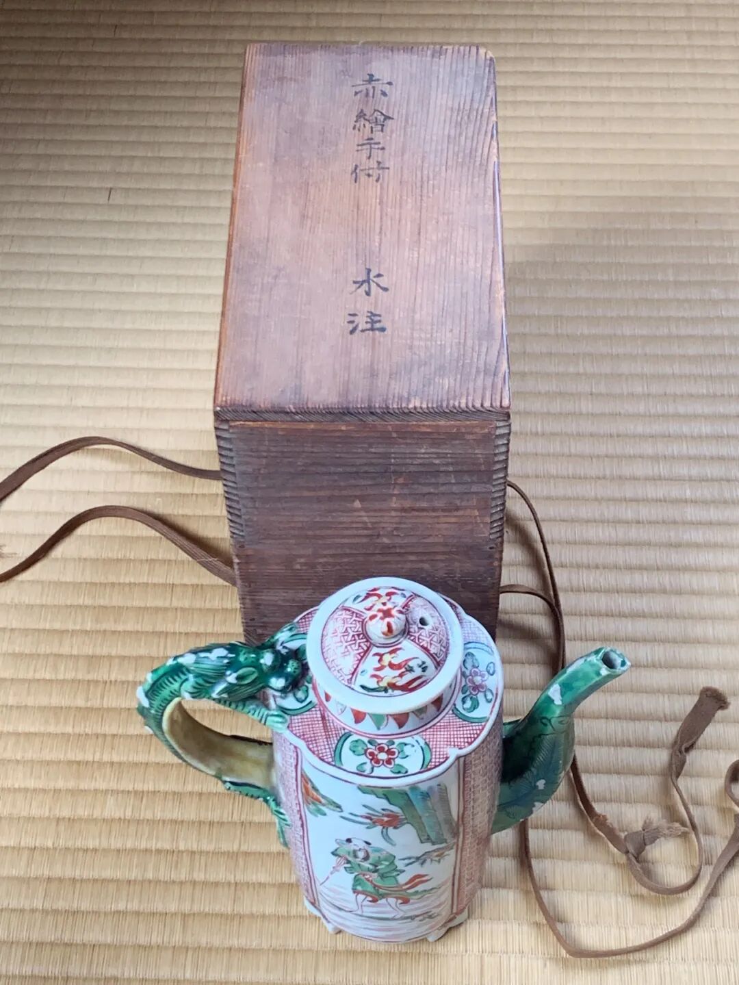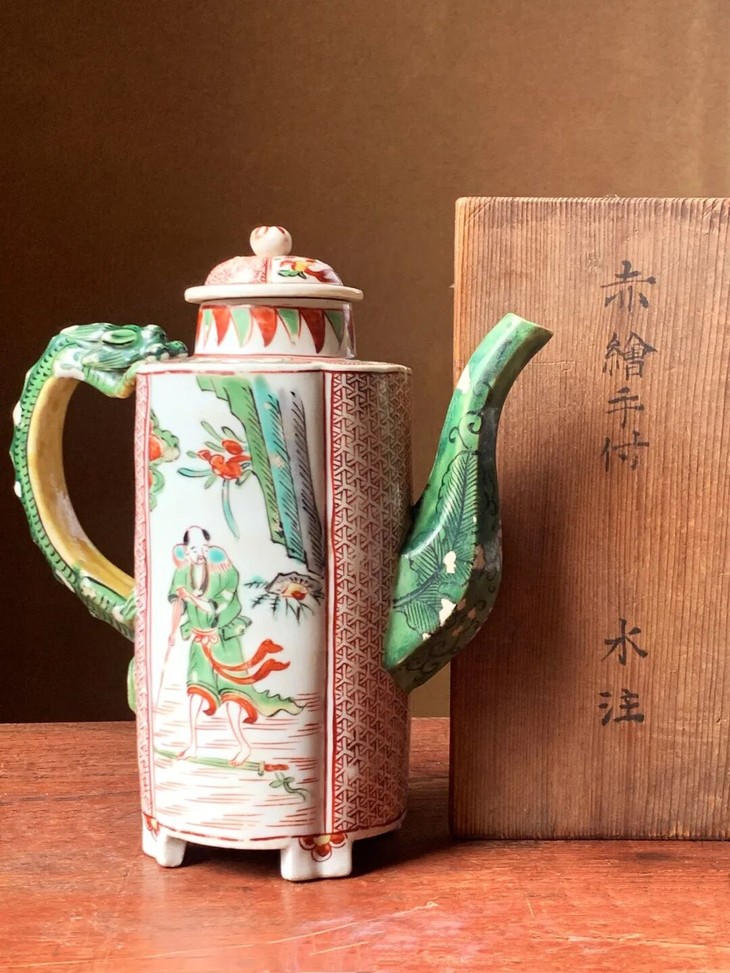此五彩绘人物纹龙把六方流酒壶胎釉细致,尺寸大、造型独特典雅、五彩色泽明亮艳丽、绘画生动流畅,整体贵气却不落俗套,是传承景德镇御窑厂技艺烧制的老瓷器精品。保留于日本藏家量身订制的桐木箱,箱盖上篆体墨书“赤繪手付 水注”,此龙把酒壶是一位日本老华侨家族典藏多年的藏品。