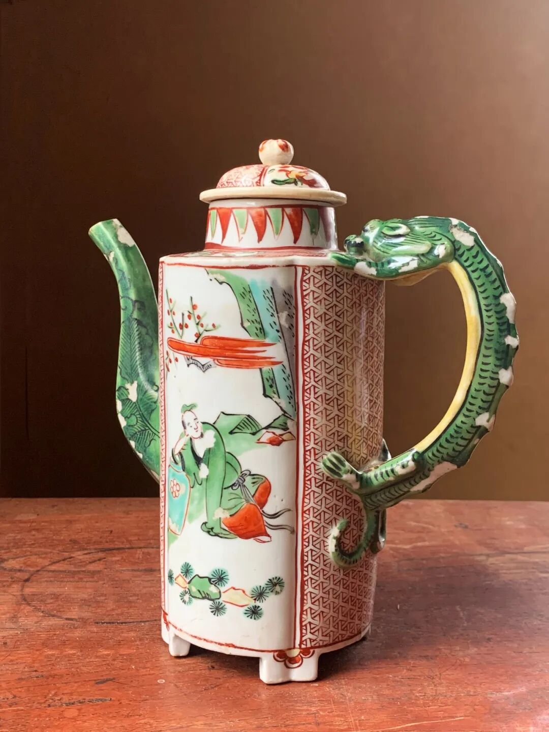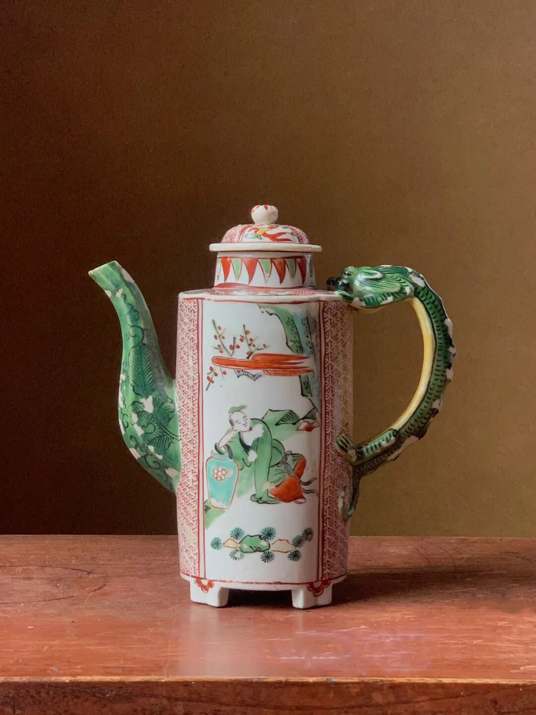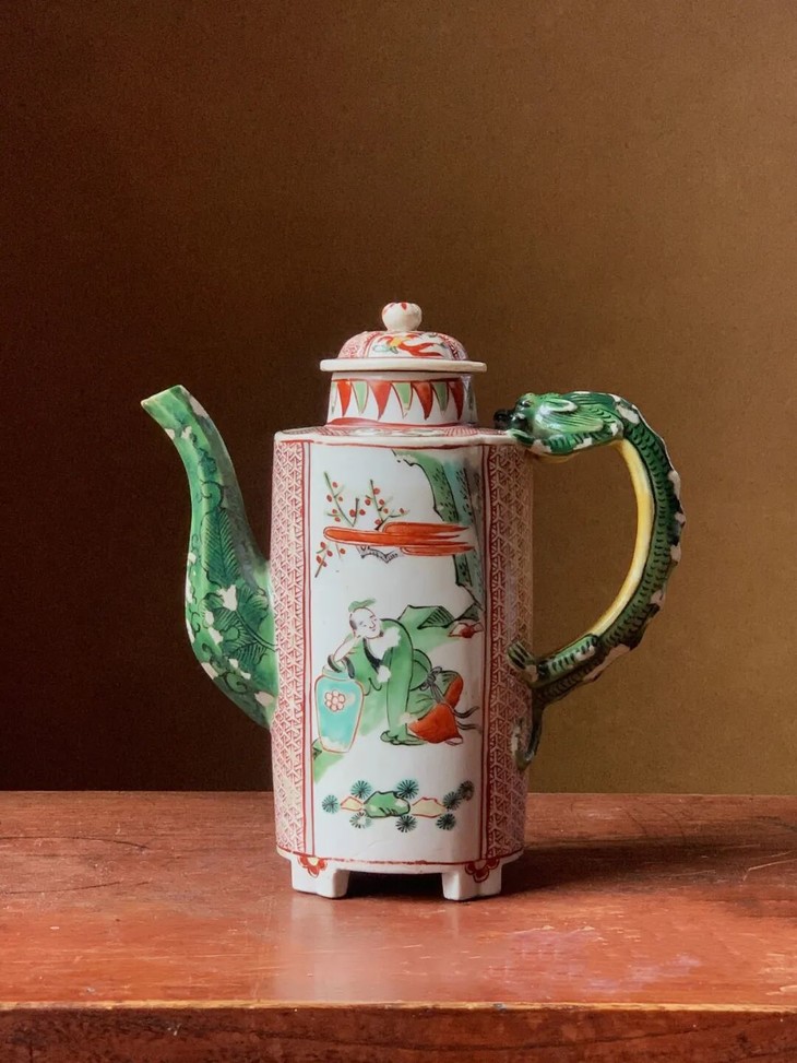 这是一件烧制于景德镇的五彩绘人物纹的龙把六方流酒壶,瓜棱壶身立于四足上,两侧绘仙人于山水之中,前后侧以红彩绘细密图案,后侧以蟠踞绿彩龙为壶把,前端八角形壶流以墨彩绘蕉叶纹于绿彩下。 造型优雅独特的白瓷彩绘龙把壶,以景德镇御窑厂的白瓷烧造工艺,烧制出白釉瓜棱龙把六方流的优雅器型,釉上以明末特有的红、绿、黄、黑,紫等透明釉上彩绘典雅细緻的纹饰,鲜艳的五彩颜料绘画生动流畅,四足内平底保留一圈五釉露出细白胎,瓷胎质地洁净细白,是一件景德镇为贵族烧制的高端实用酒壶,整体形式优雅、纹饰华丽貴氣。
