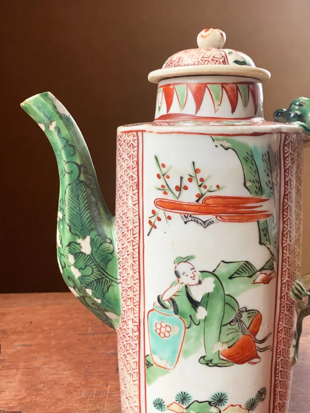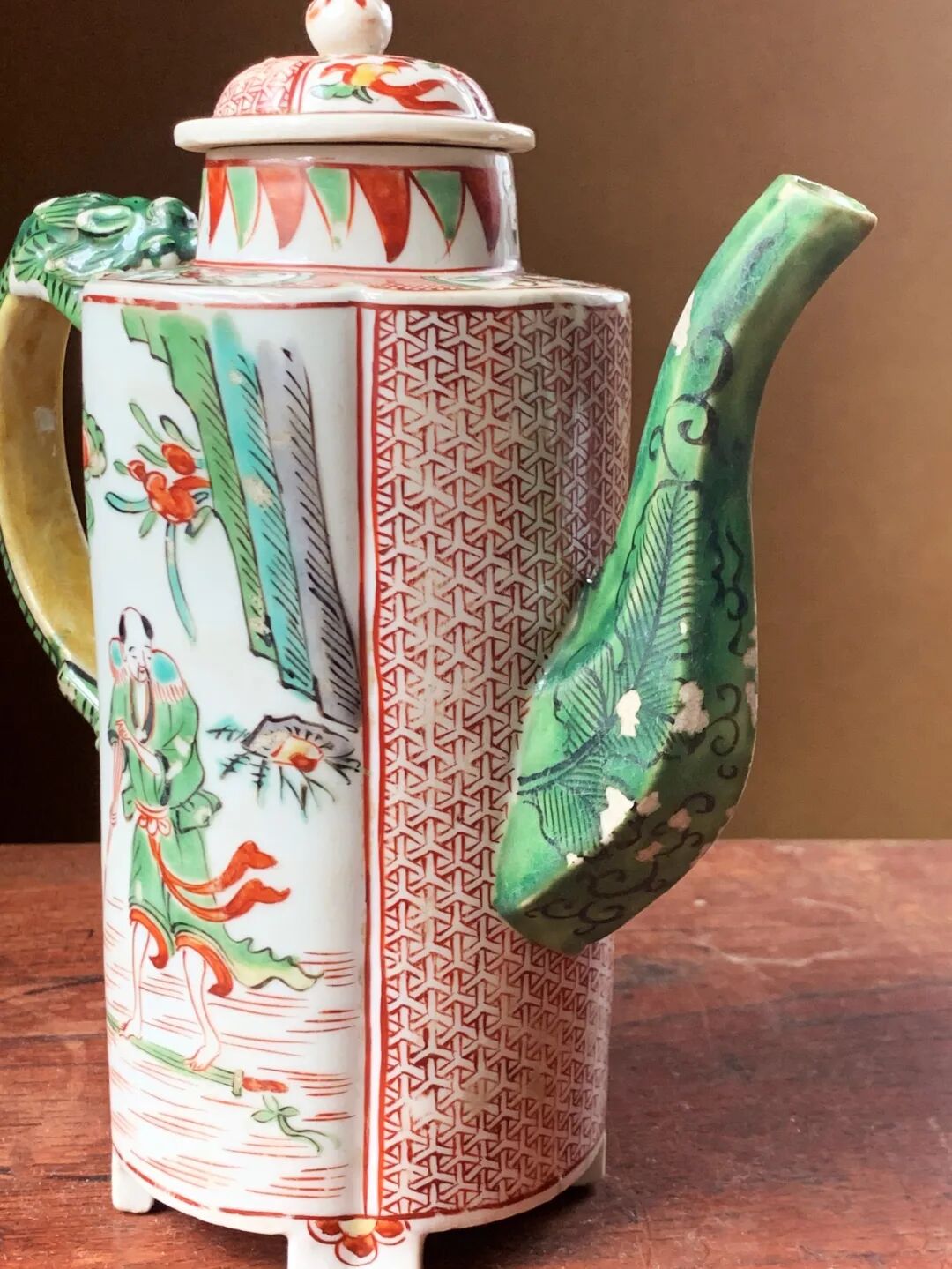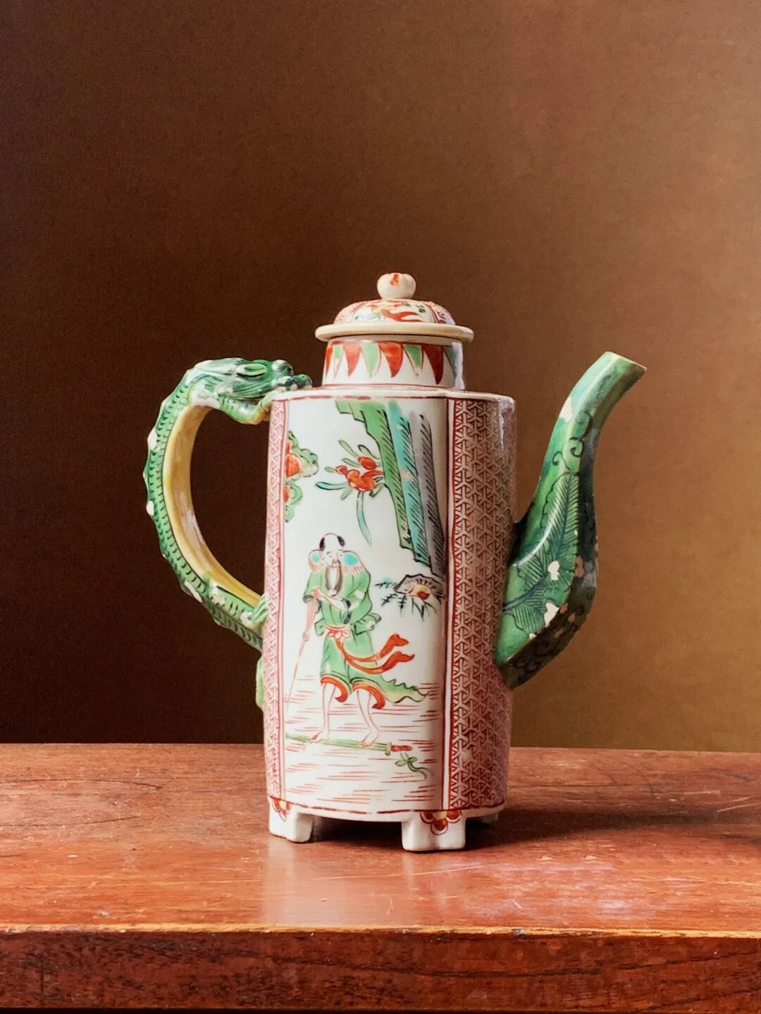这是一件烧制于景德镇的五彩绘人物纹的龙把六方流酒壶,瓜棱壶身立于四足上,两侧绘仙人于山水之中,前后侧以红彩绘细密图案,后侧以蟠踞绿彩龙为壶把,前端八角形壶流以墨彩绘蕉叶纹于绿彩下。 造型优雅独特的白瓷彩绘龙把壶,以景德镇御窑厂的白瓷烧造工艺,烧制出白釉瓜棱龙把六方流的优雅器型,釉上以明末特有的红、绿、黄、黑,紫等透明釉上彩绘典雅细緻的纹饰,鲜艳的五彩颜料绘画生动流畅,四足内平底保留一圈五釉露出细白胎,瓷胎质地洁净细白,是一件景德镇为贵族烧制的高端实用酒壶,整体形式优雅、纹饰华丽貴氣。
