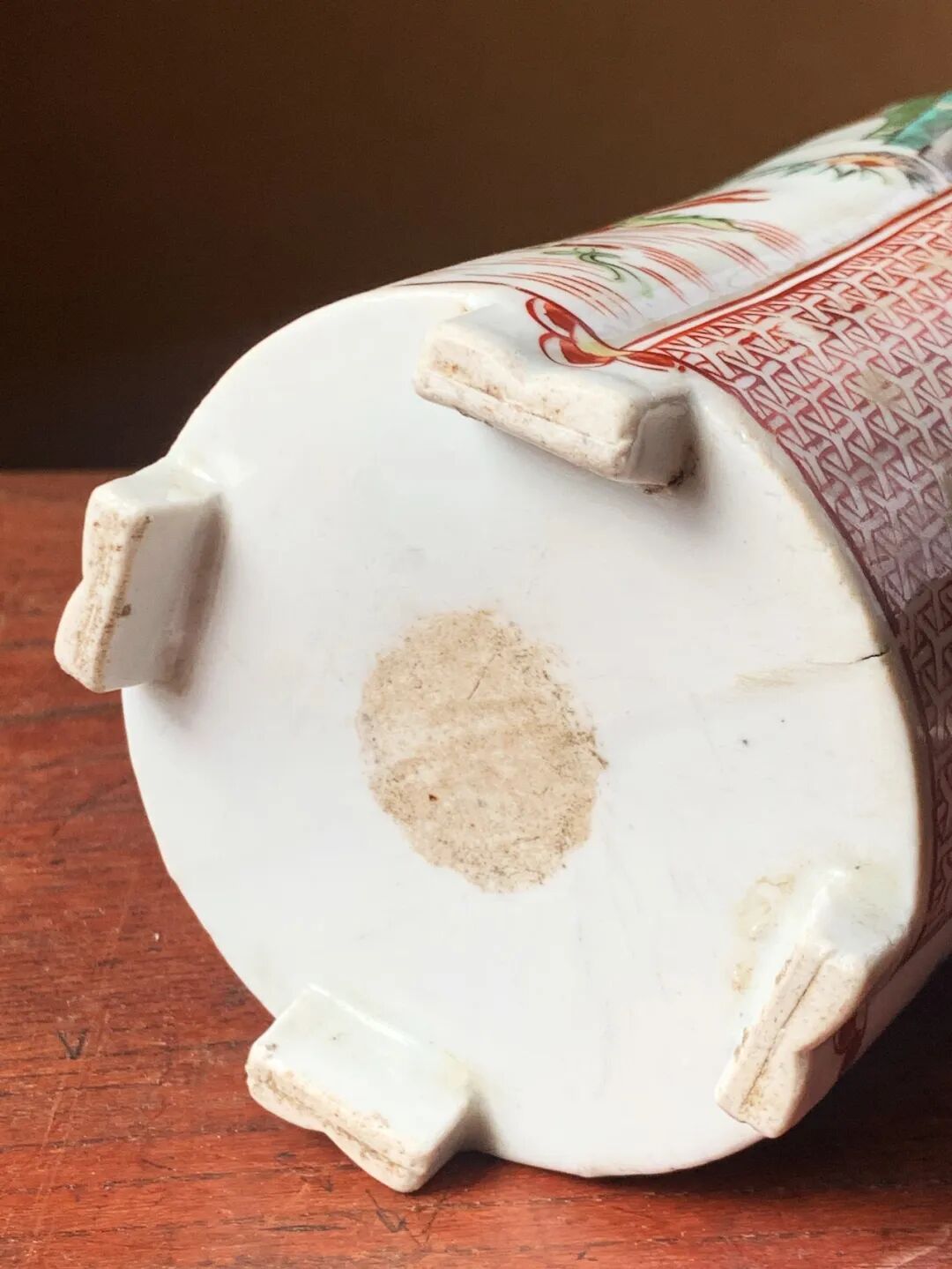 此五彩绘人物纹龙把六方流酒壶,如图所示,釉上彩有些小片状剥落以及表面正常使用产生的磨痕与边沿小磕痕,除此以外保存完好无损。附日本藏家量身订制的桐木箱。