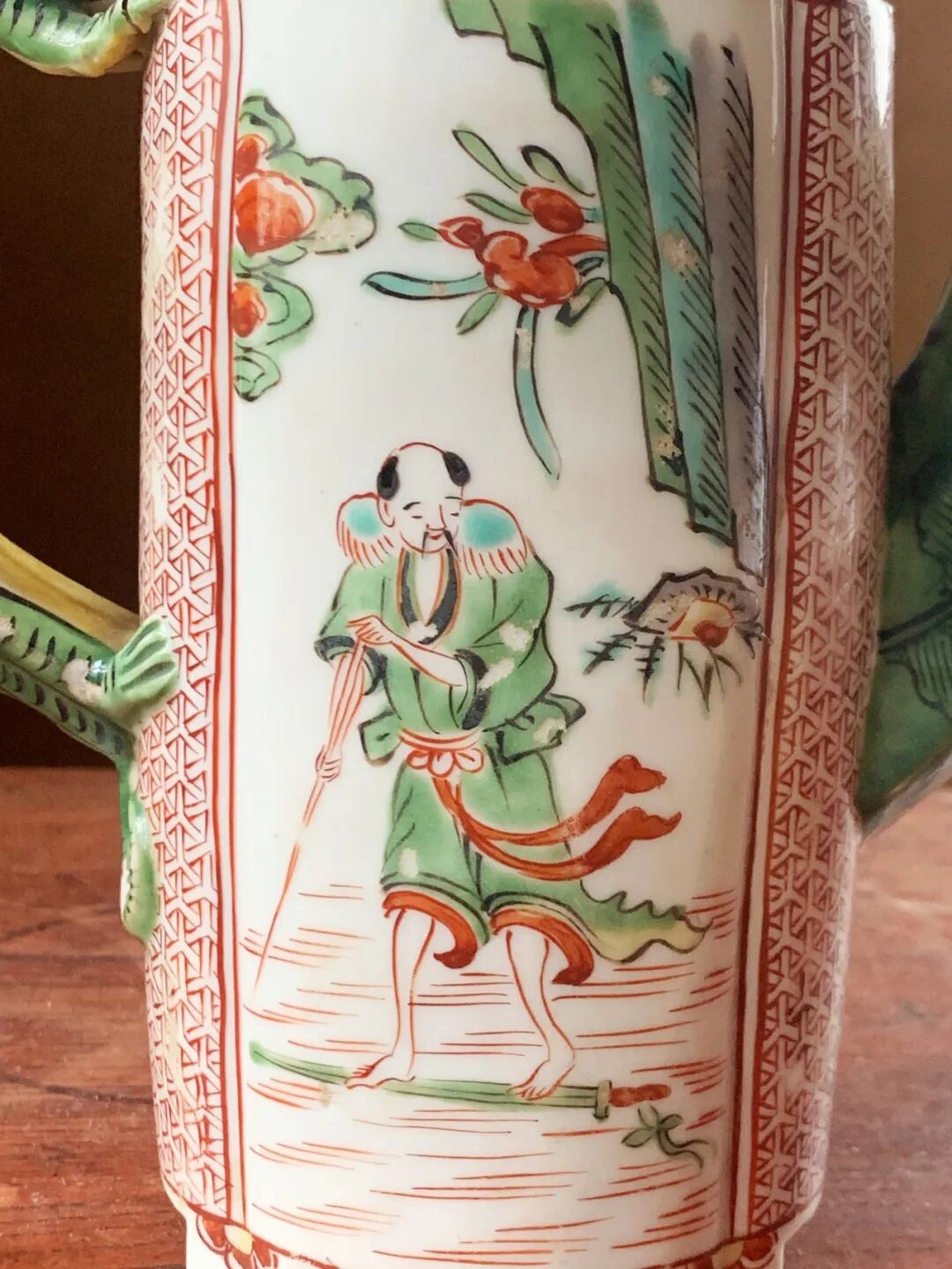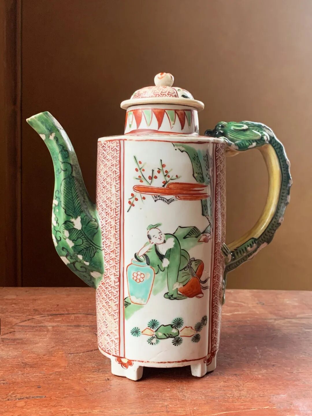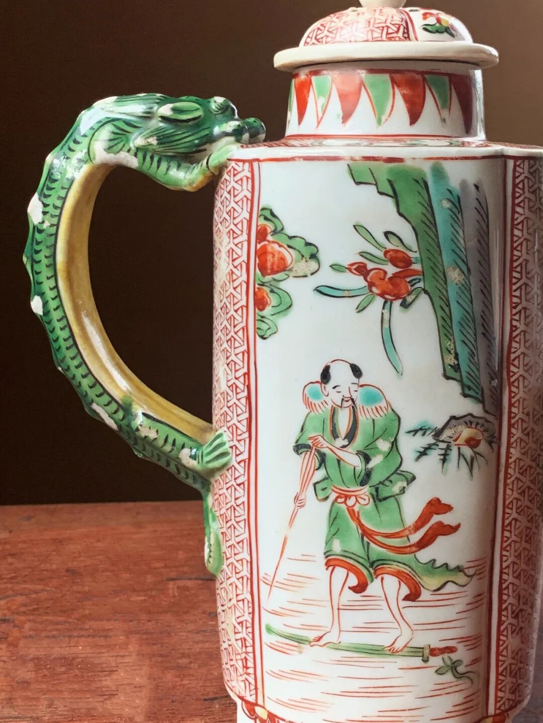 五彩绘人物纹龙把六方流酒壶