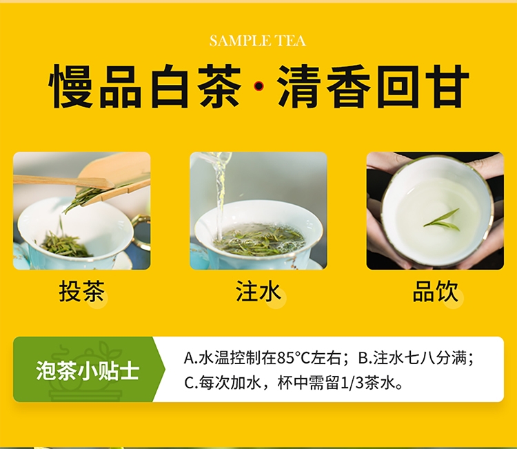 · 颜值出众:干茶条索匀整、白绿相间;冲泡后汤色清澈明亮,叶底玉白鲜活,观饮俱佳