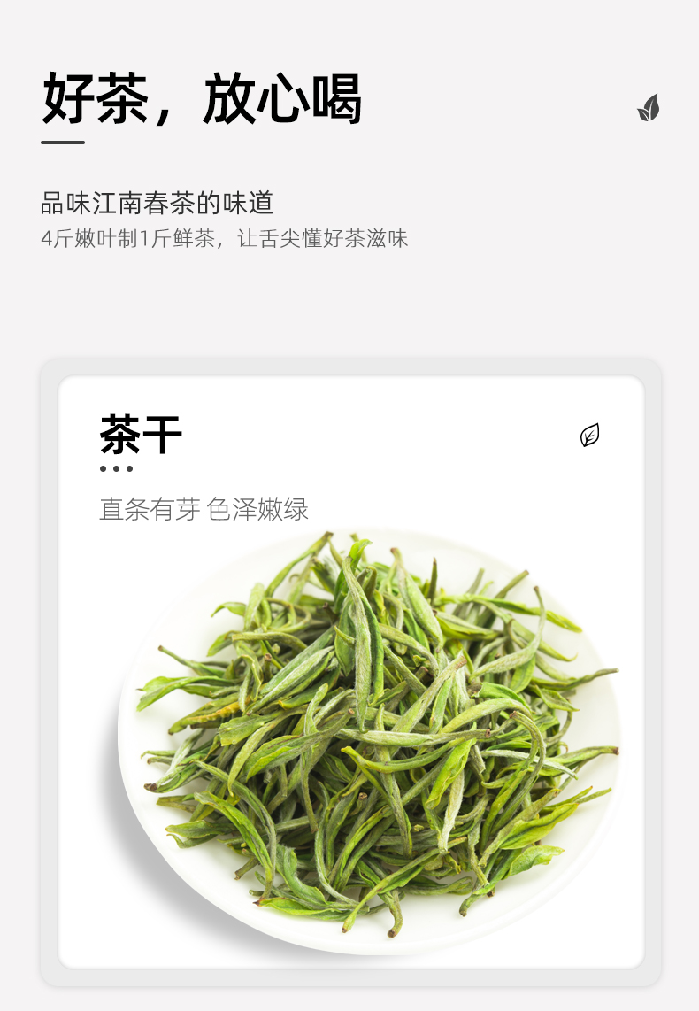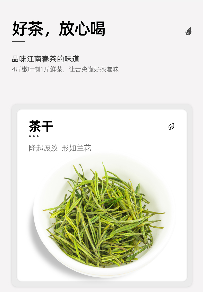 · 严苛采标:精选一芽两叶嫩芯,芽叶肥嫩匀整,为明前茶黄金采摘规格