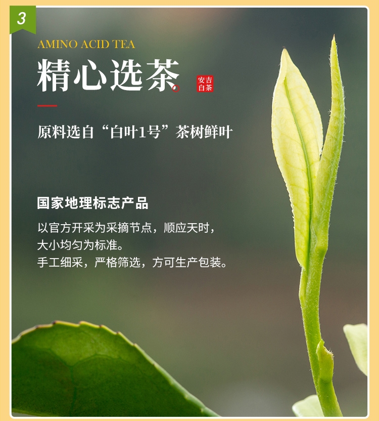 富:安吉白茶富含氨基酸,含量是普通绿茶的2-3倍。因为茶叶氨基酸含量高,口感很鲜甜;茶多酚含量低,茶叶不苦不涩。