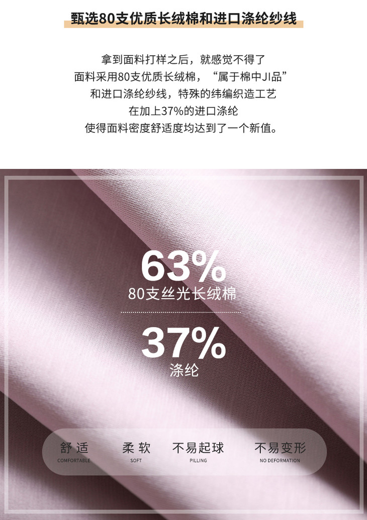 面料采用80支优质长绒棉“属于棉中JI品”和进口涤纶纱线,用德国进口机器织造,高支双股并纱,强捻高密,JING密针织,是很多国内外YI线品牌的专用面料,优质长绒棉从源头解决短纤维的起球问题,很有棉的感觉,但和普通的棉又大不相同,特殊的纬编织造工艺,在加上37%的进口涤纶,使得面料密度舒适度均达到了一个新值。