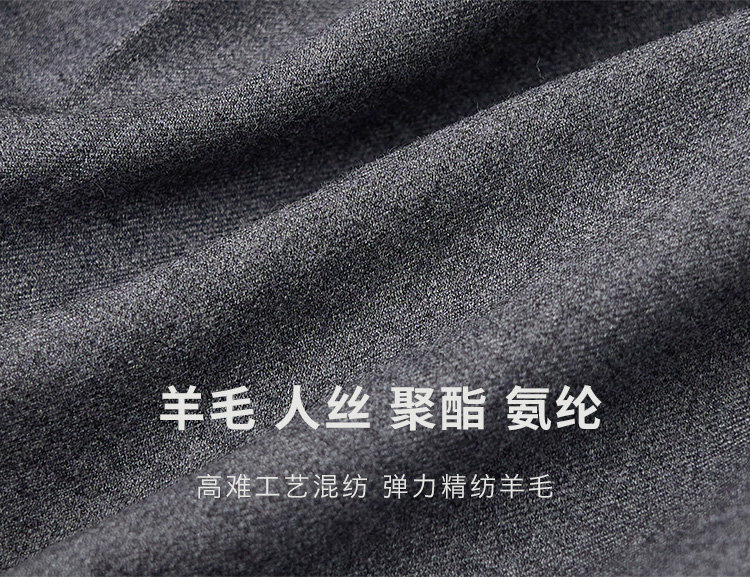 弹力精纺羊毛,4种成分高难工艺混纺!4种纱线混纺,不是一件容易的事,至少对于能同时包容不同纤维特性的机器来讲,更容易疵布,有着高要求,需指定织机来完成,且这类织机市面非常的少!比一般的羊毛更有光泽,更轻松自然。一气呵成的捻线方式,高工艺所呈现尤为细腻滑爽的质地,大大增加亲肤感;保留人丝的垂感,加入氨纶双向带微弹韧,版型得以更笔挺 有骨感,也不僵硬。