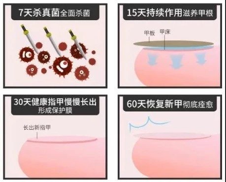 坚持每日涂抹可达到zui佳效果,直到指甲愈合。治疗持续时间取决于指甲感染的严重程度。