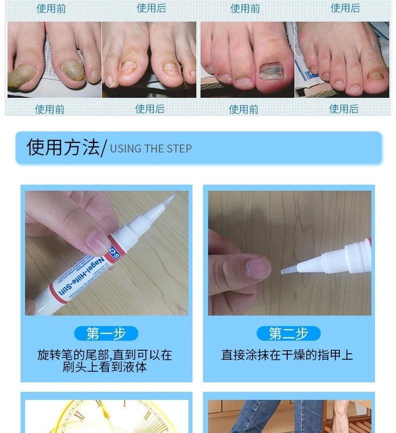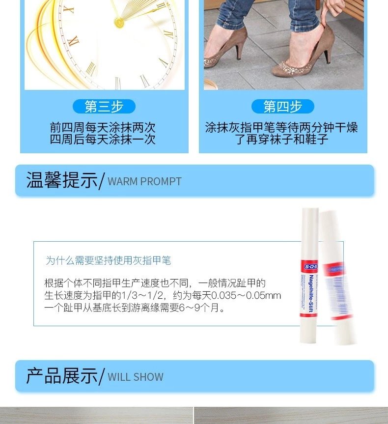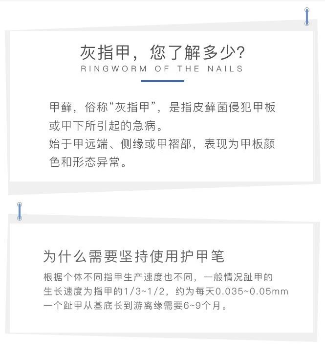 注意!!!在此之前需坚持涂抹直到指甲重新健康生长。大多数情况下,新指甲在6到12个月内生长。如果连续使用三个月后病甲没有发生任何好转,请咨询医生或采用其他治疗方法。为了避免传播感染,指甲笔只能由一个人使用,而且只能用于真菌感染的病甲。