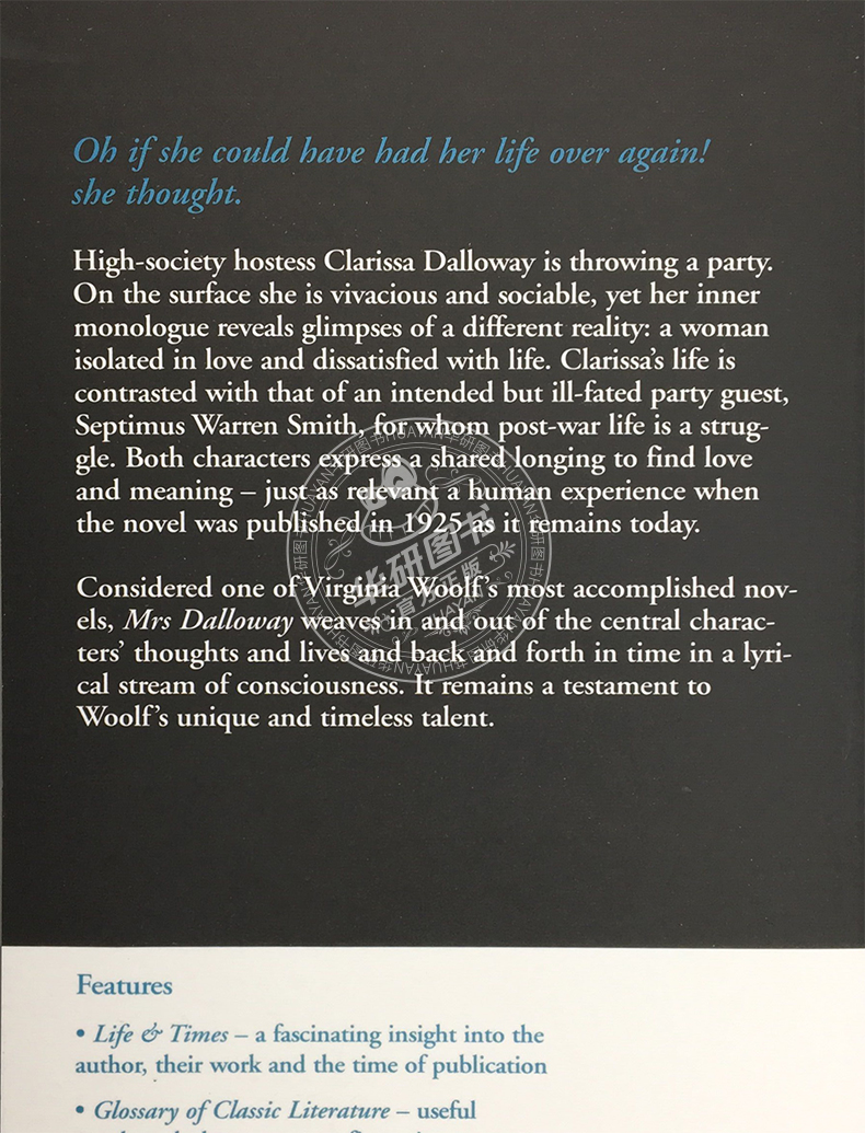 “《达洛维夫人》包含英语写作中美丽、复杂、深刻以及另类的语句,仅凭这一点就有十足的理由去阅读本书。它是二十世纪感人至深、具有里程碑意义的一书杰作。”——迈克尔·坎宁安