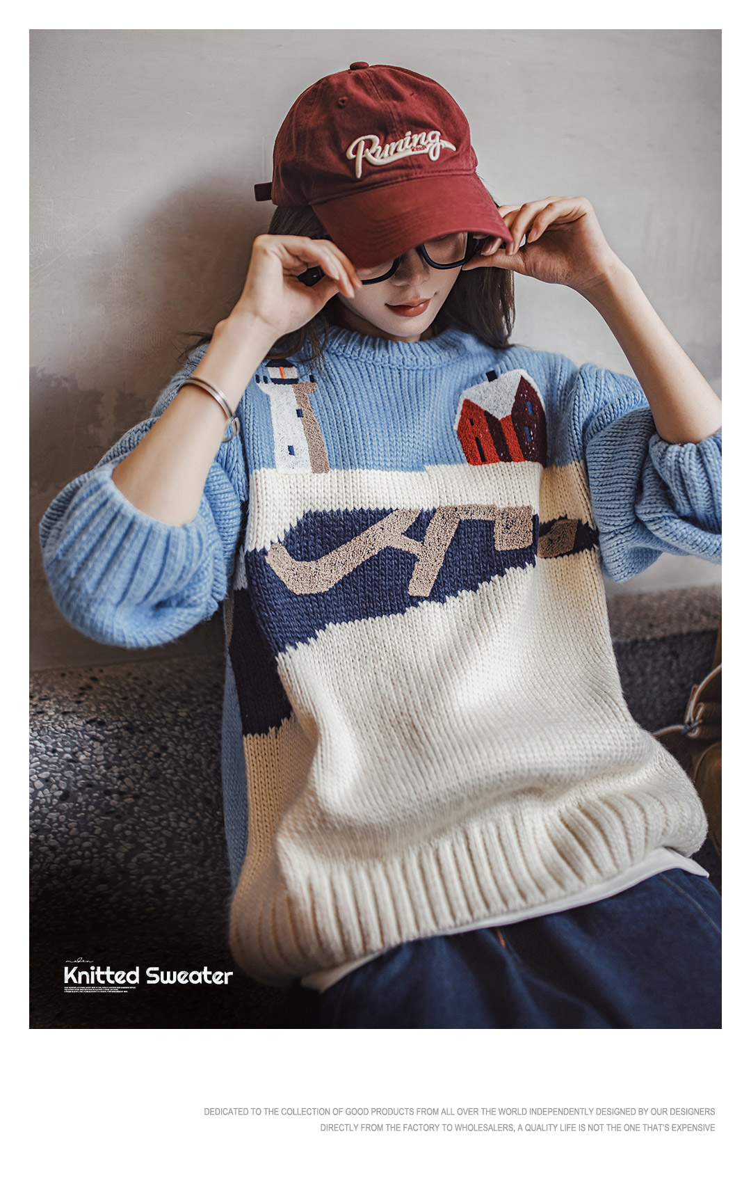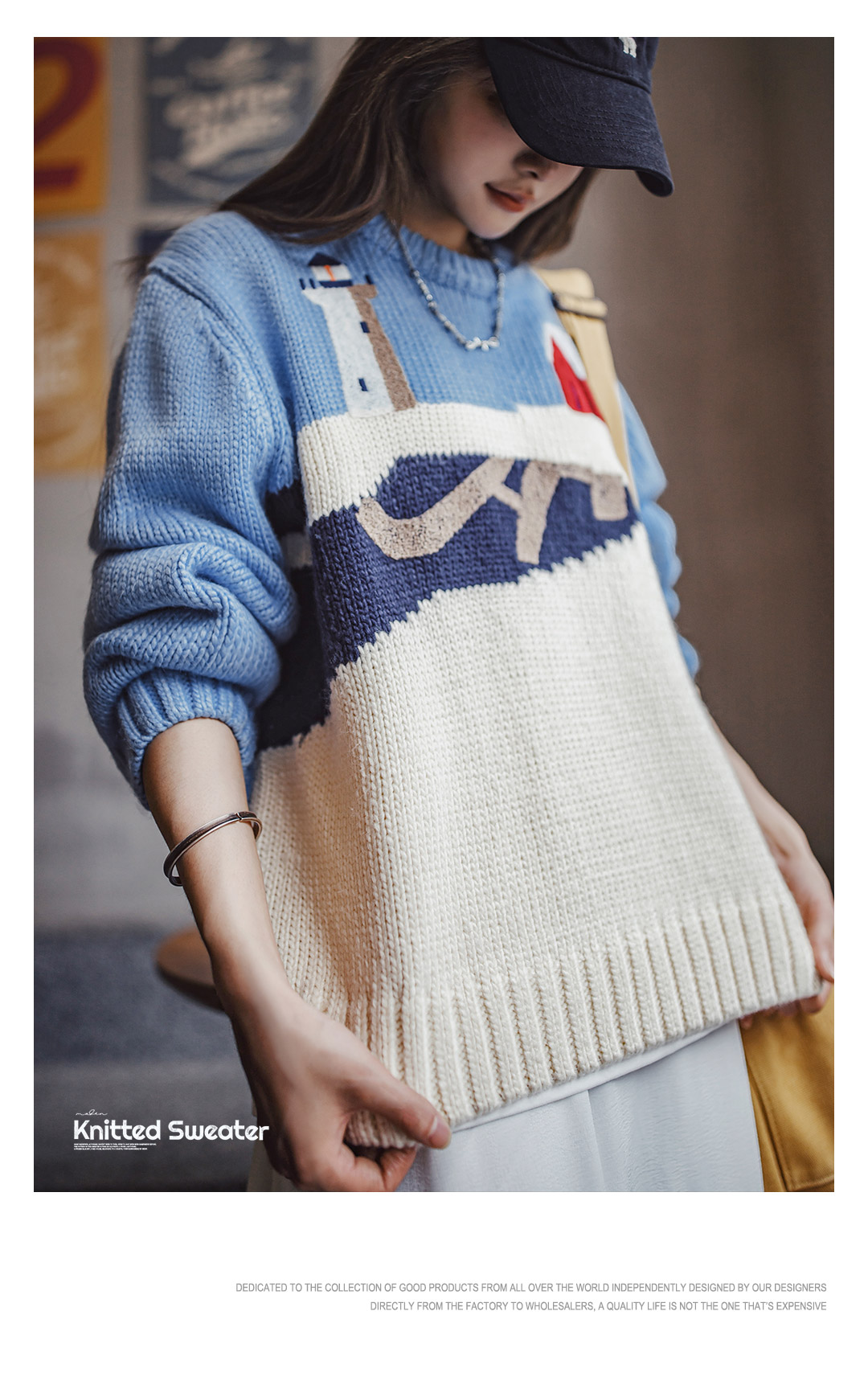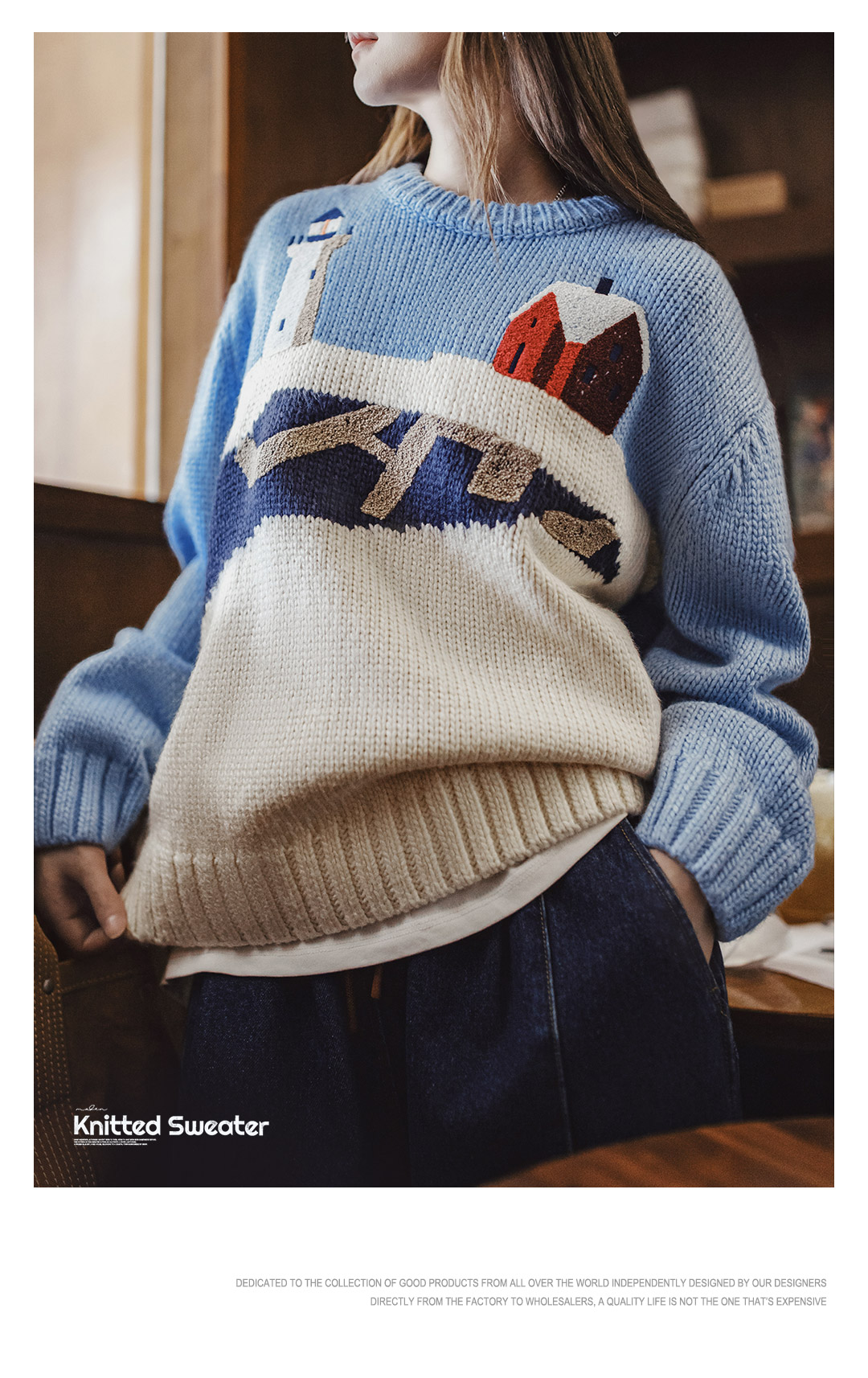 马登复古圆领宽松加厚针织提花毛衣休闲保暖外穿粗毛线上衣秋冬女