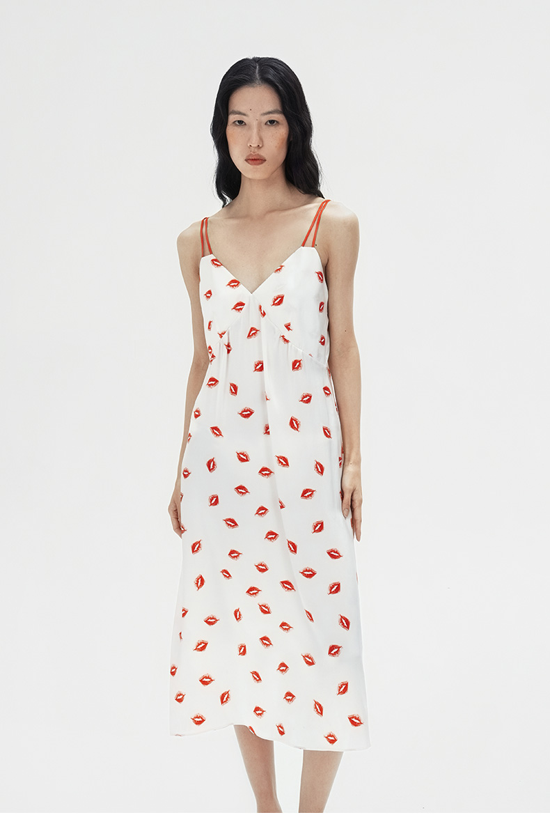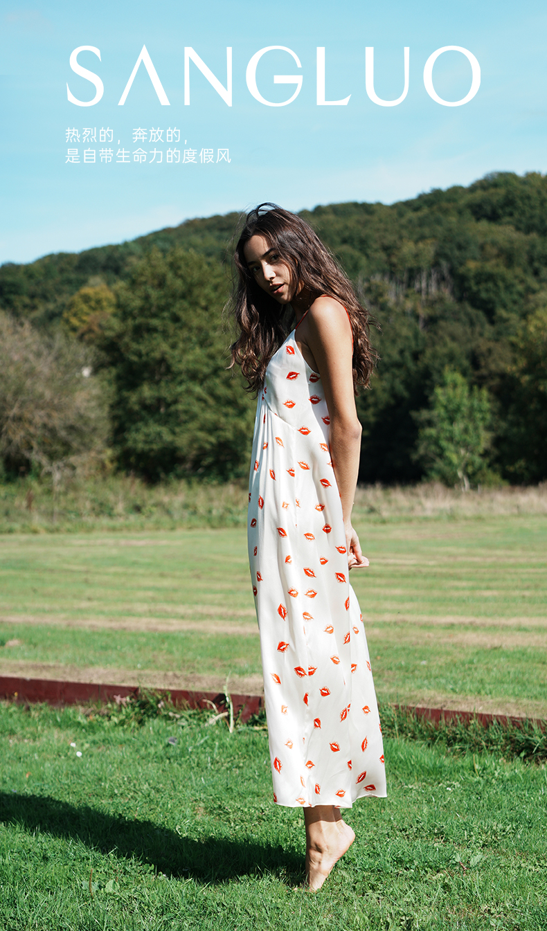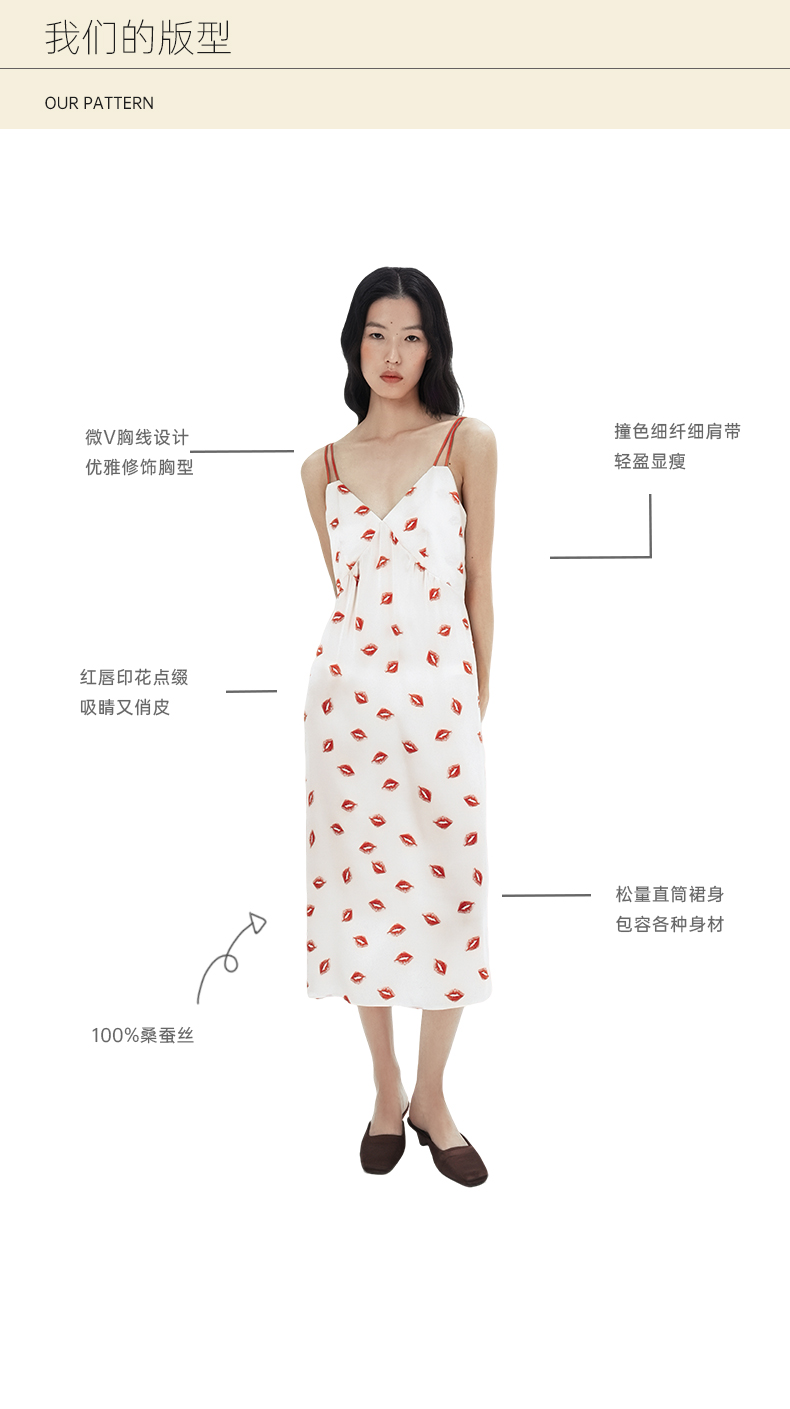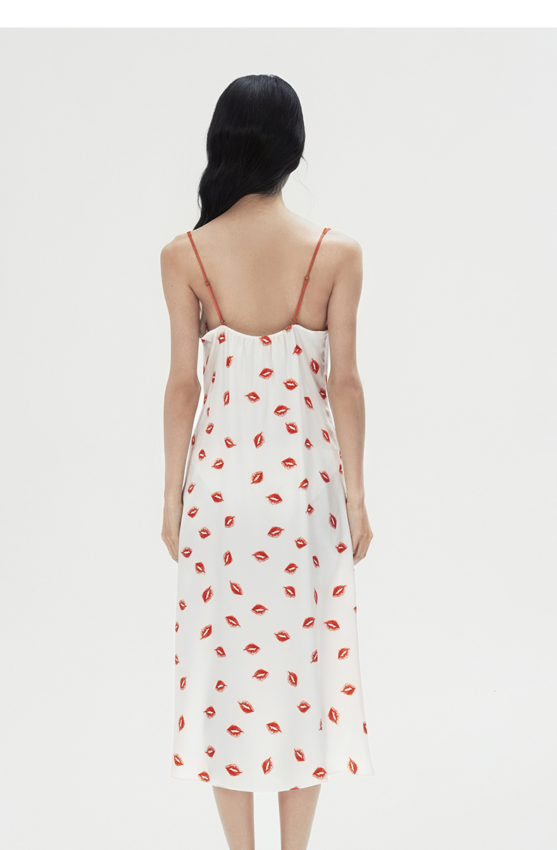 桑罗V领真丝红唇印花连衣裙100%桑蚕丝女细带吊带长裙套装可选