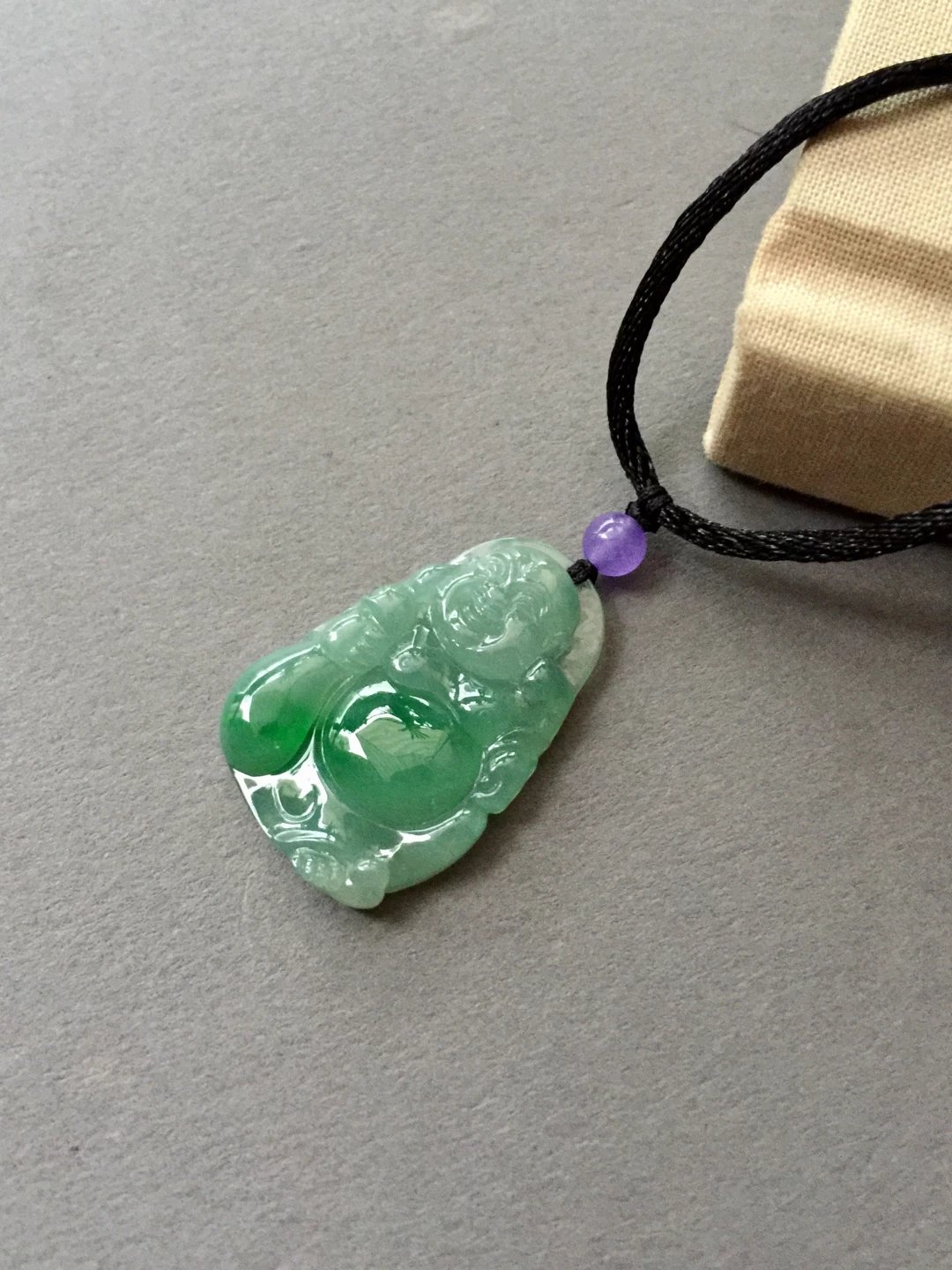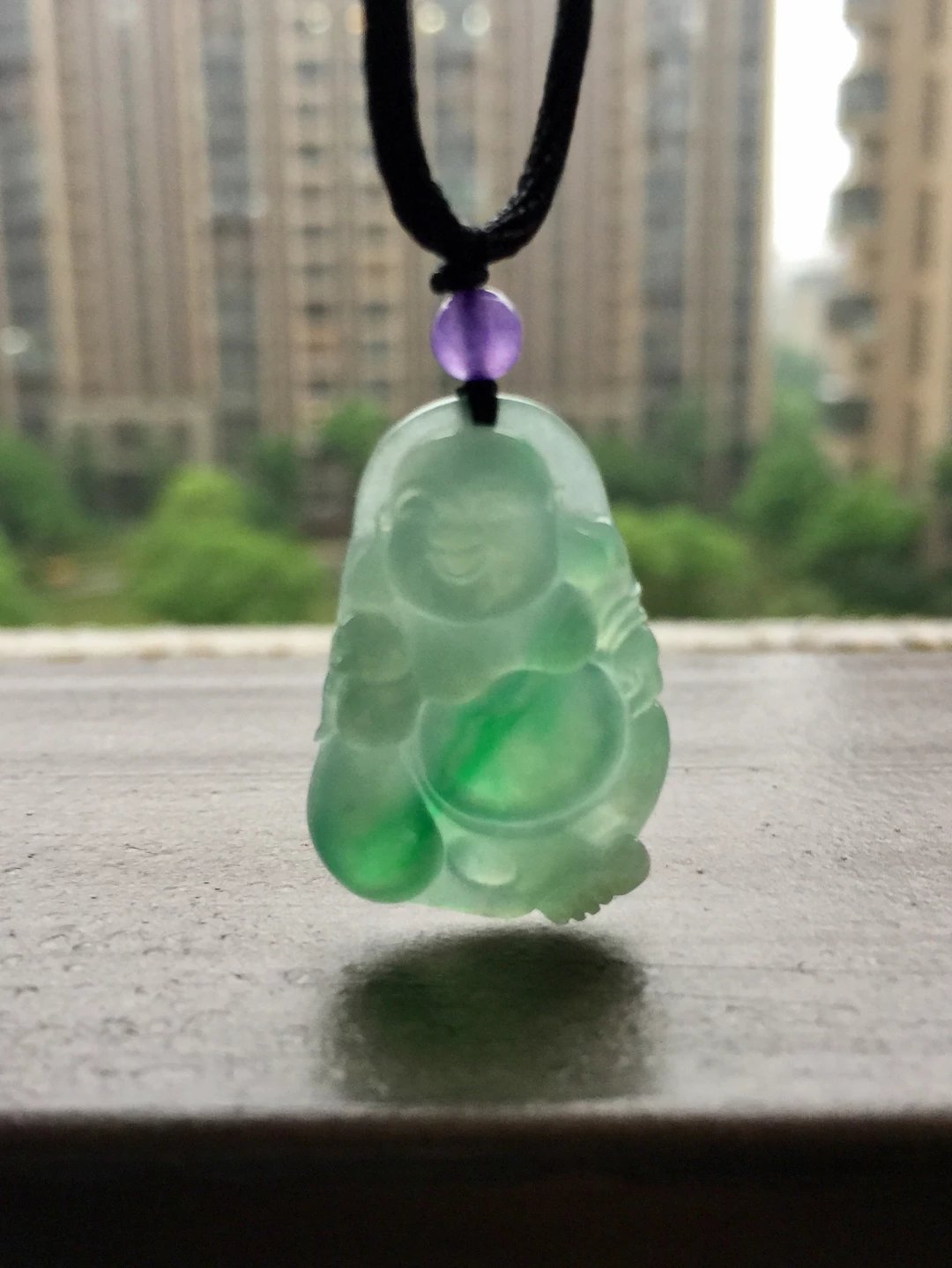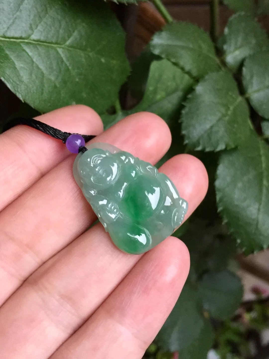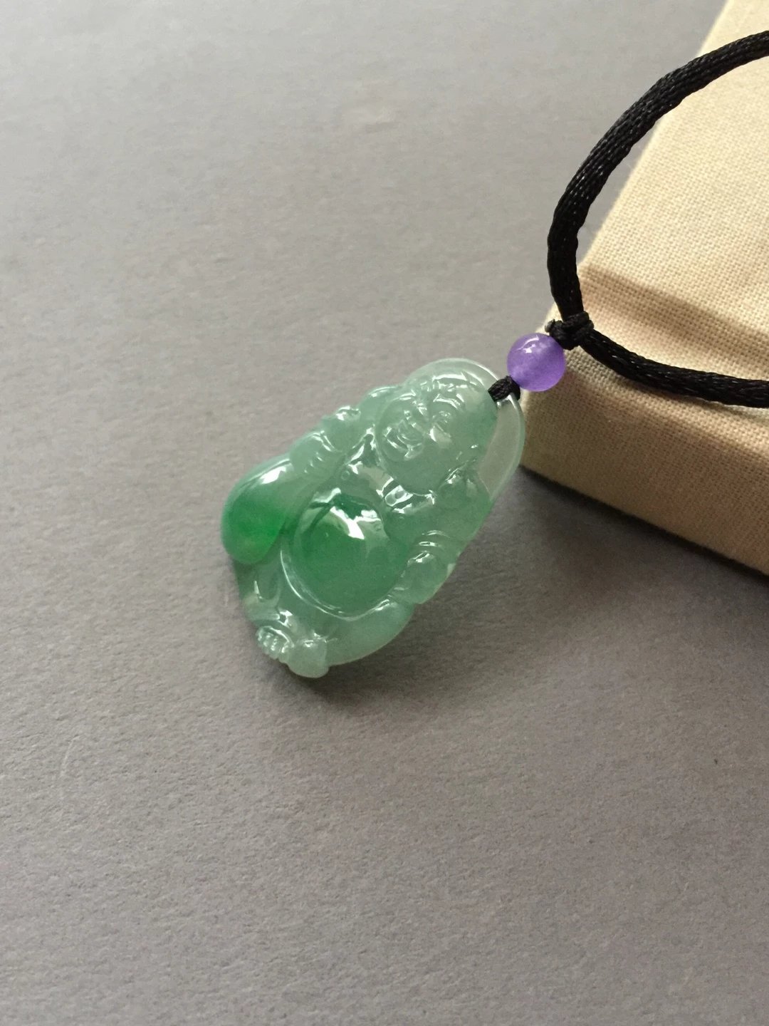 翡翠冰种阳绿逍遥佛,28.5×19.4×5.5mm,种水清透,雕工精美,细节刻画生动,阳绿艳丽,俏色位置佳,佩戴弥勒佛保平安