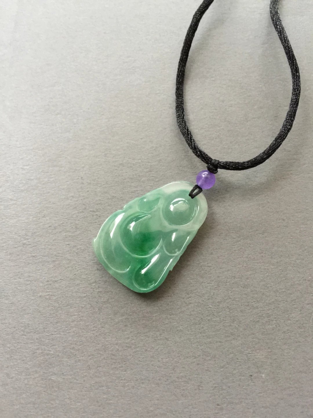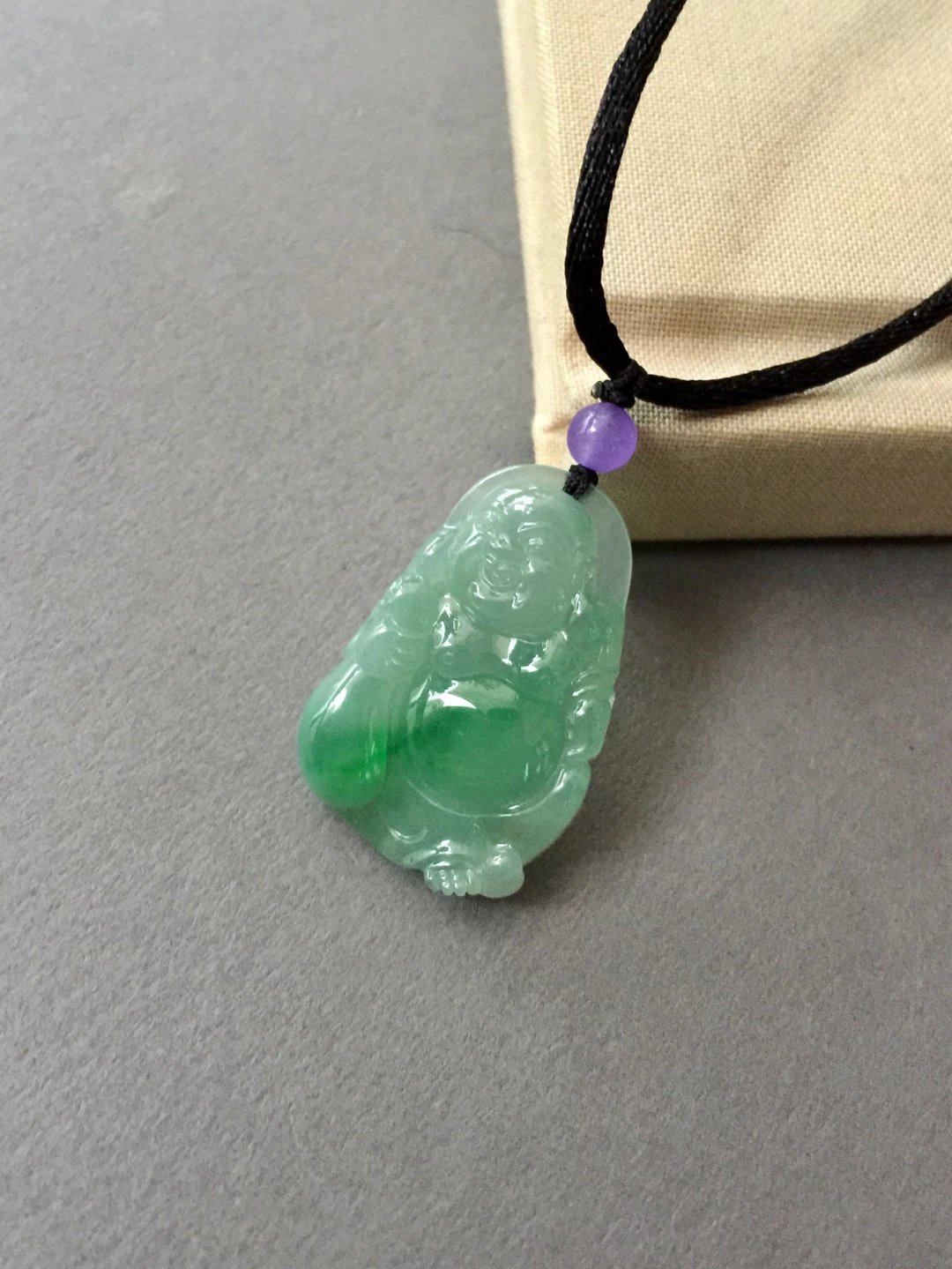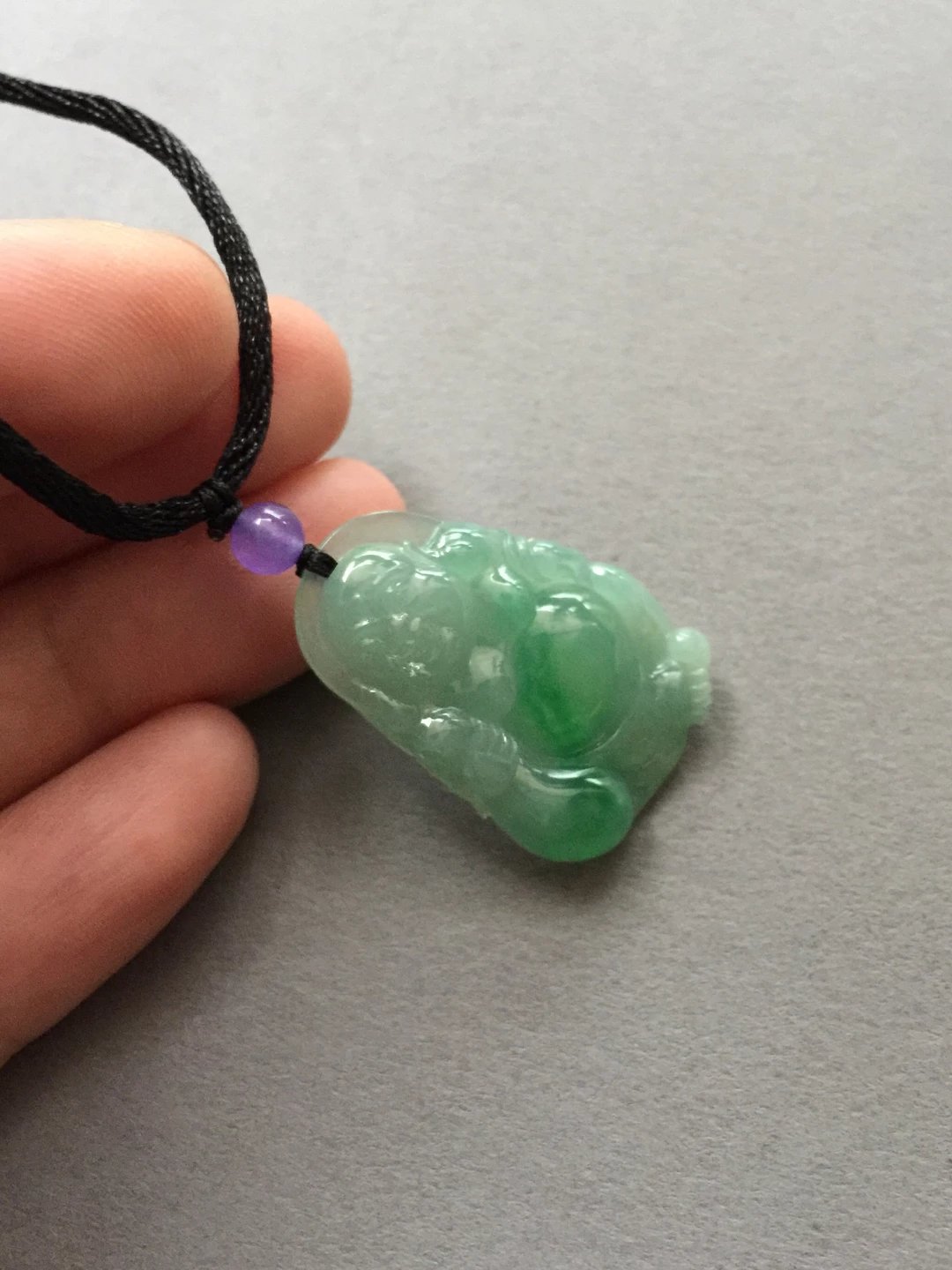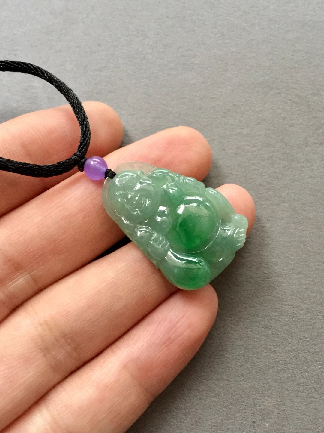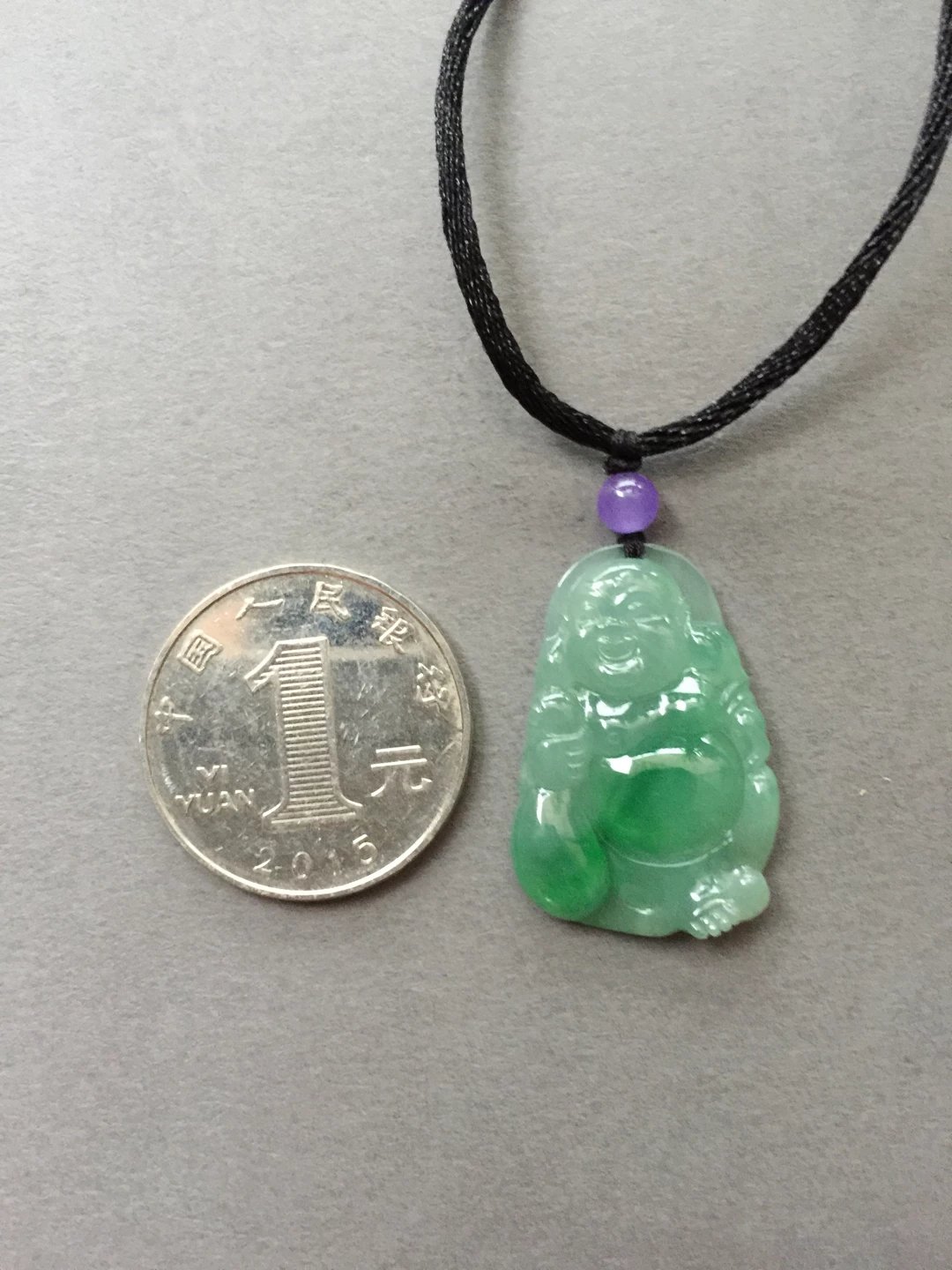 翡翠冰种阳绿逍遥佛,28.5×19.4×5.5mm,种水清透,雕工精美,细节刻画生动,阳绿艳丽,俏色位置佳,佩戴弥勒佛保平安