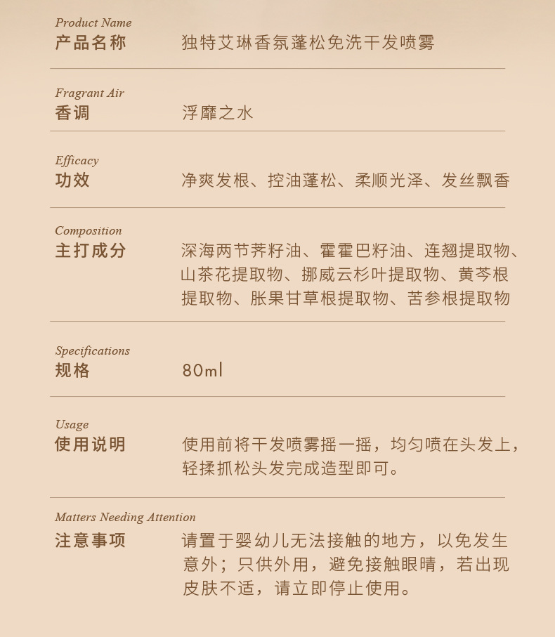 【蓬松高颅顶】独特艾琳干发喷雾去油蓬松不粘腻高颅顶80ml头发免洗清爽女懒人旅行装