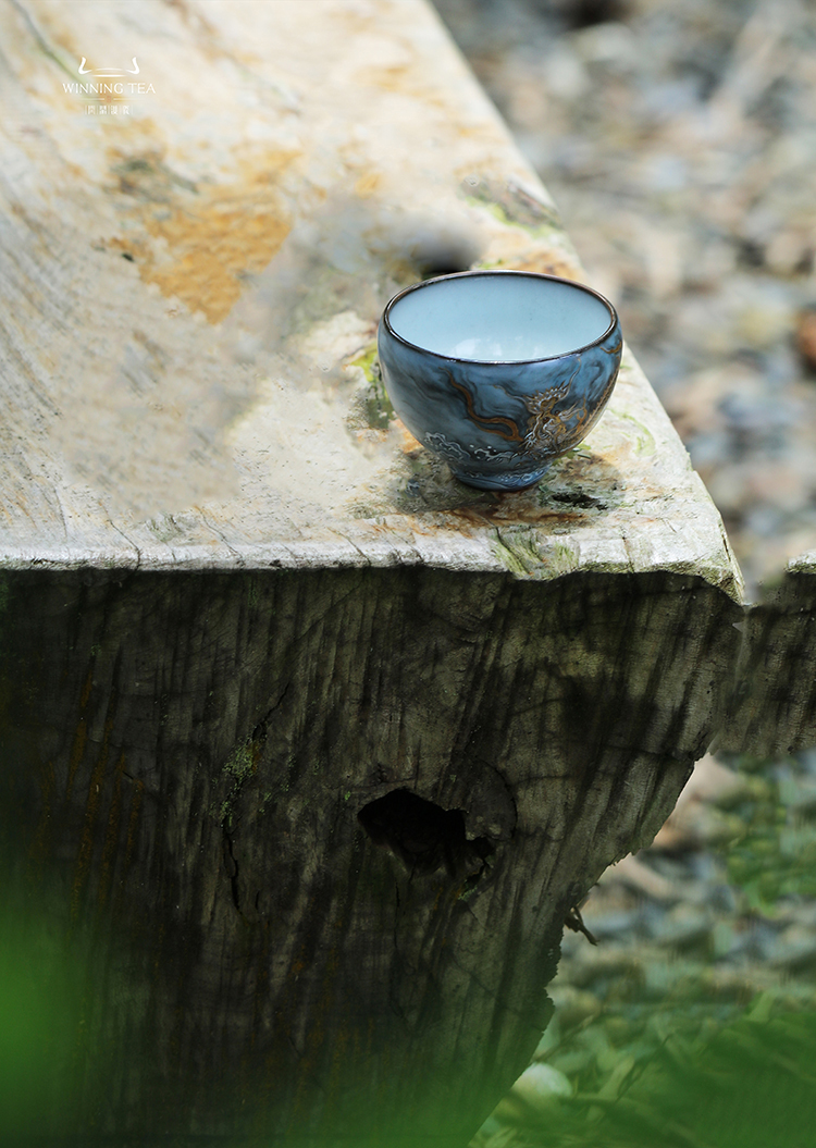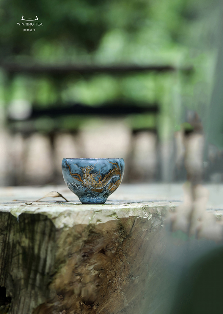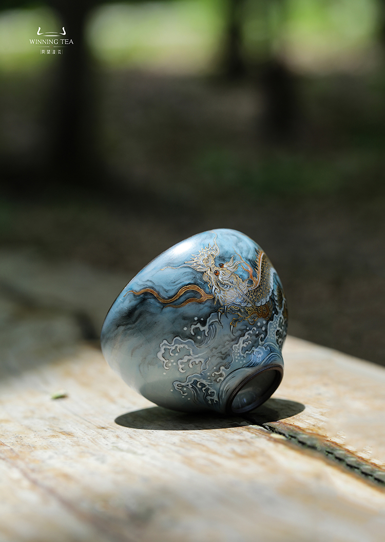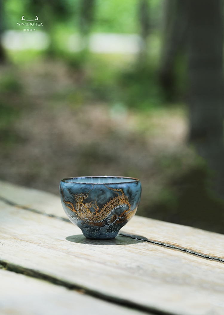 问鼎铁胎汝窑韶秀杯(小)(墨彩描金龙纹)