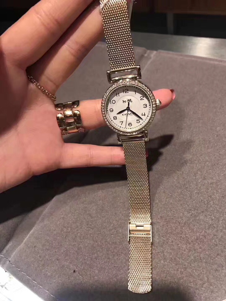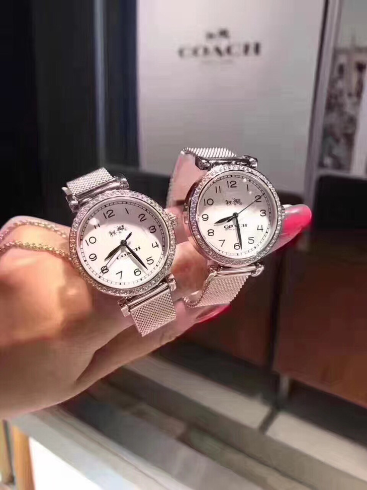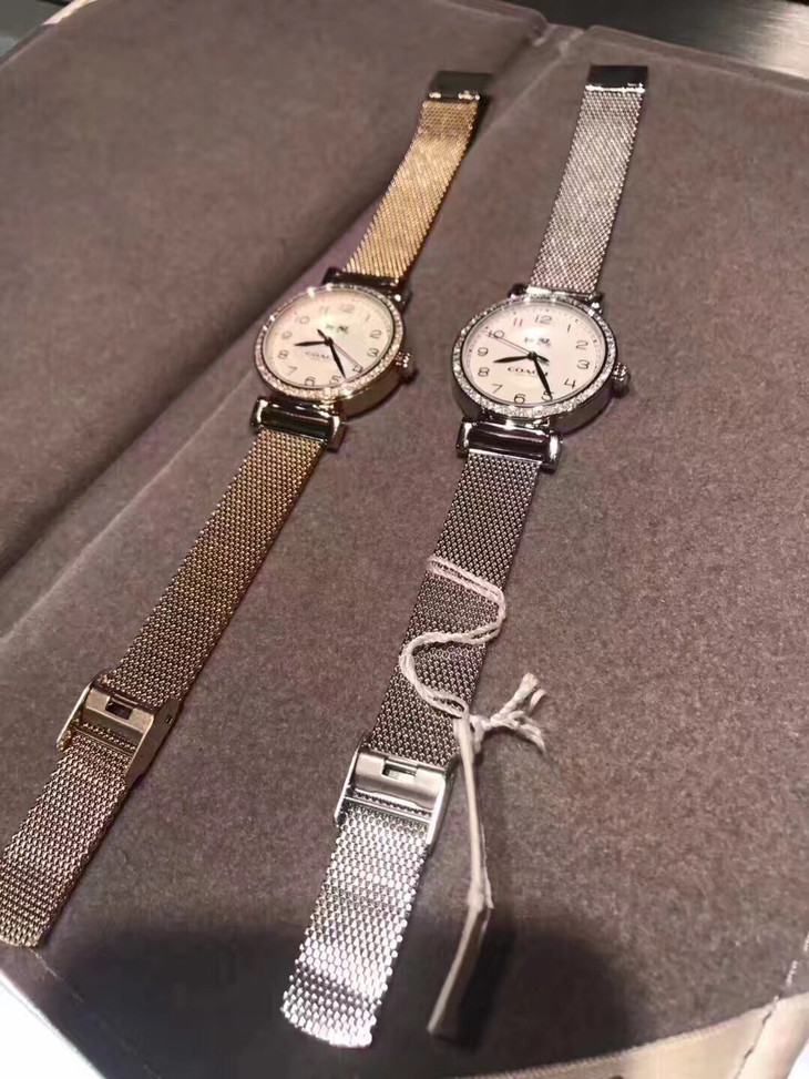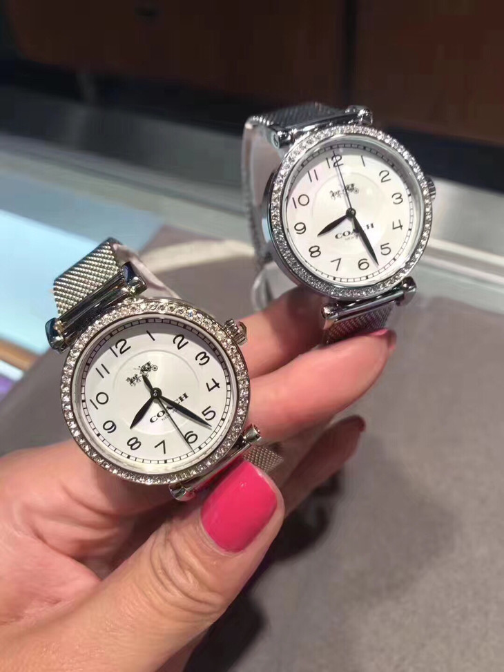 coach海报款手表打折了,机芯是MOVADO,麦迪逊镶嵌水钻系列女表,完美的抛光效果,精钢,表盘大小约32毫米,表盘厚度约9毫米,矿物水晶玻璃防刮镜面,防水深度达30米,金色、银色可选,折后1599美国直邮到手