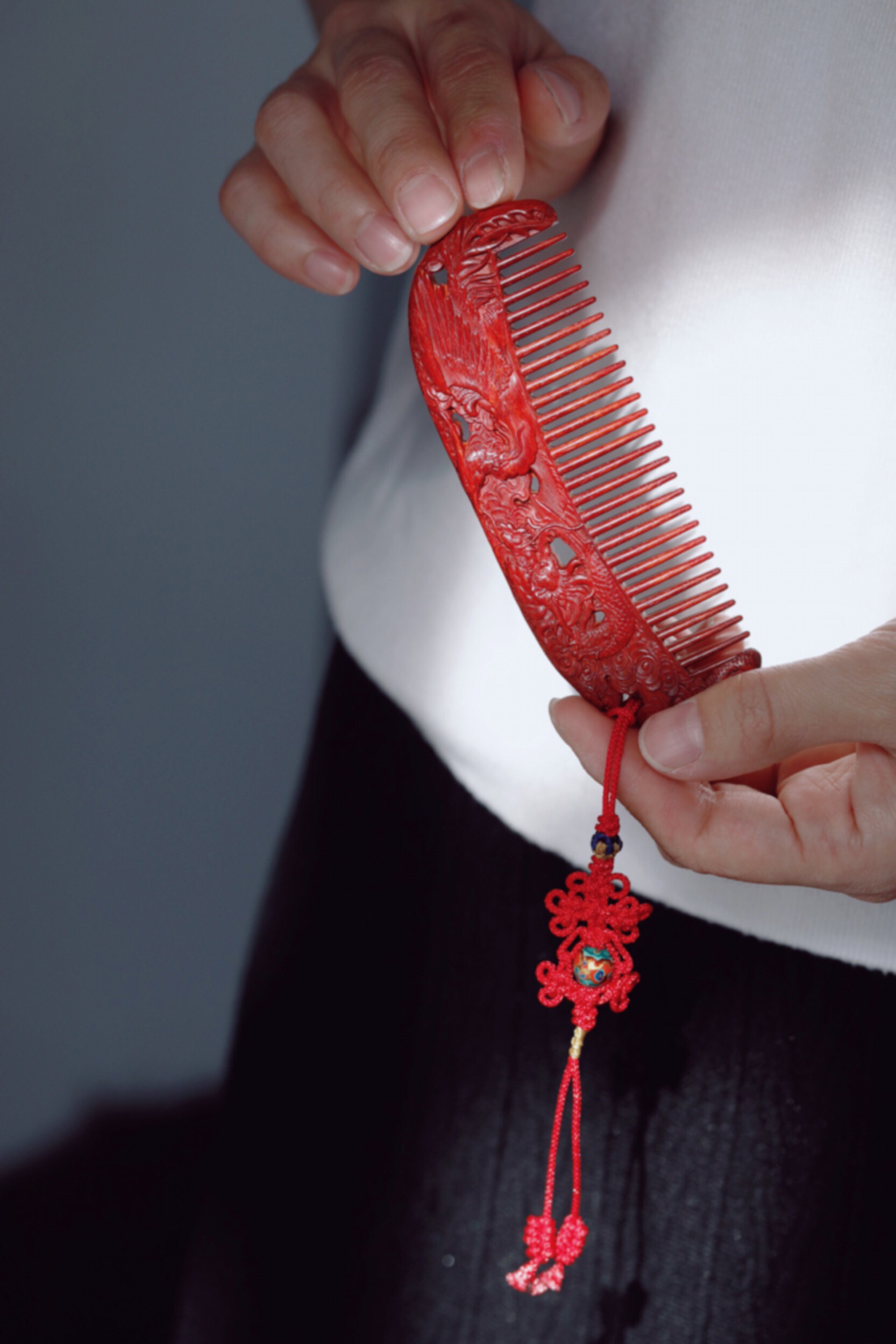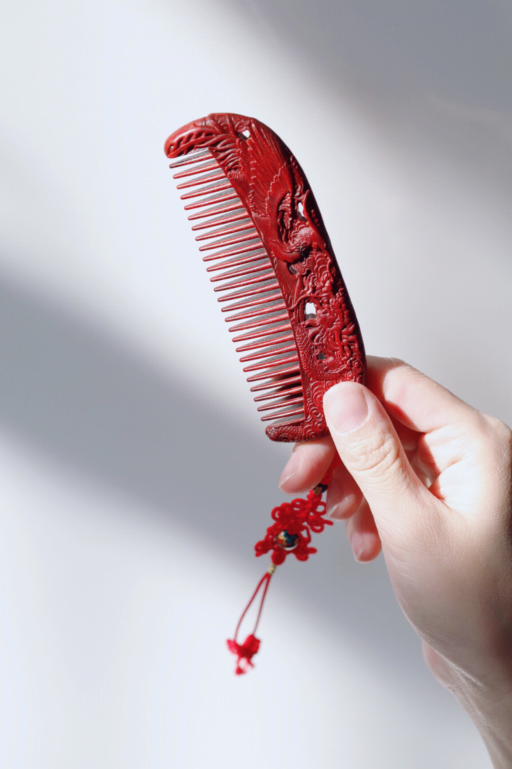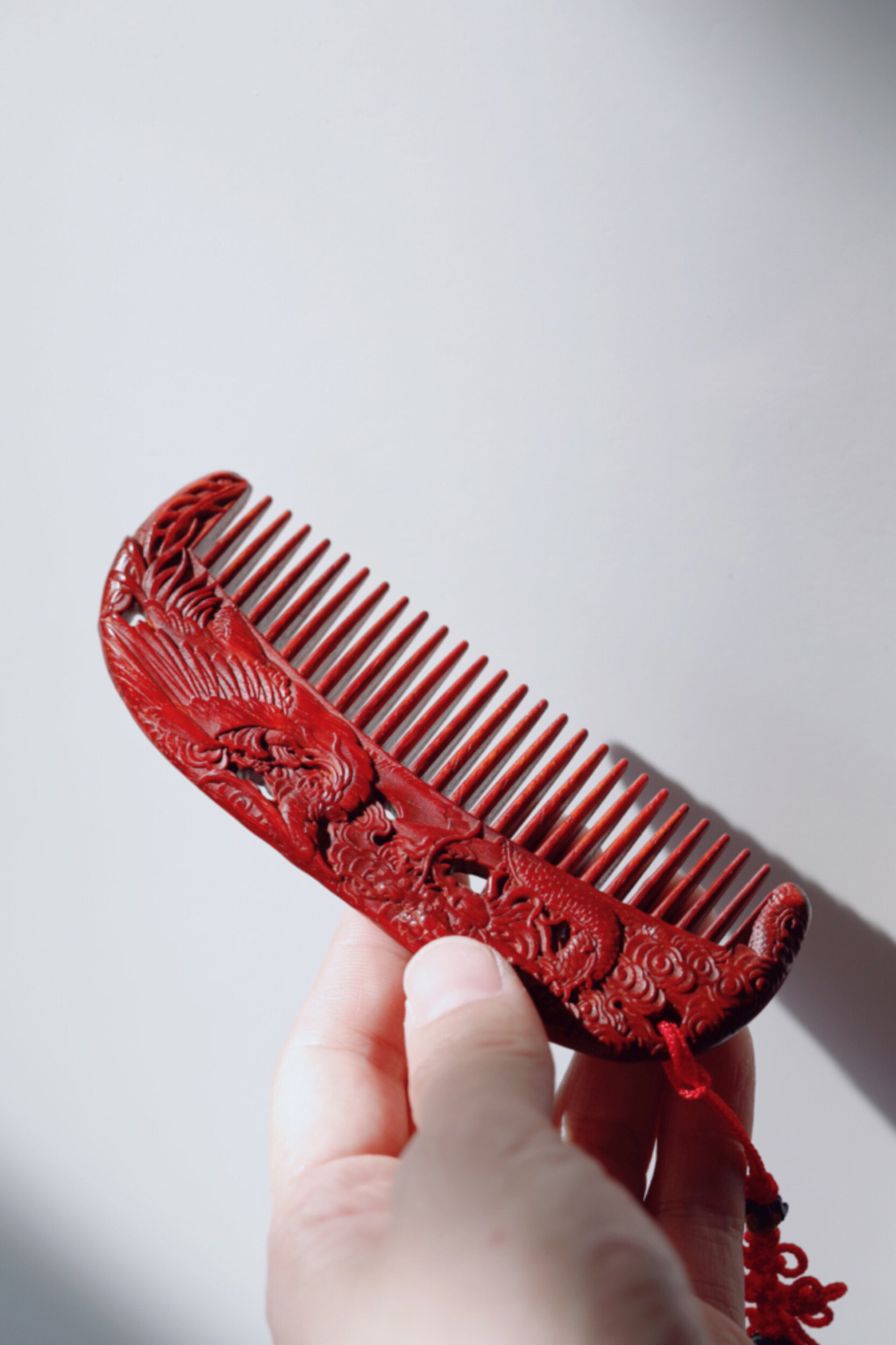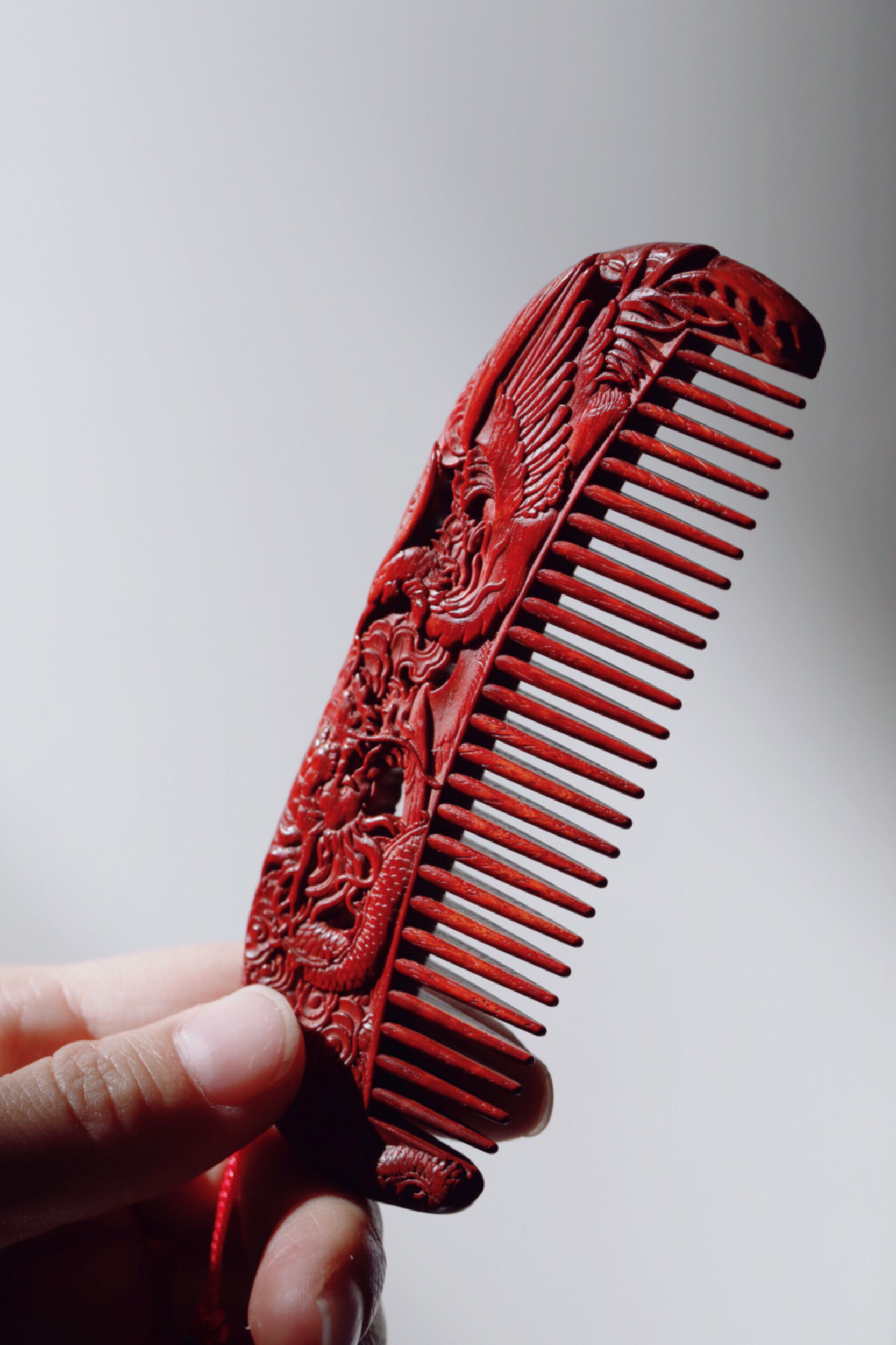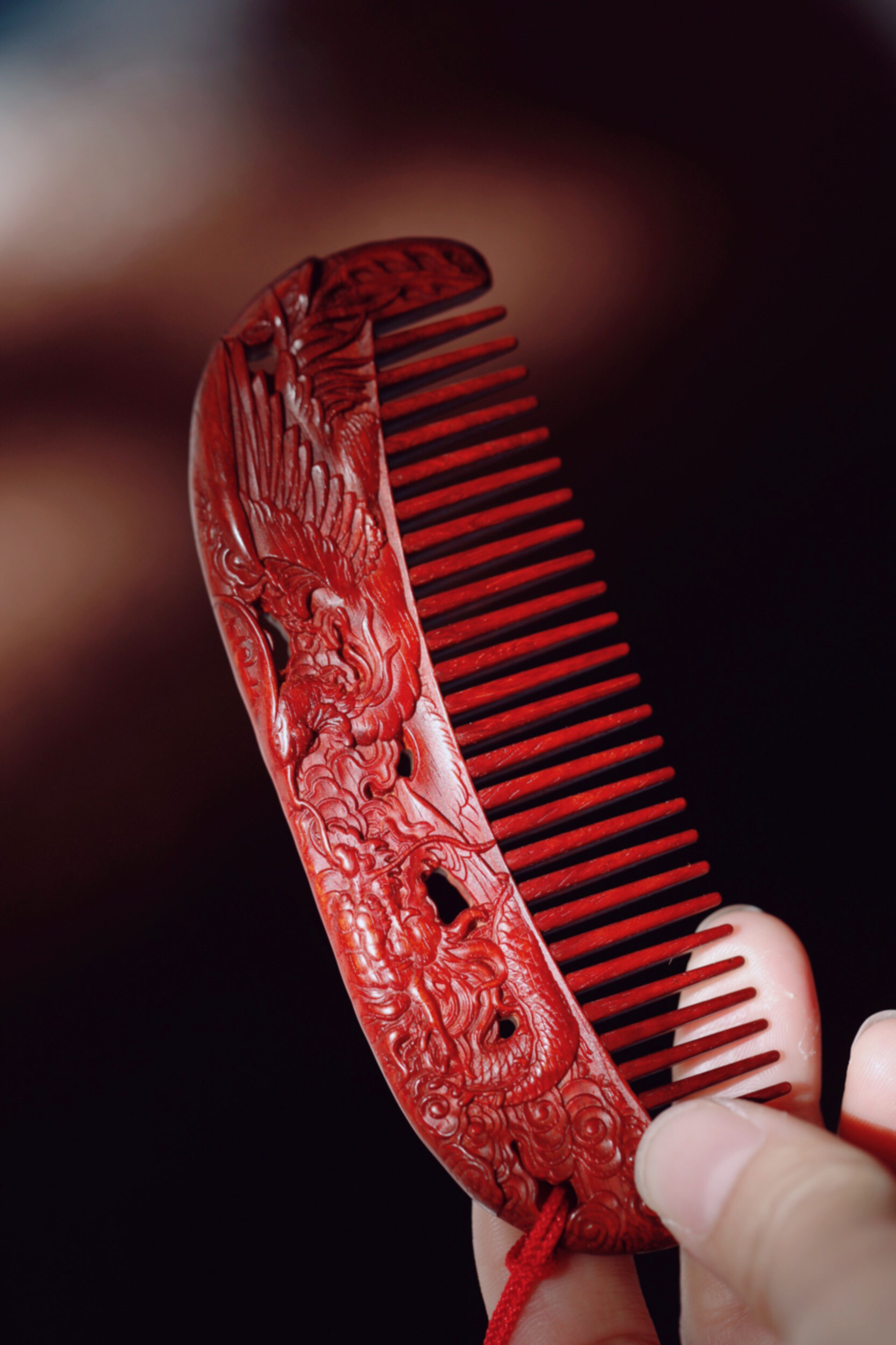 宝贝精选了优质的小叶紫檀料制作而成,颜色润泽,底色干净,纹理清晰,油性好。最大的特点在于龙凤呈祥的雕刻,精细漂亮,颜值很高。木梳品相好,很有尊贵感,日常把玩送给心爱的人都不错,价格划算!