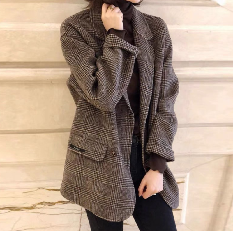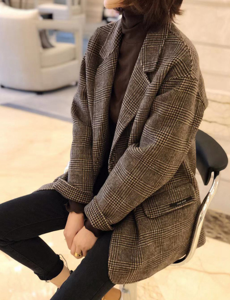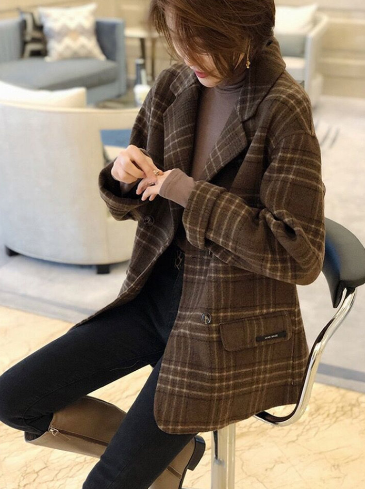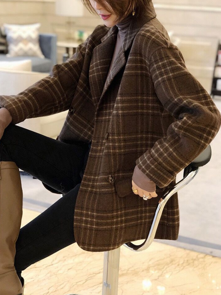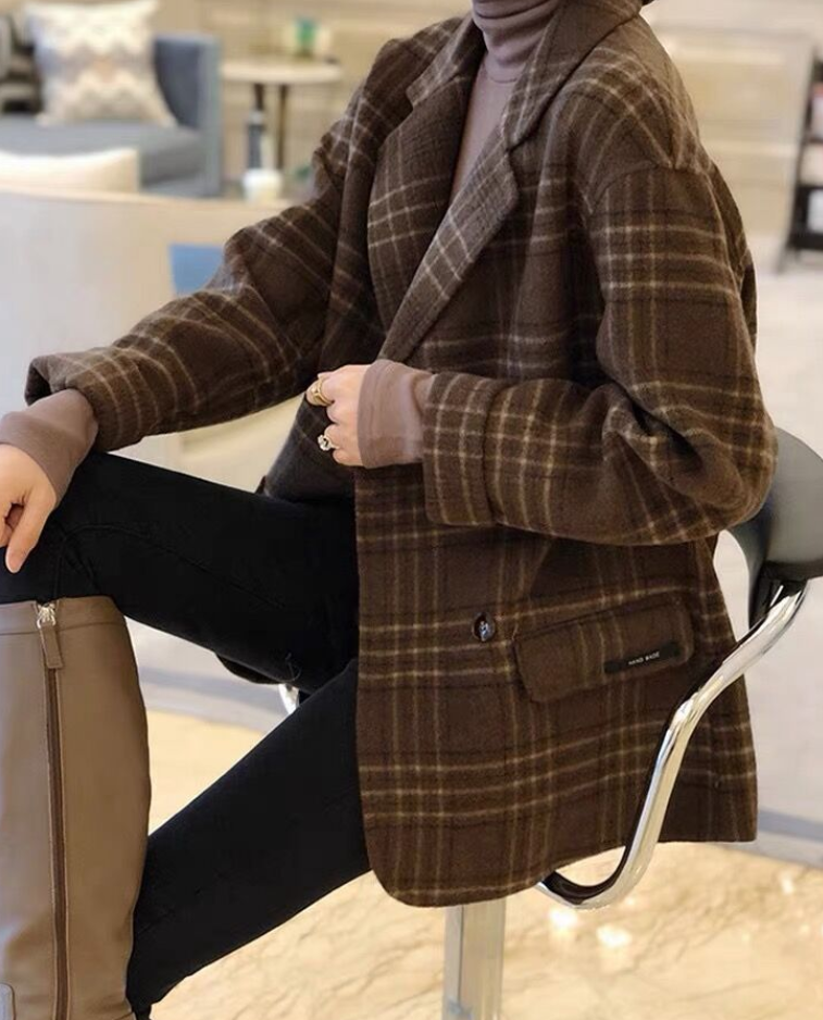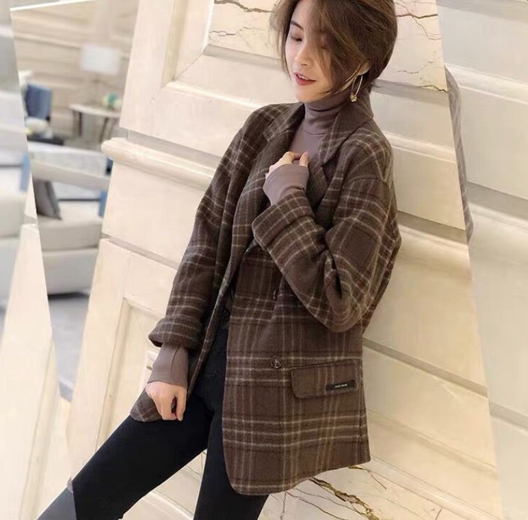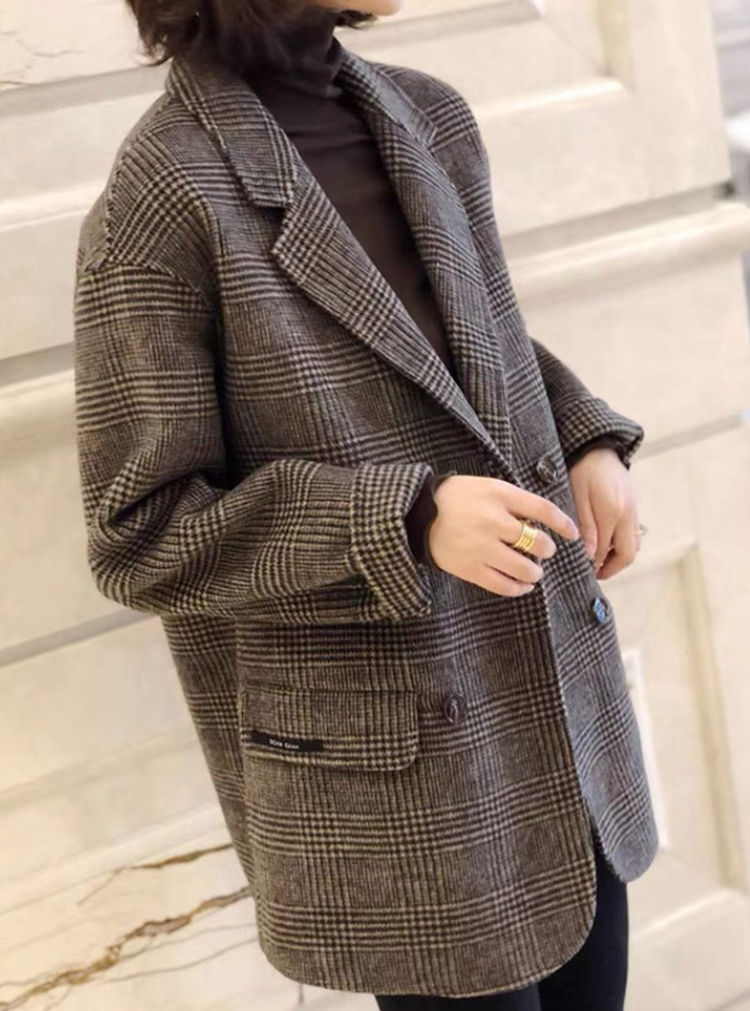 【服饰鞋包】秋冬季双面羊绒复古宽松小西装格子中长款毛呢外套
