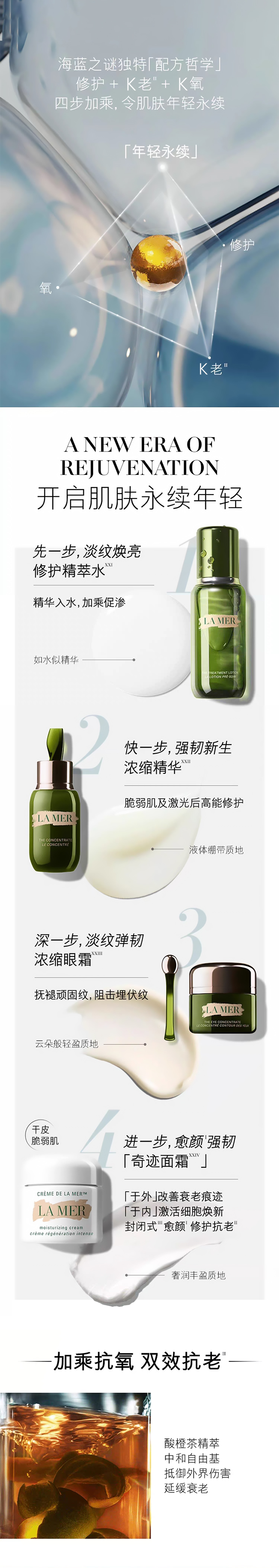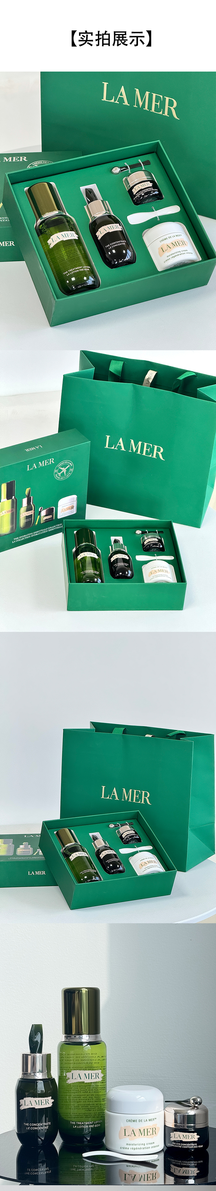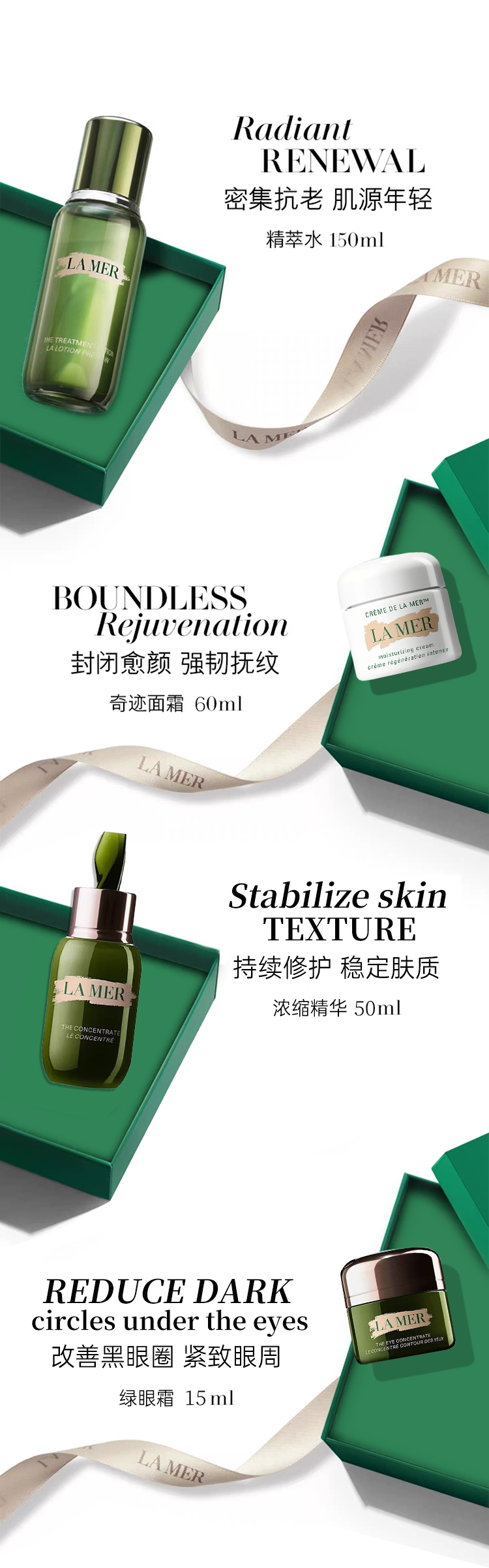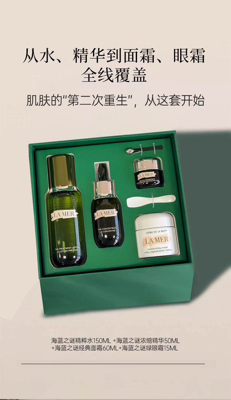 规格:(海蓝之谜精粹水150ml +海蓝之谜浓缩精华50ml +海蓝之谜经典面霜60ml+海蓝之谜绿眼霜15ml)