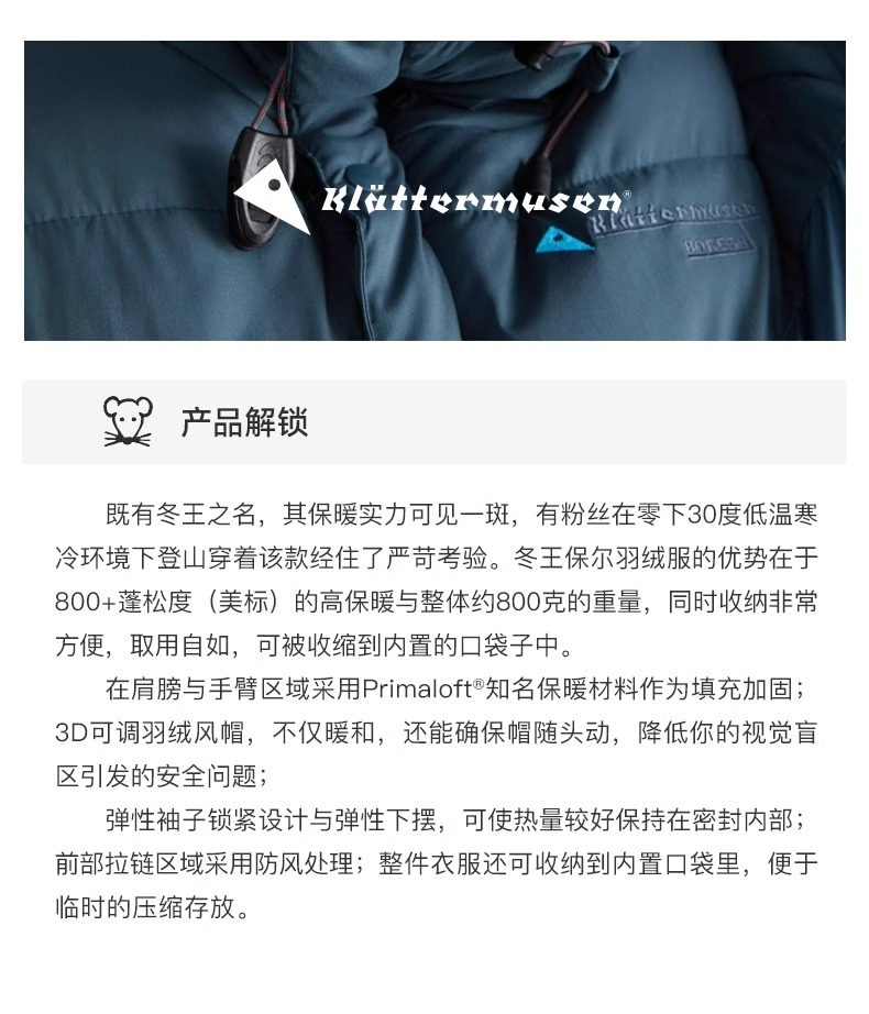 KLATTERMUSEN/攀山鼠冬王保尔男女款白鹅绒羽绒服加厚防寒10337
