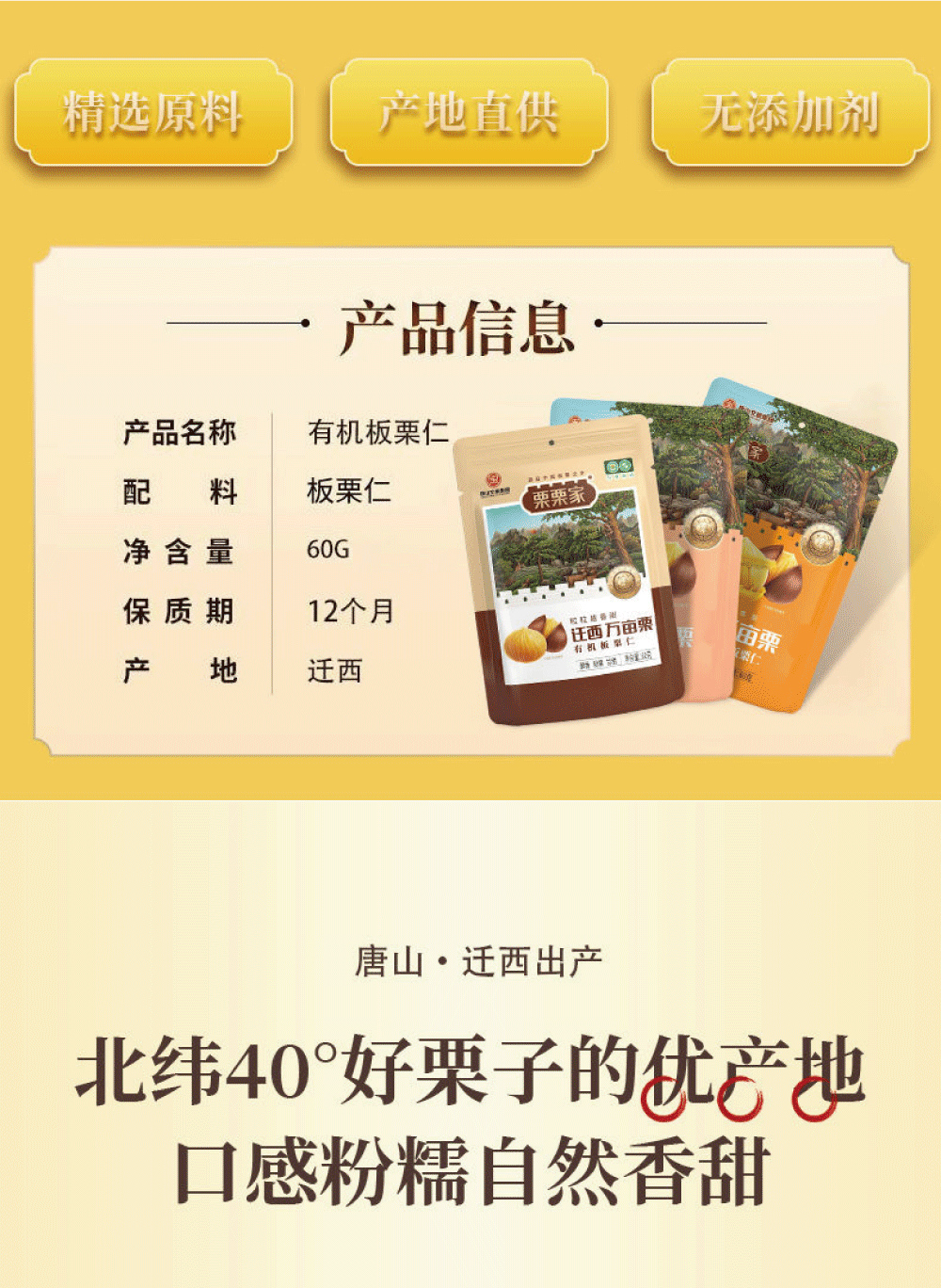 【品名】栗栗家 有机板栗仁 香甜软糯 原滋原味 开袋即食 60g*10袋 【规格】60g*10袋 【产地】国内 【保质期】12个月 【发货包装】独立包装 【发货地】云南 【发货快递】中通、韵达、极兔随机发 【补邮费地区】新疆、西藏+17元/单 内蒙古+10元/单 【发货时效】48-72小时,周末节假日顺延 |
