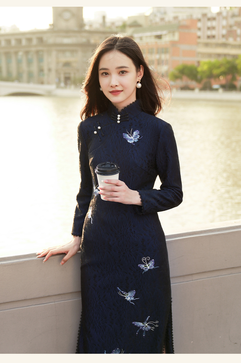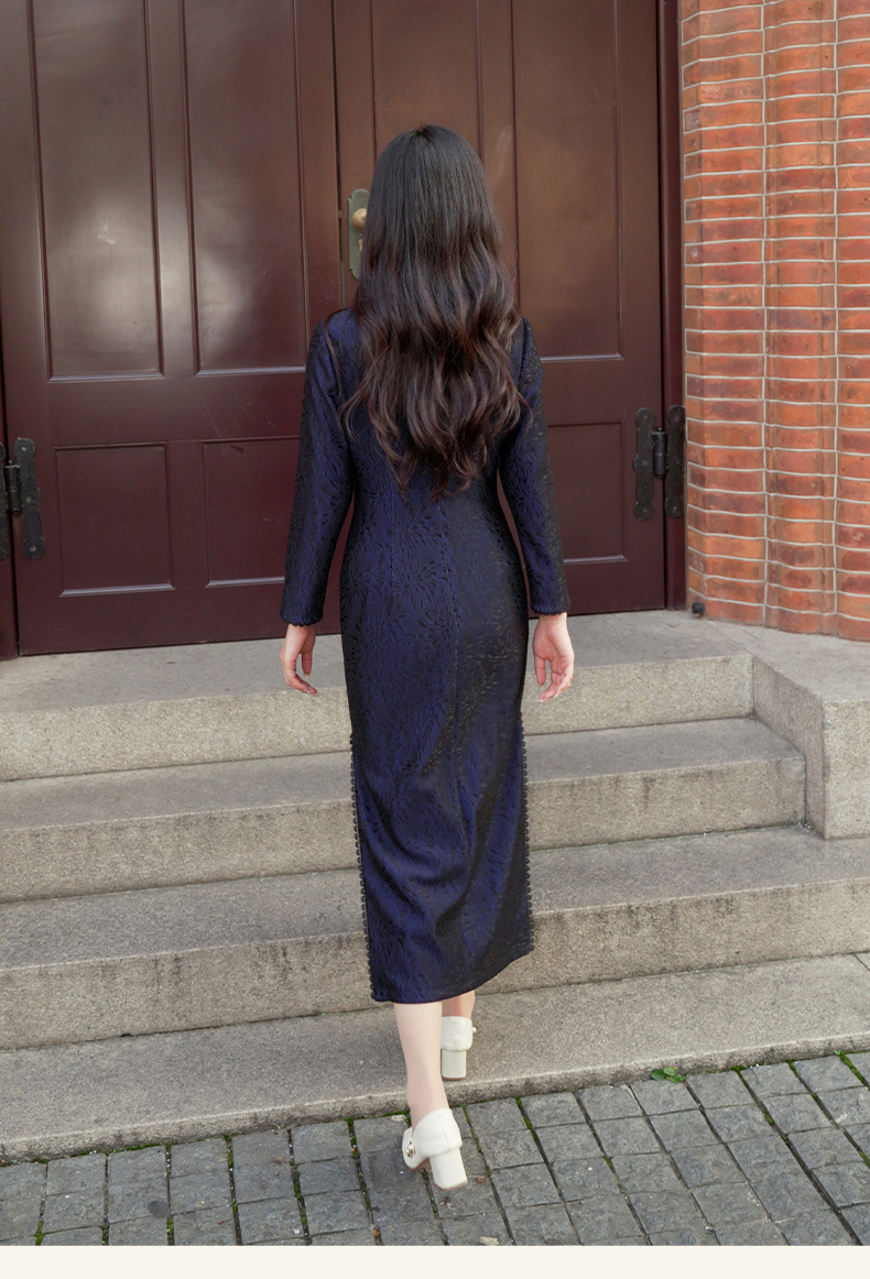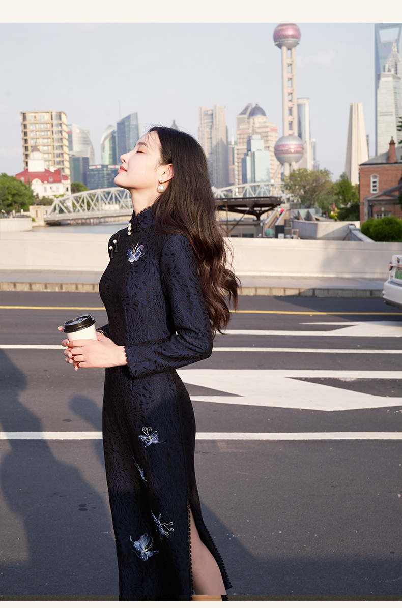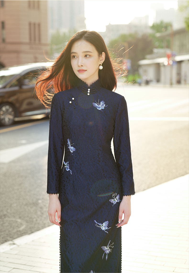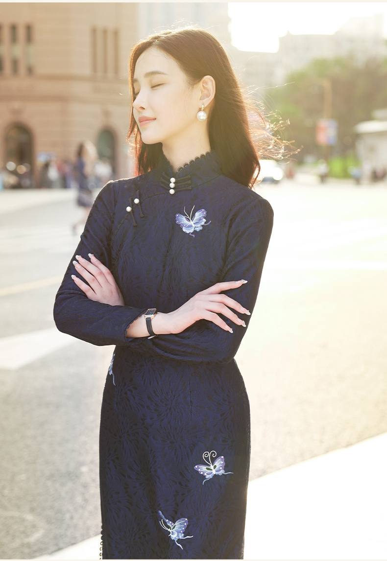 逸红颜青蝶2025年冬季新款弹力复合蕾丝旗袍改良版连衣裙女九分袖