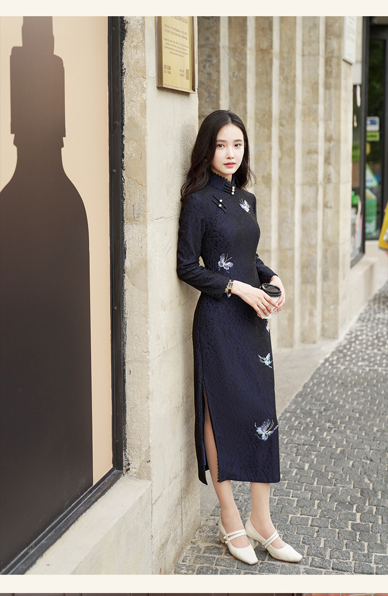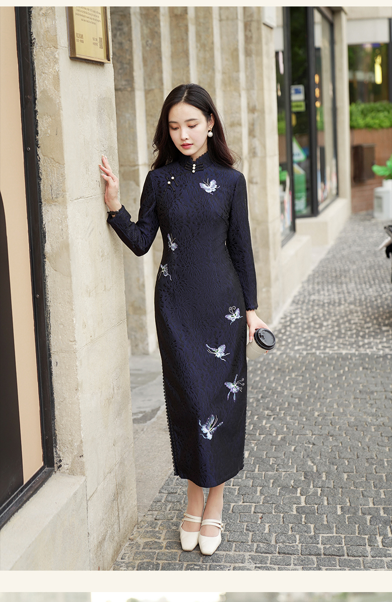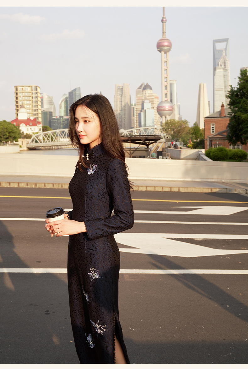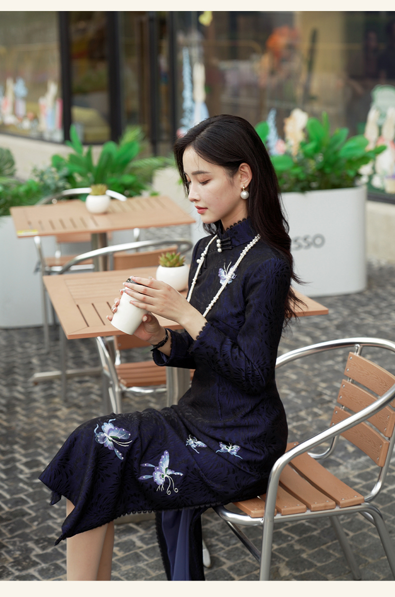 逸红颜青蝶2025年冬季新款弹力复合蕾丝旗袍改良版连衣裙女九分袖
