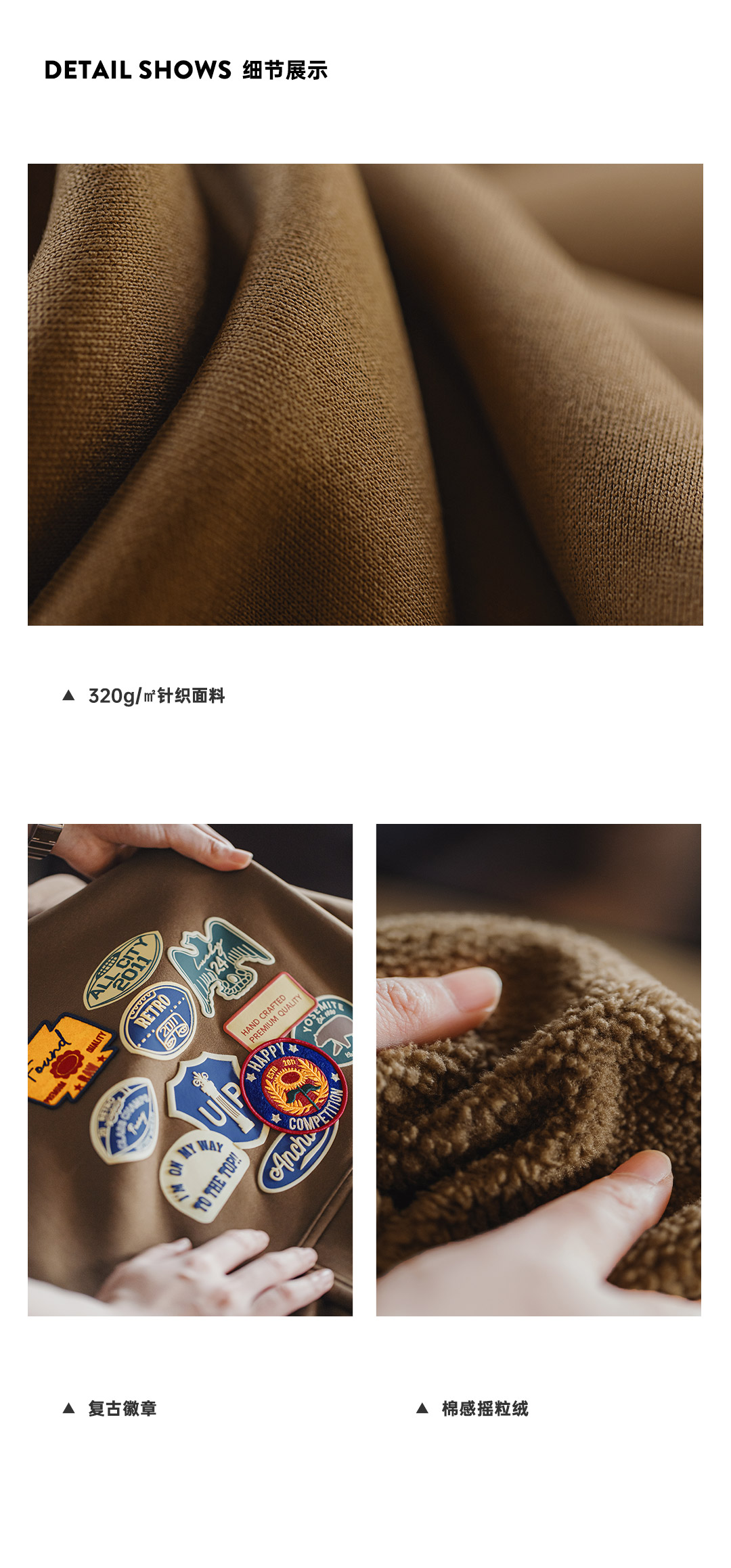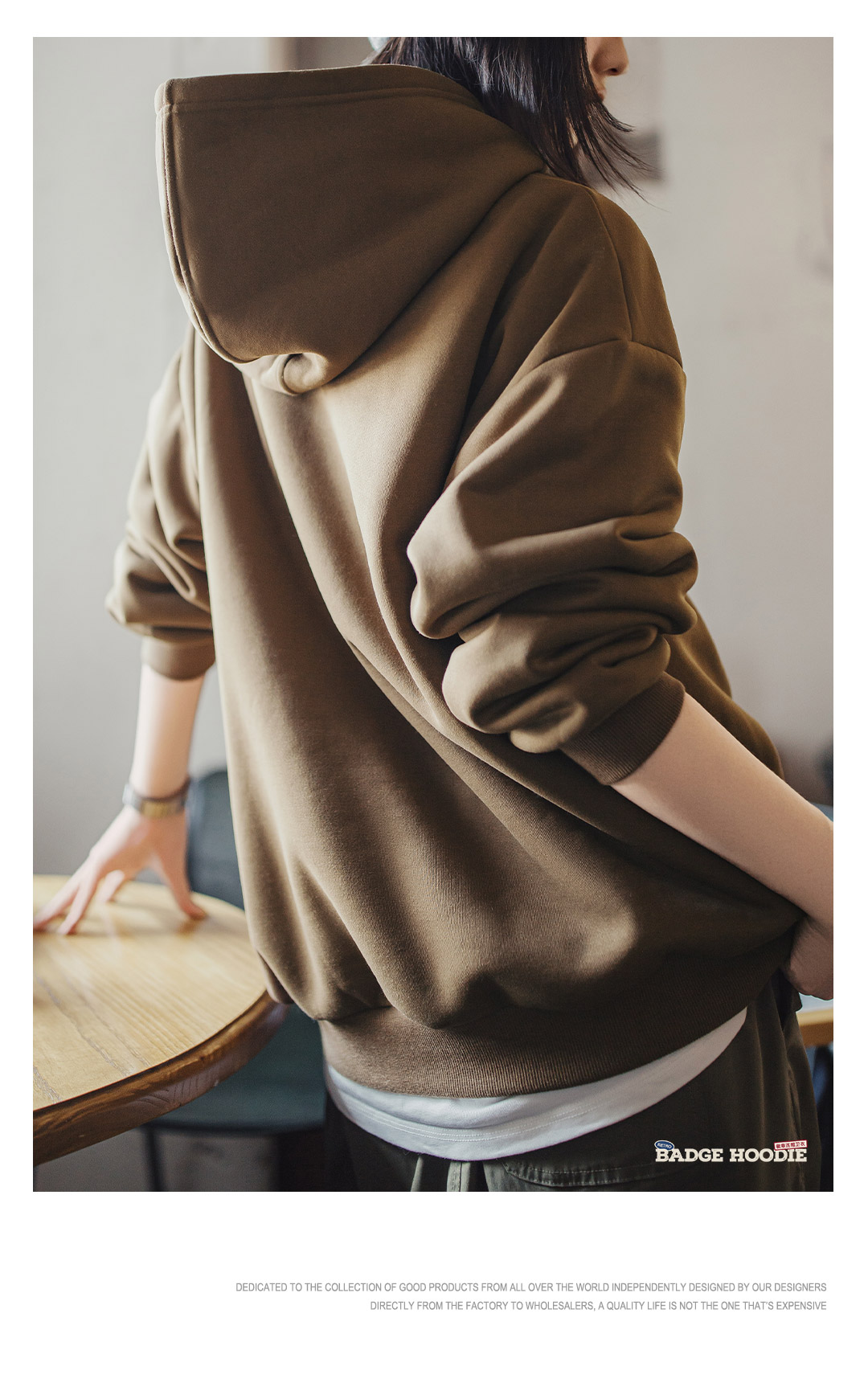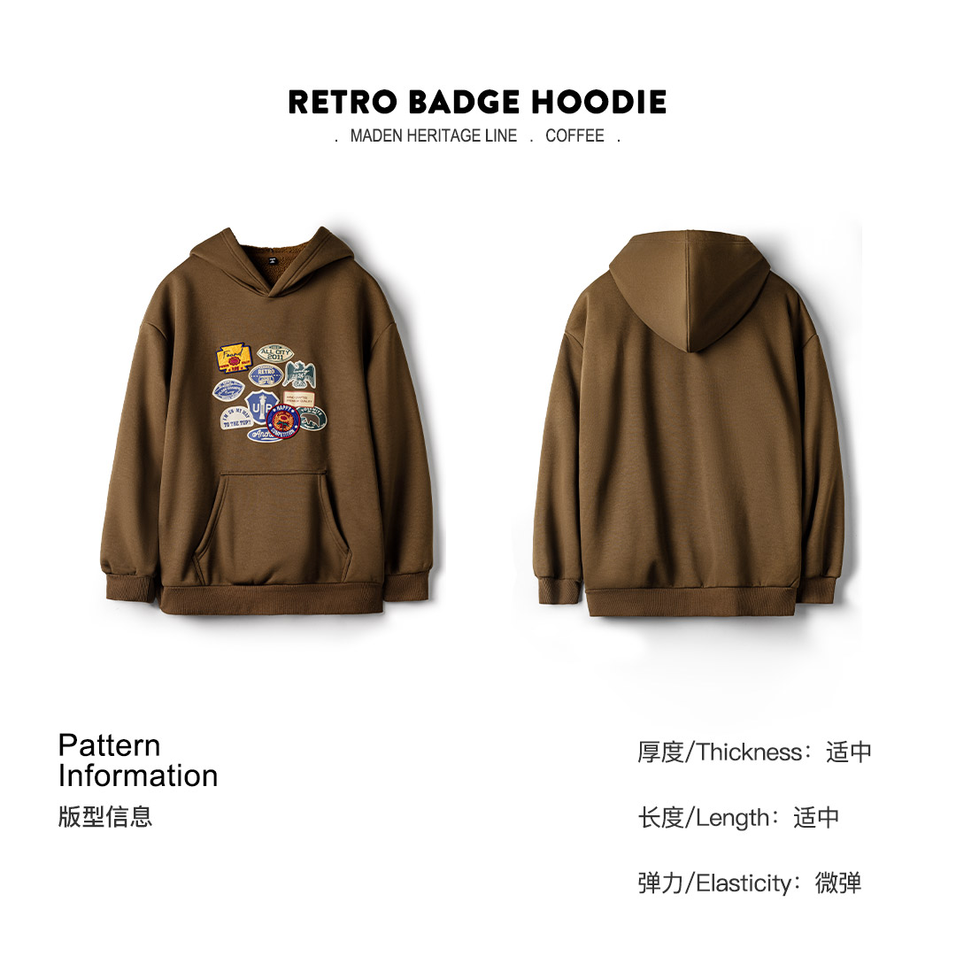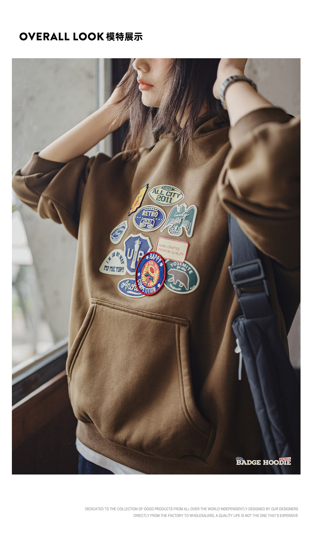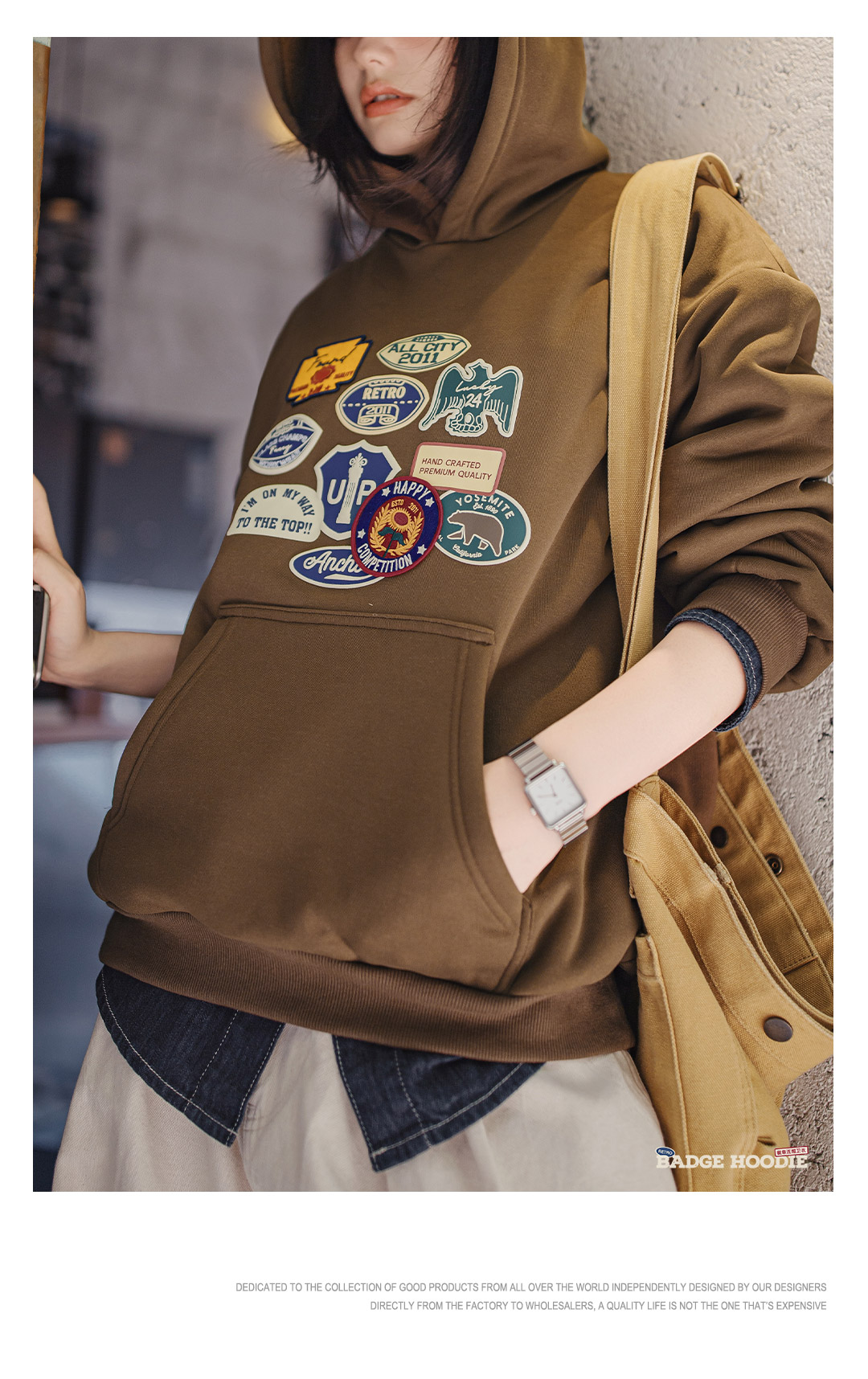 马登咖色美式重磅宽松摇粒绒加绒加厚徽章套头连帽衫卫衣女士秋冬